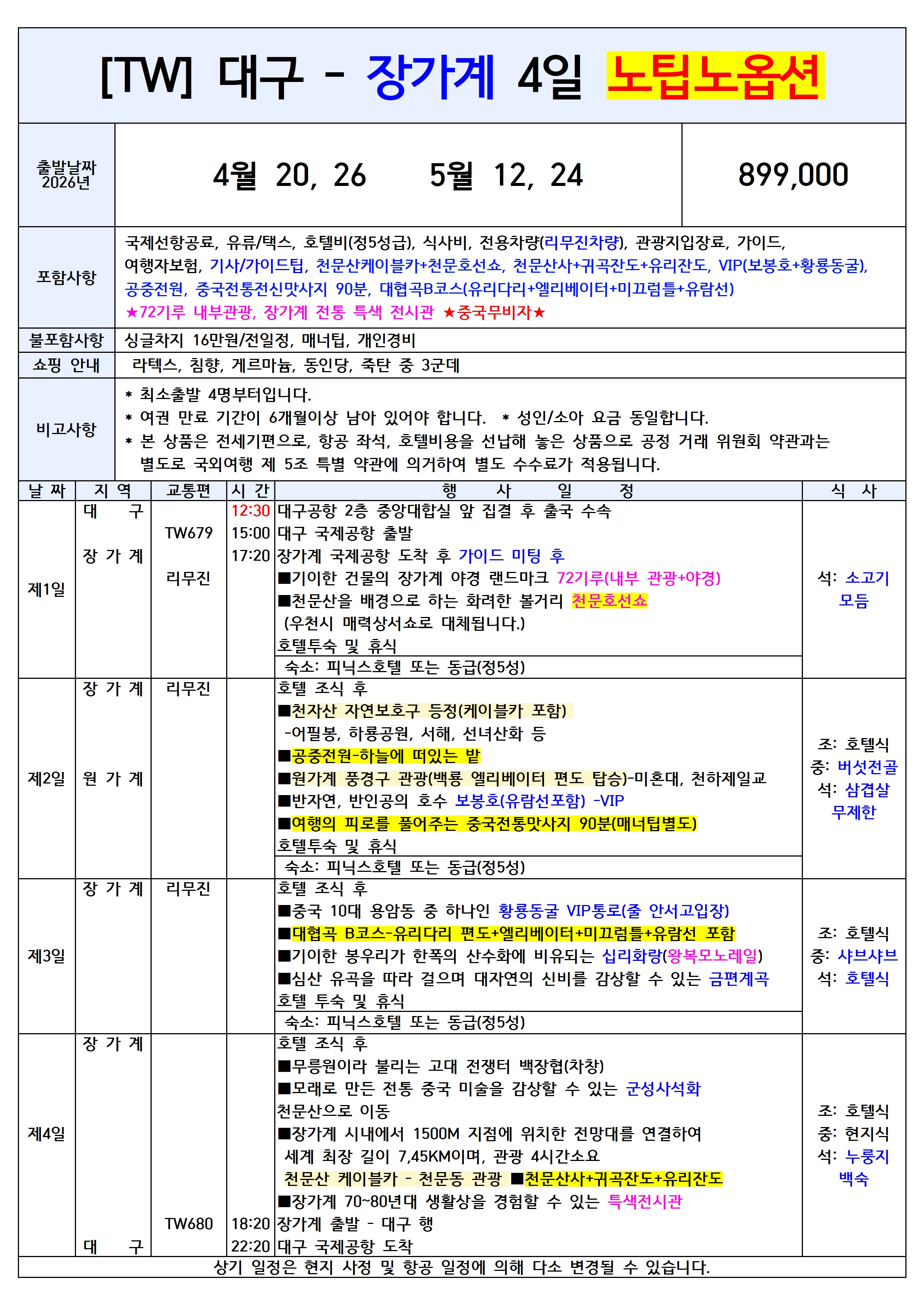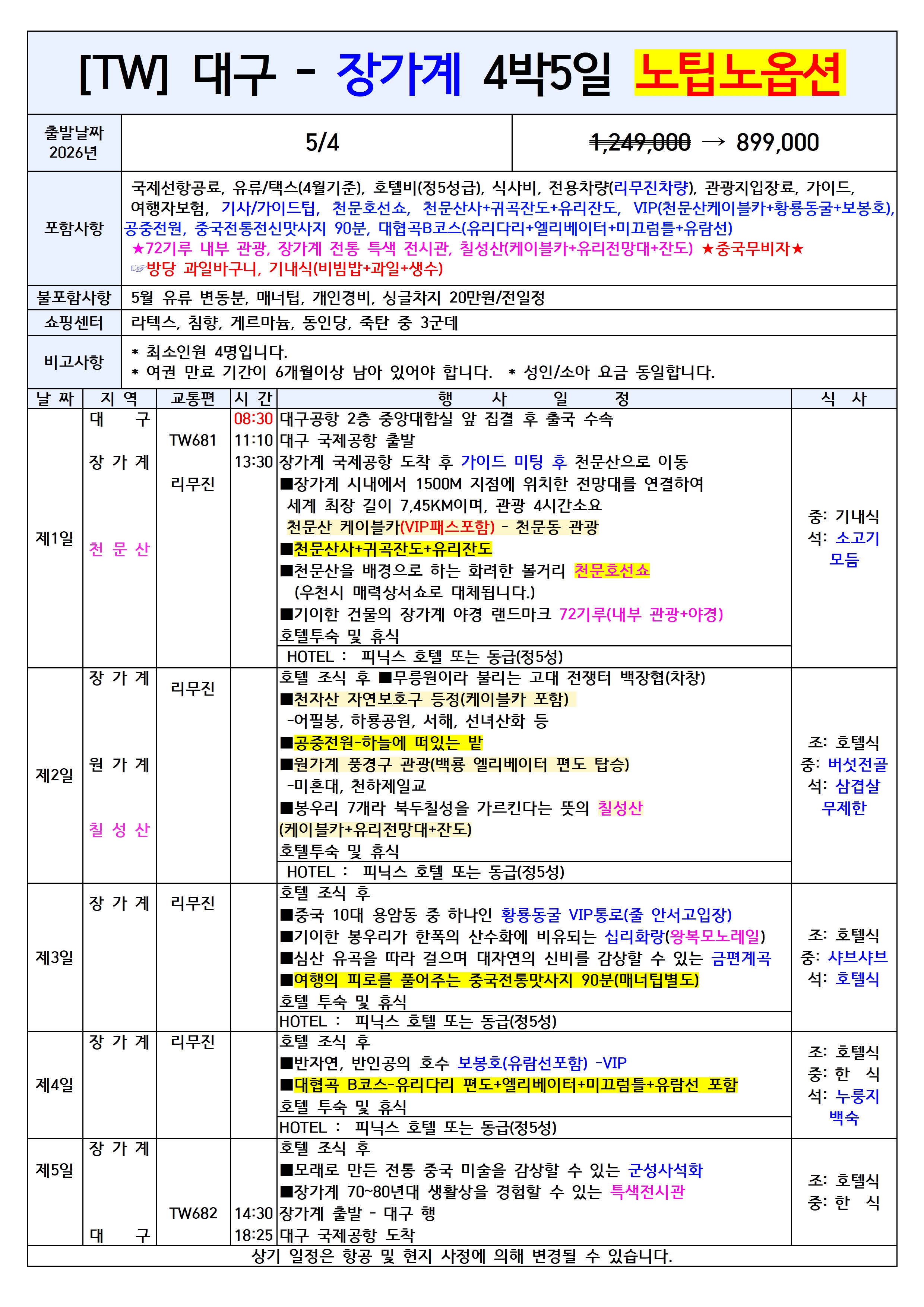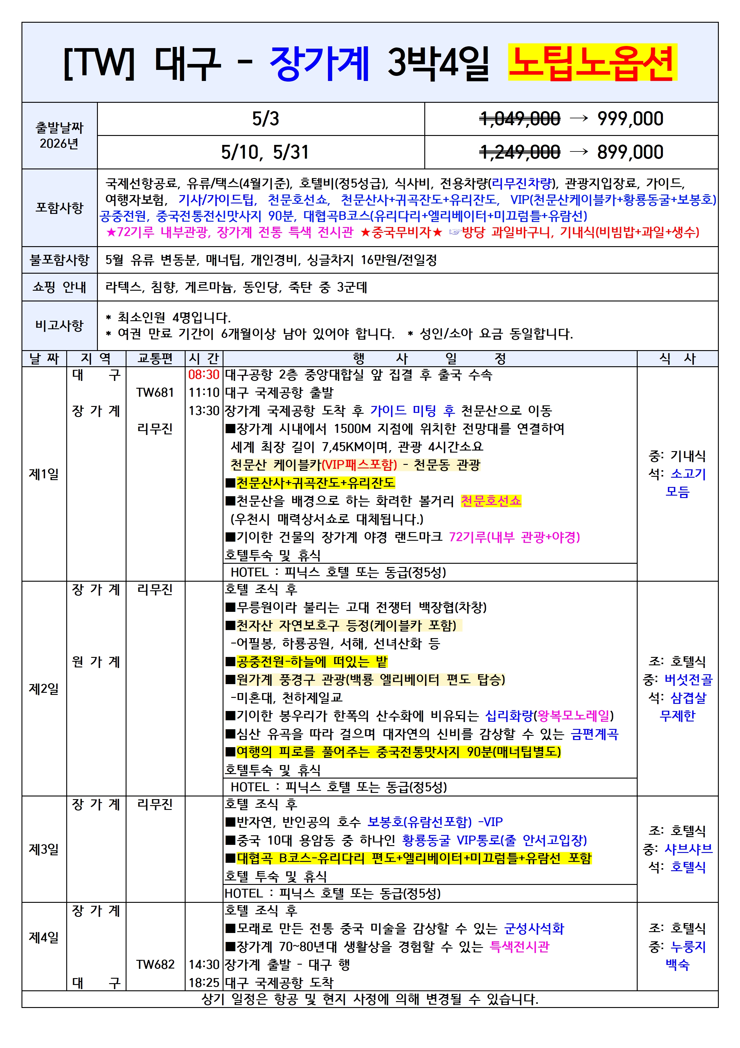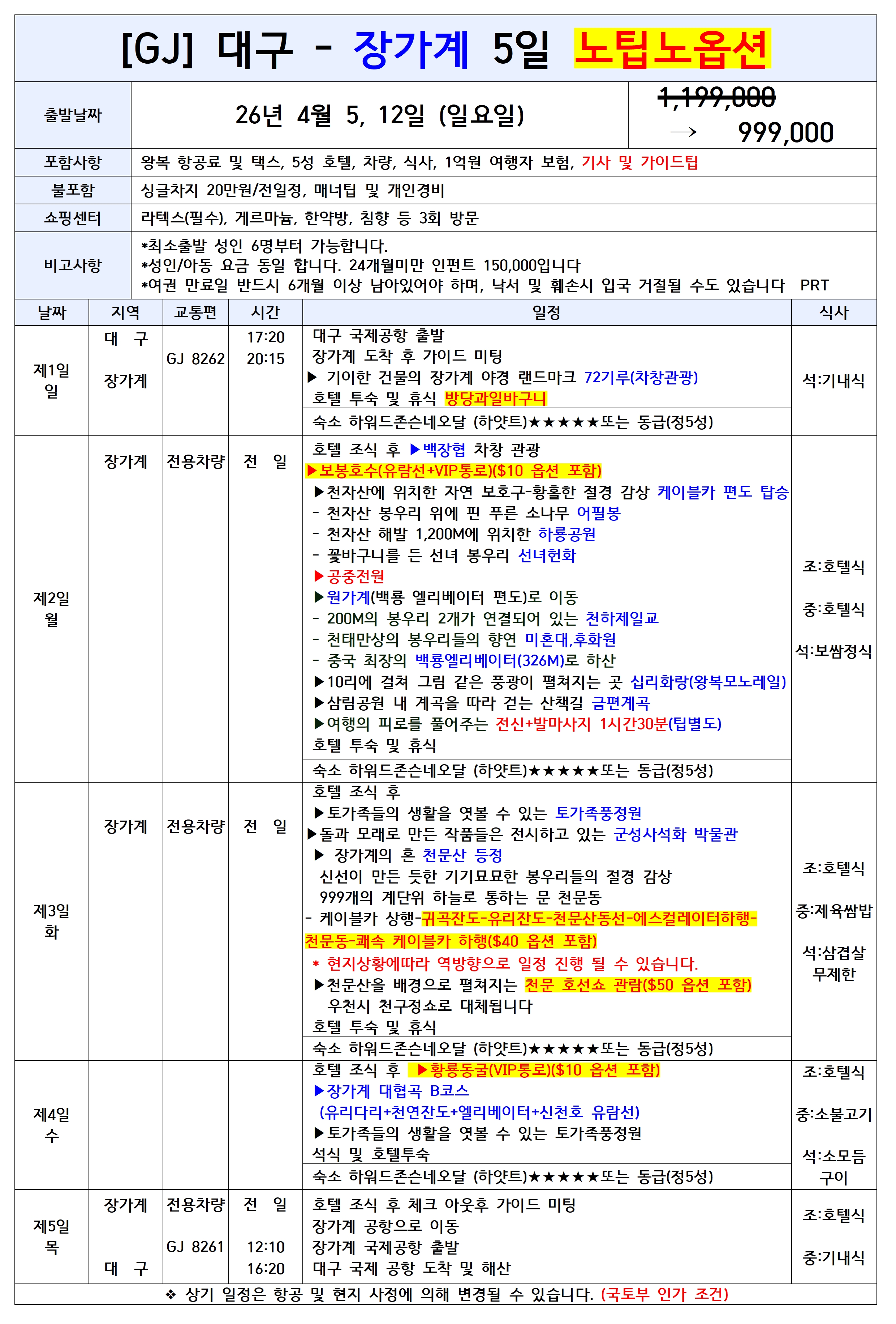 🔥선착순특가🔥[대구출발] 장가계 노팁노옵션