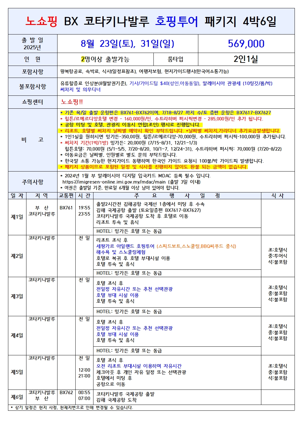 🔥선착순특가/집중모객🔥[부산출발] 코타키나발루 호핑투어 노쇼핑