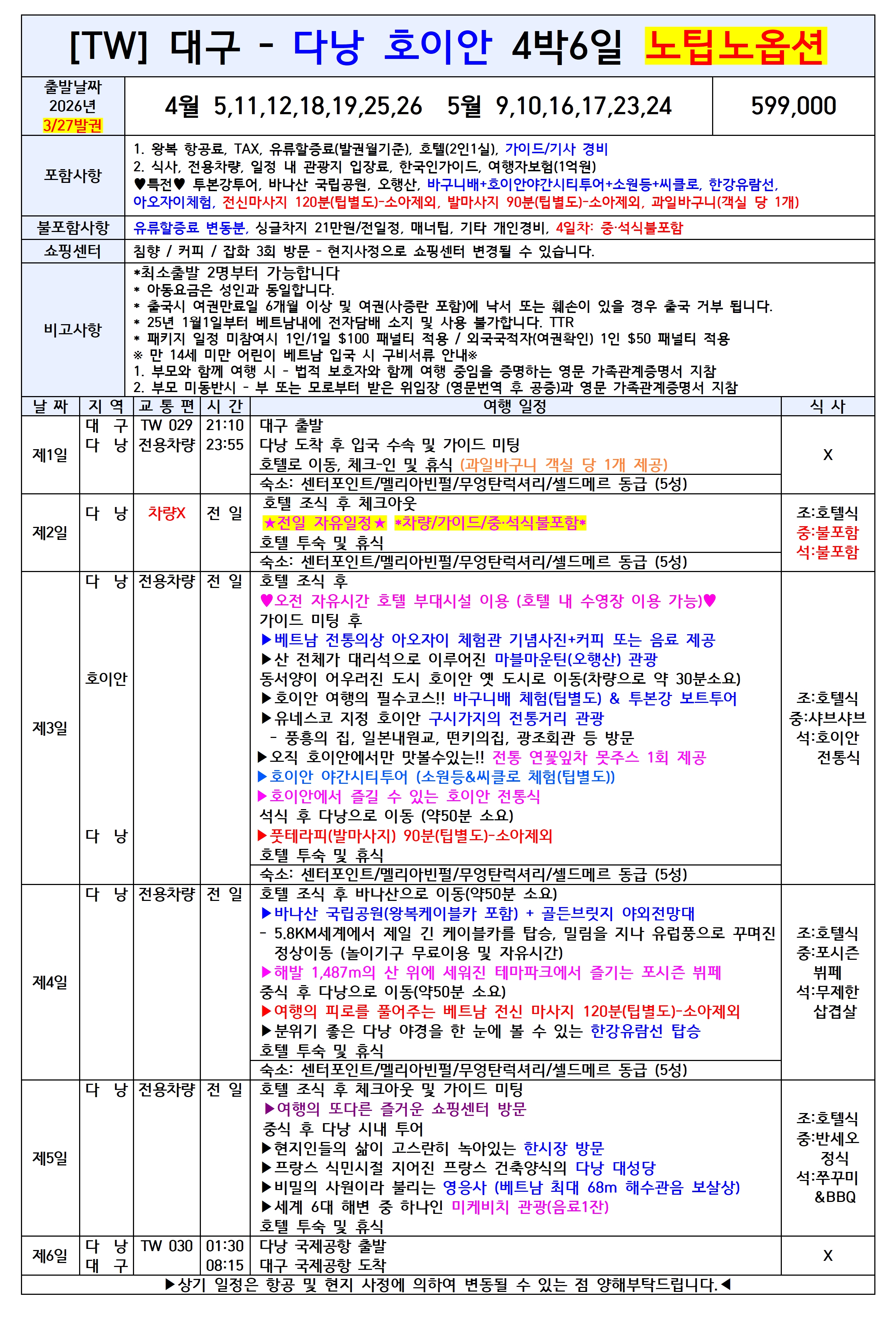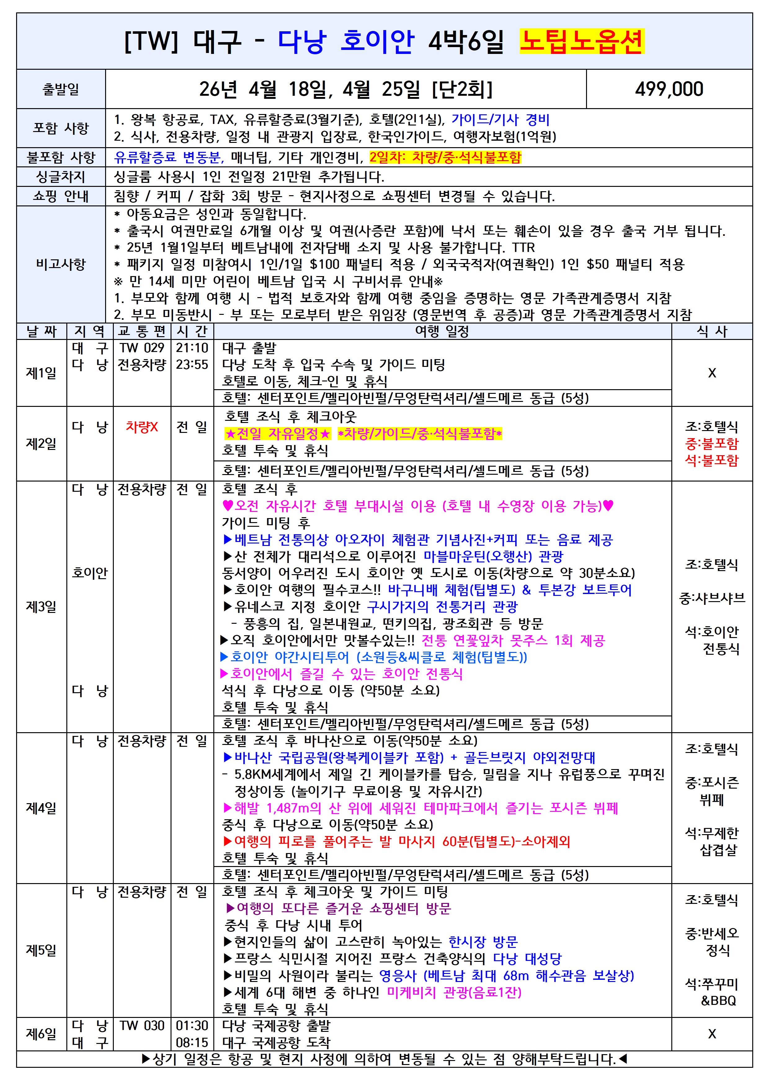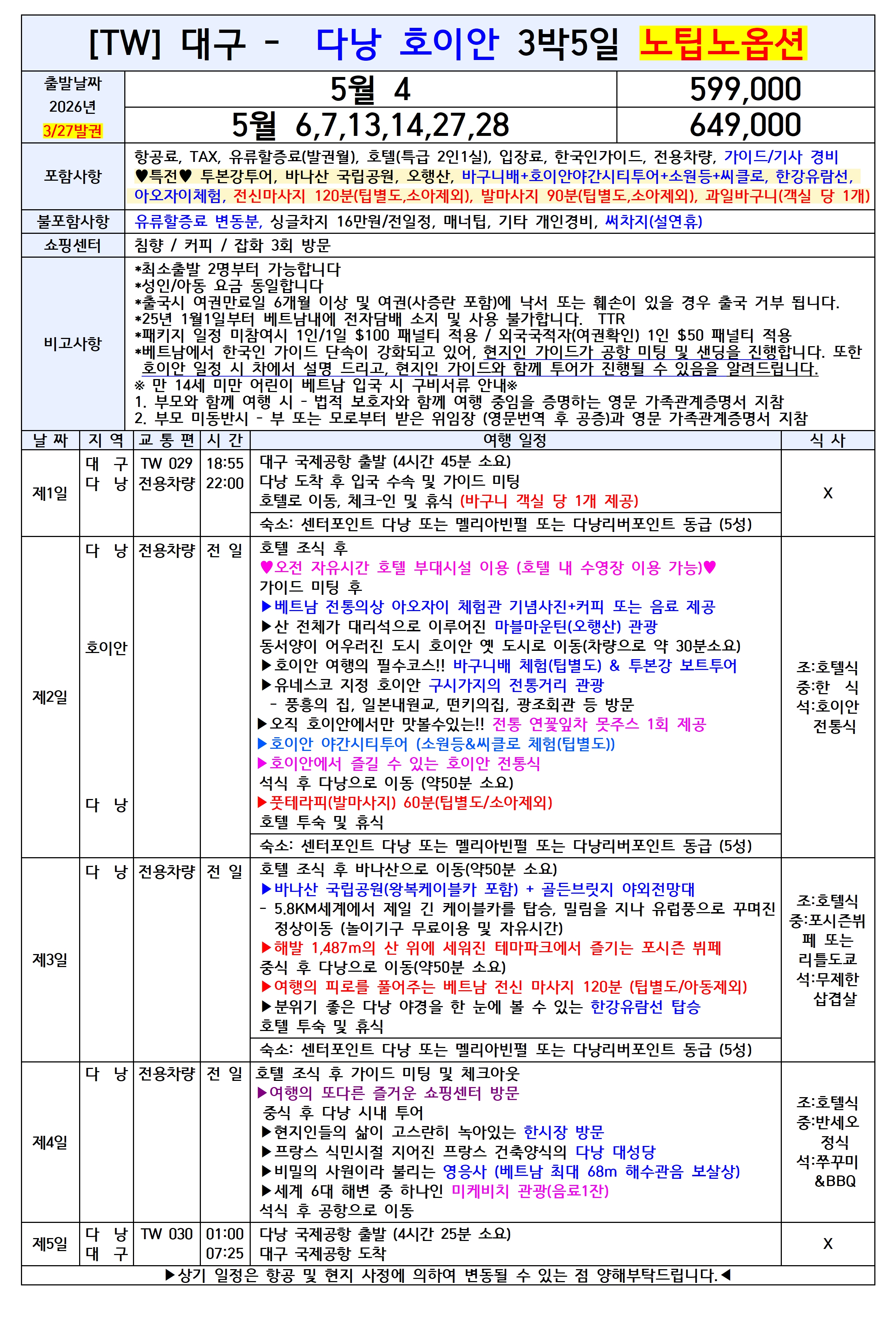 🚨선착순특가🚨 대구출발 다낭/호이안 노팁노옵션