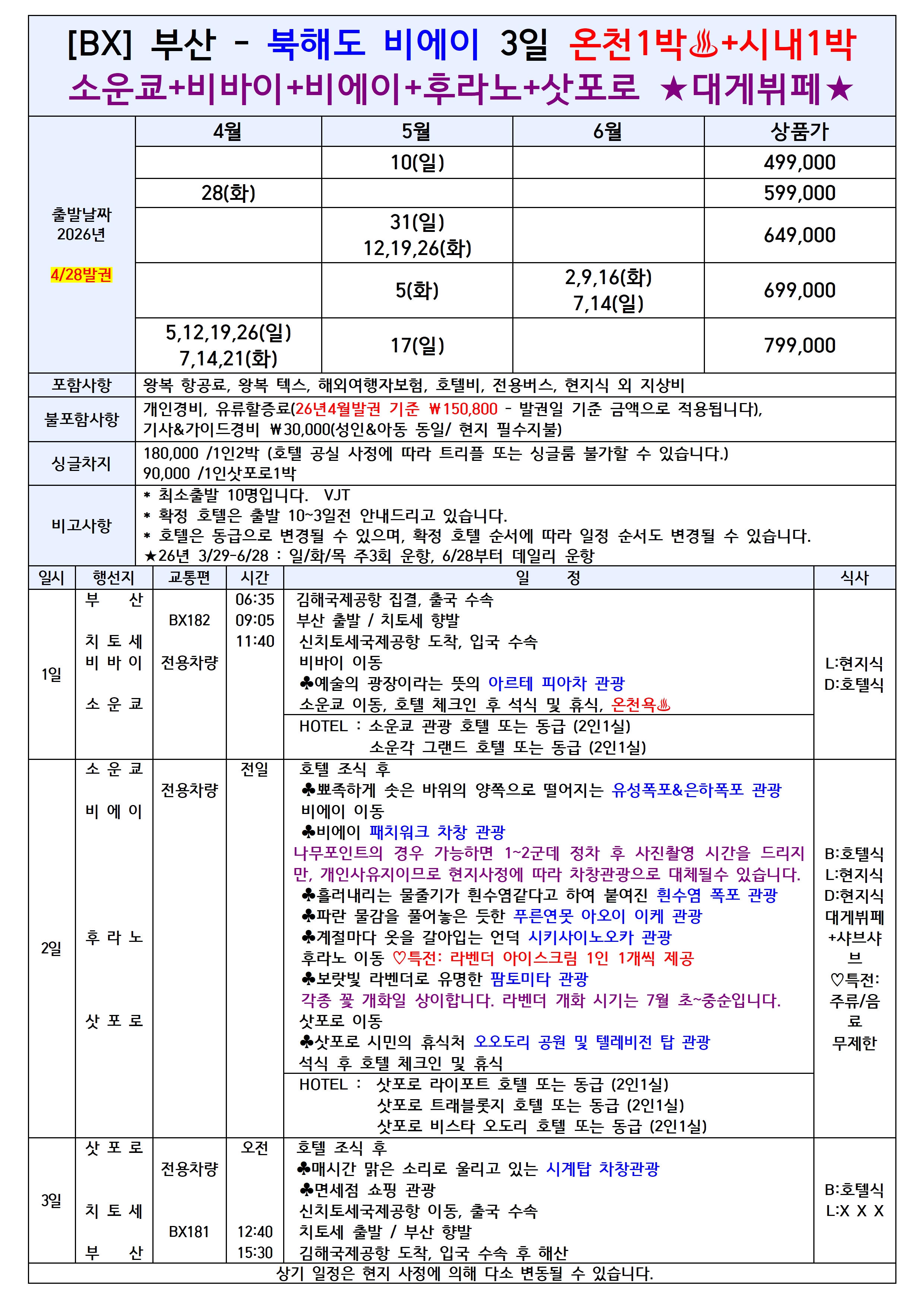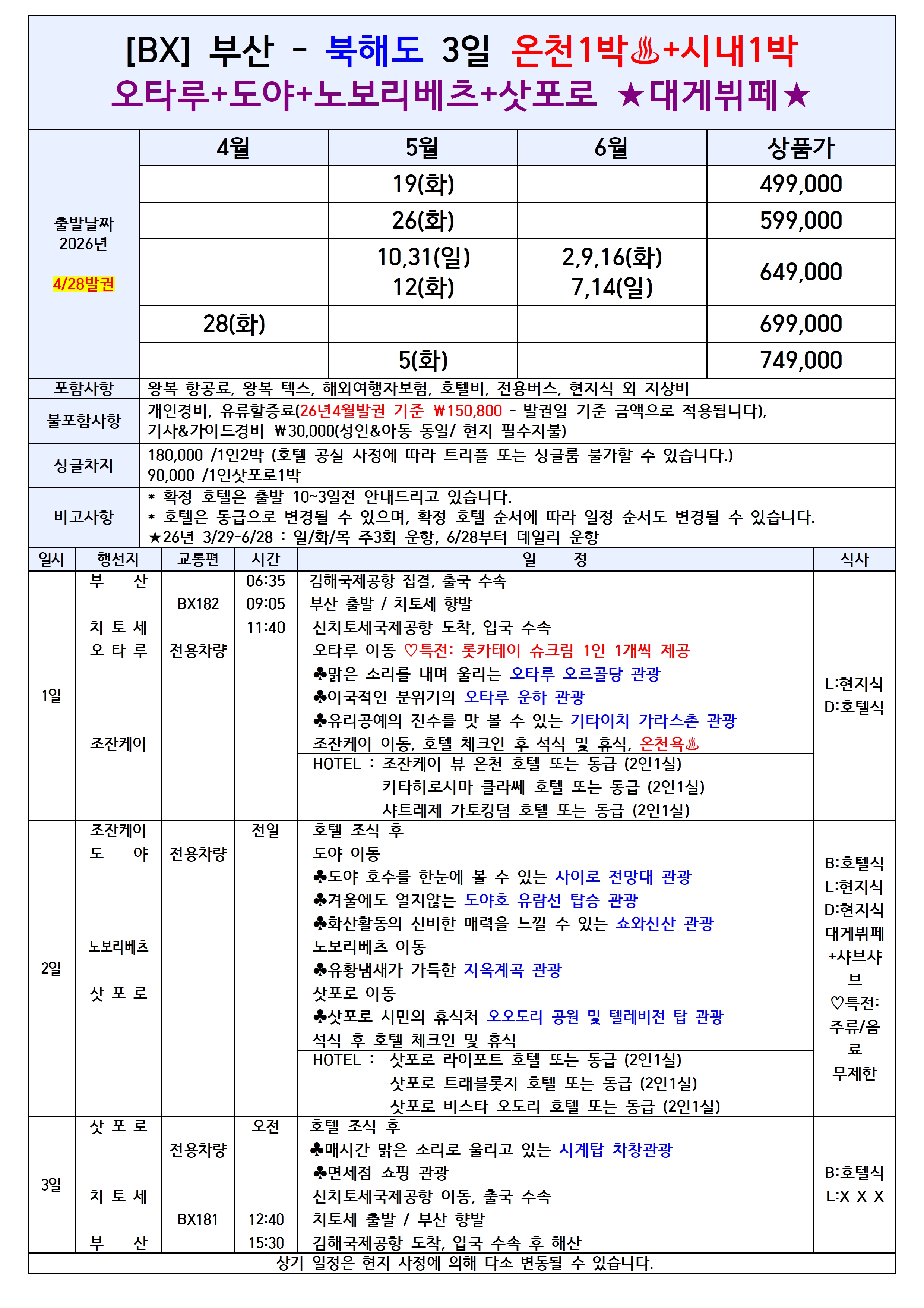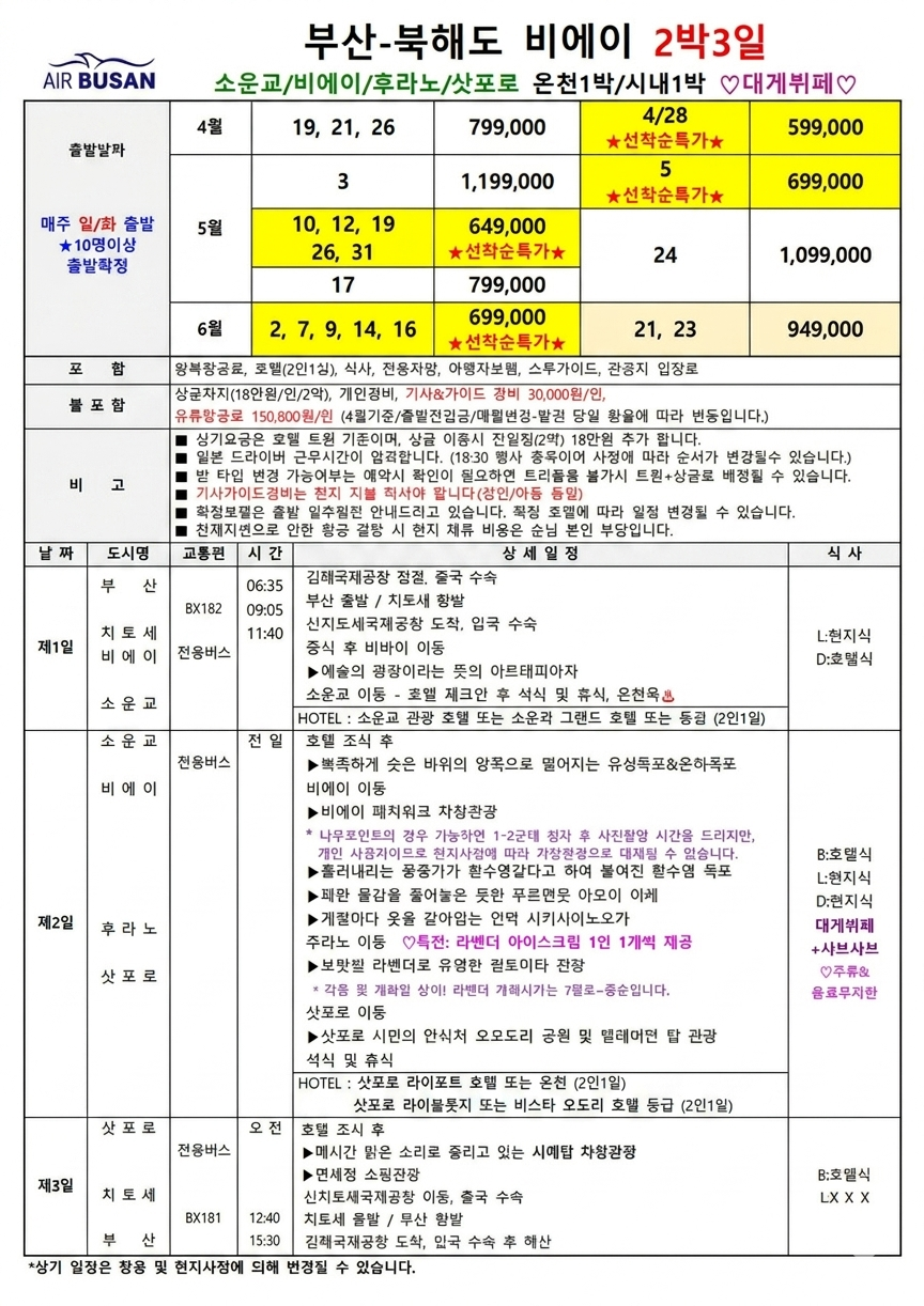 🌟선착순특가🌟[부산출발] 북해도 3일/4일