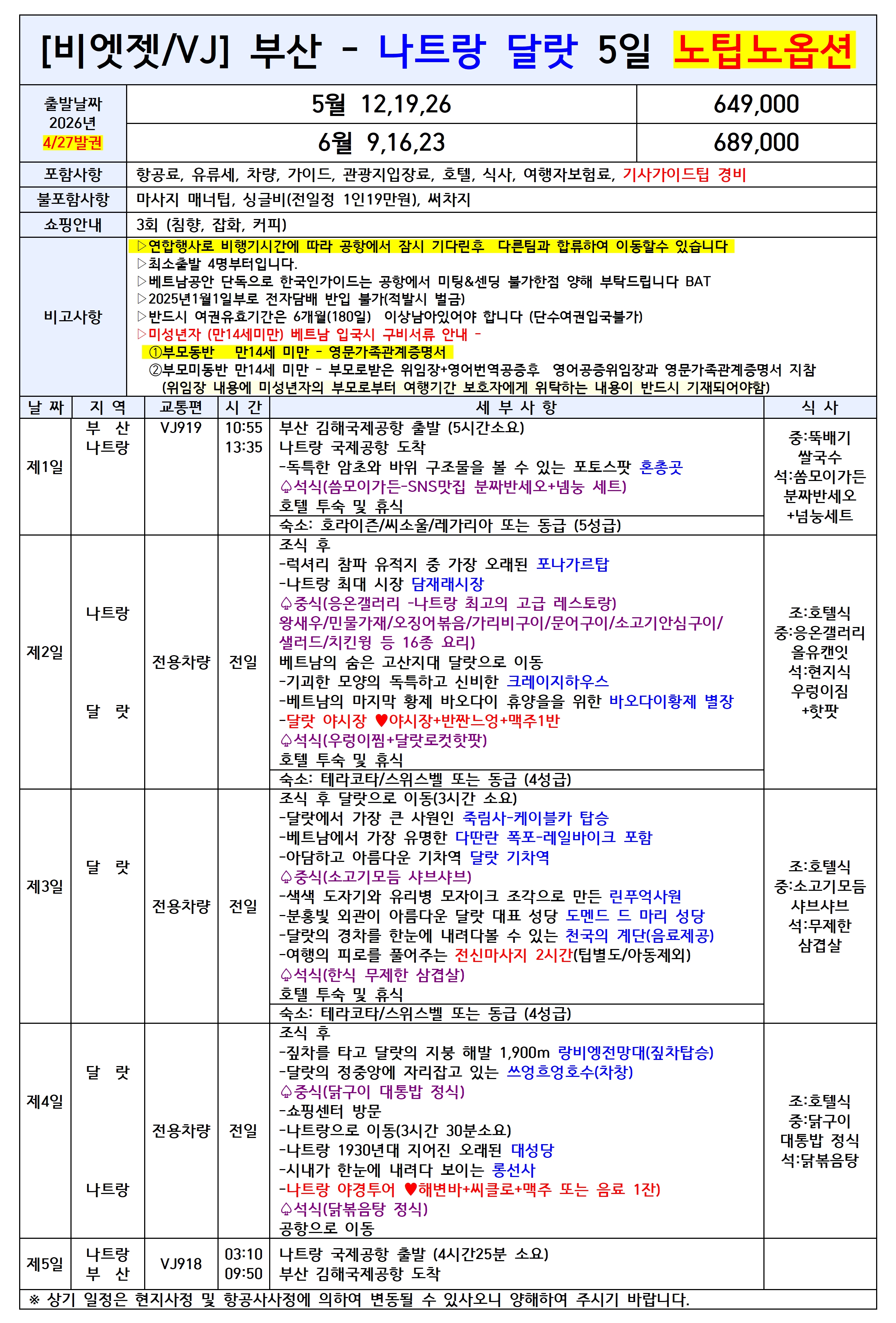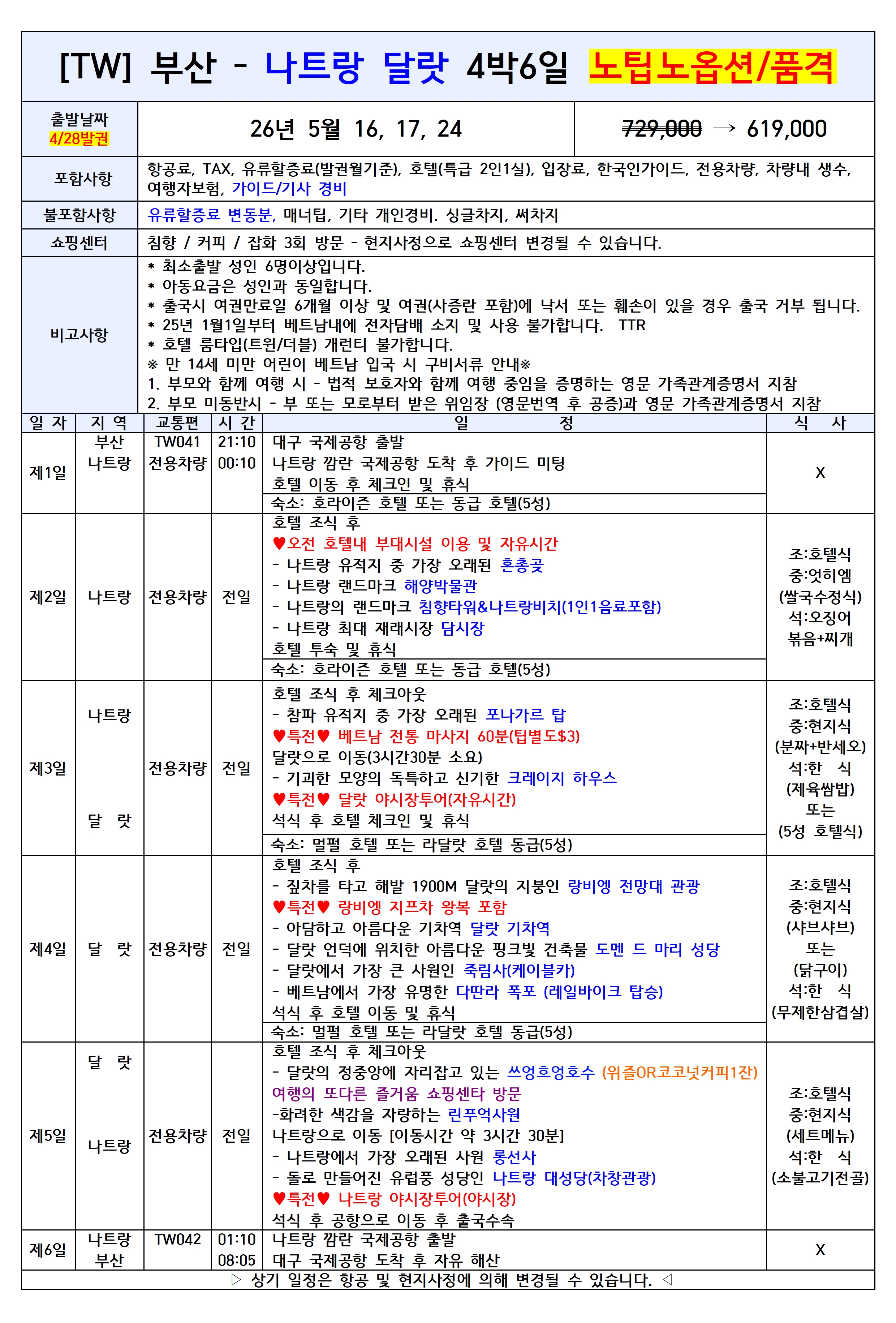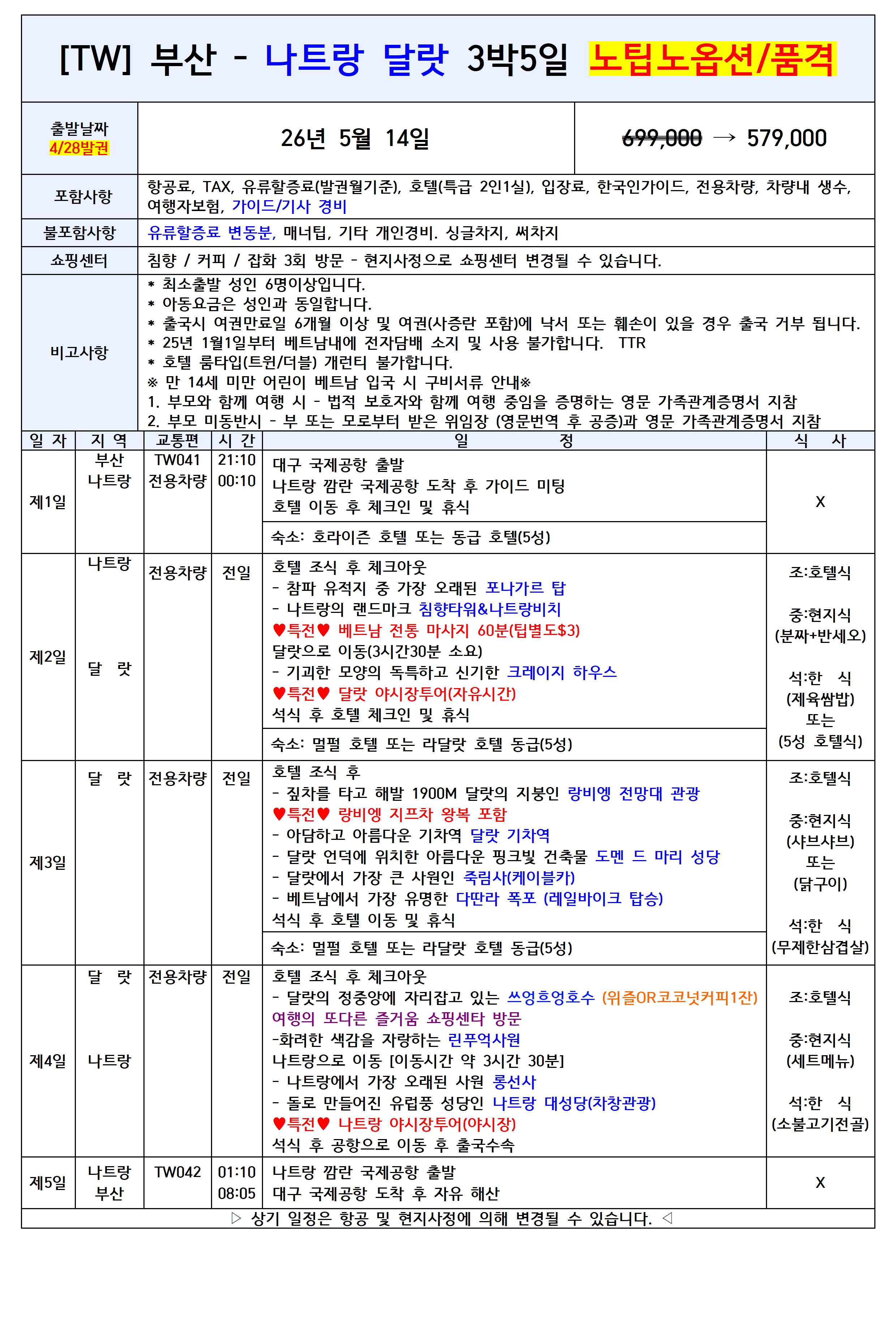 💥선착순특가💥[부산출발] 나트랑달랏 5일 노팁노옵션