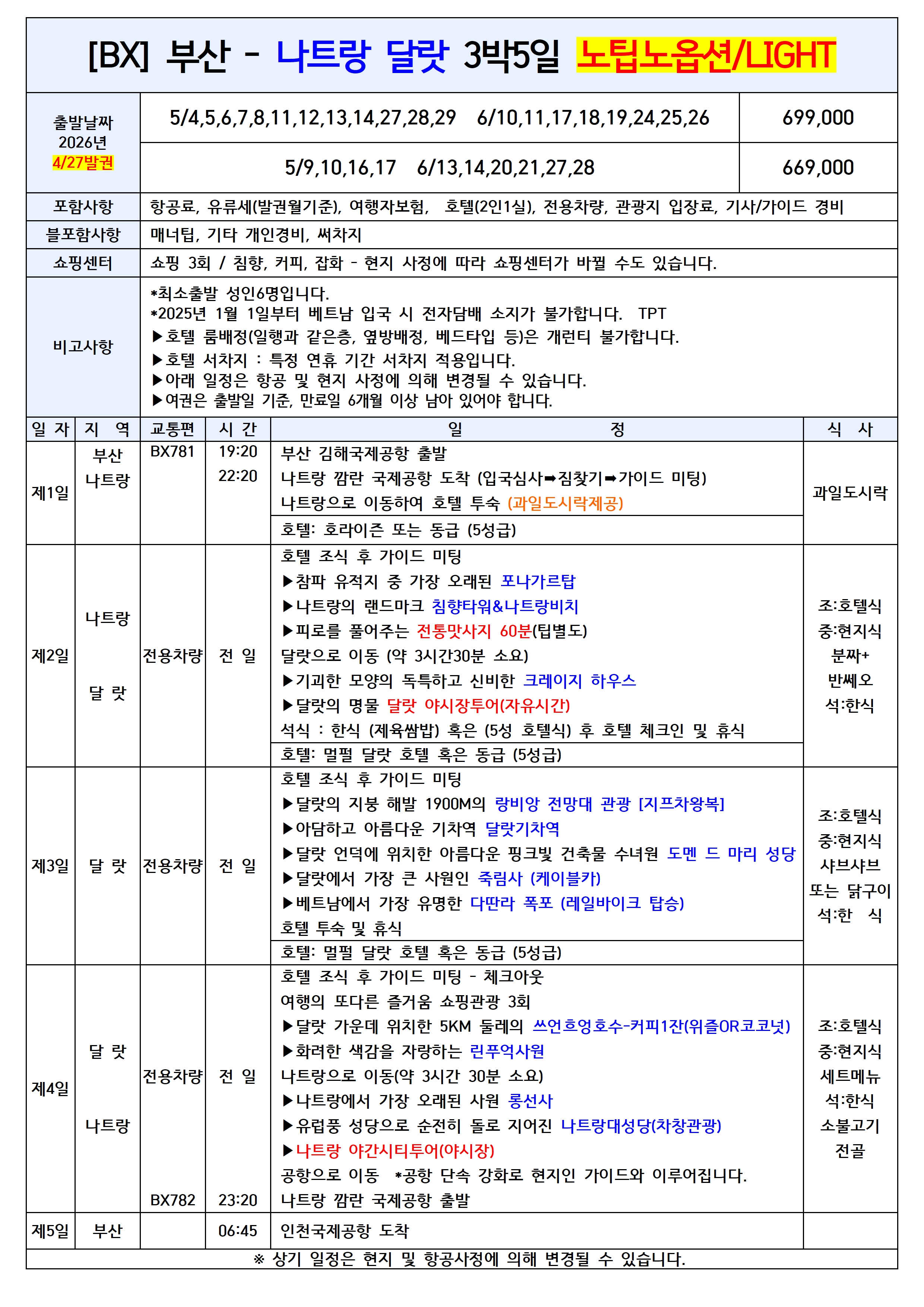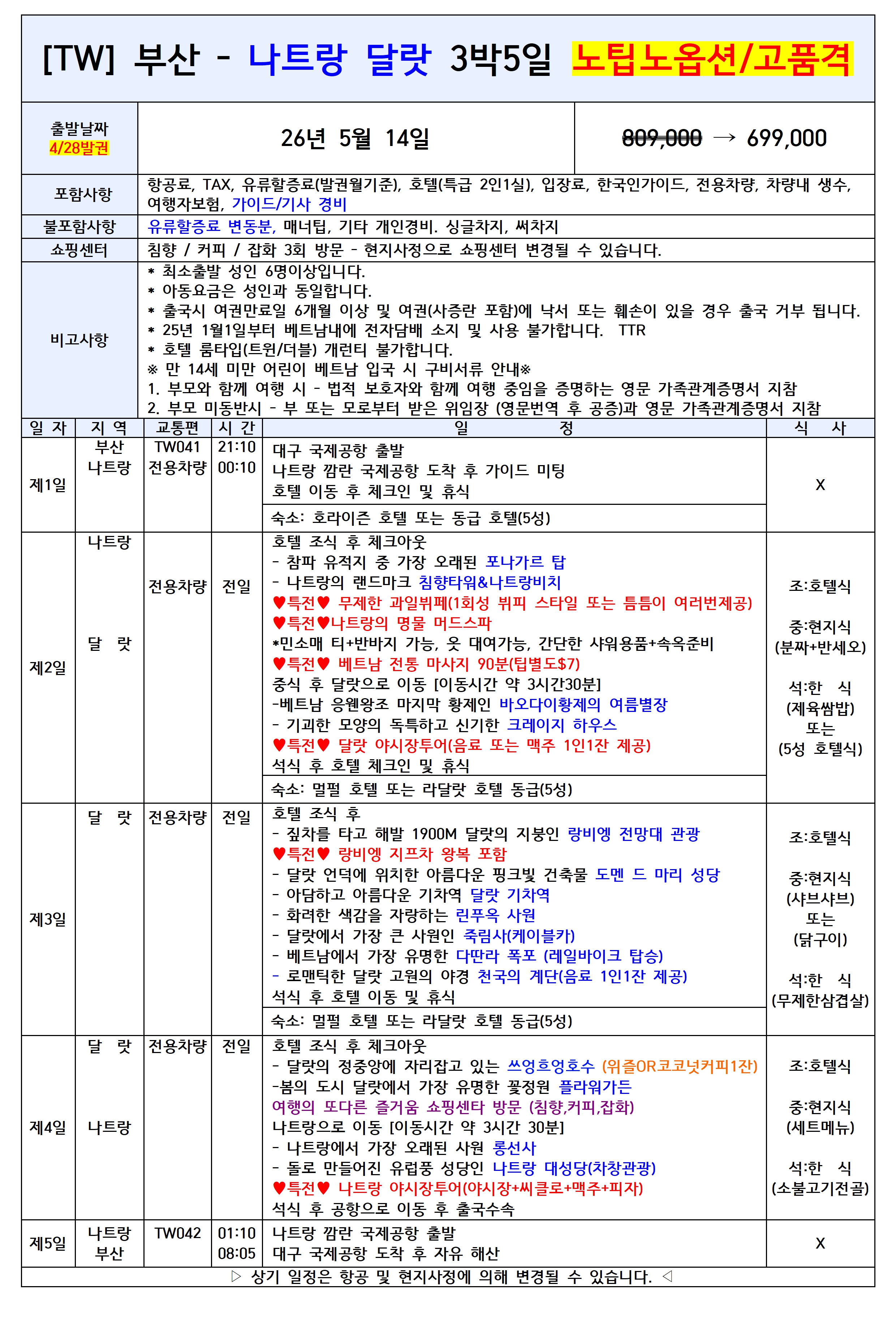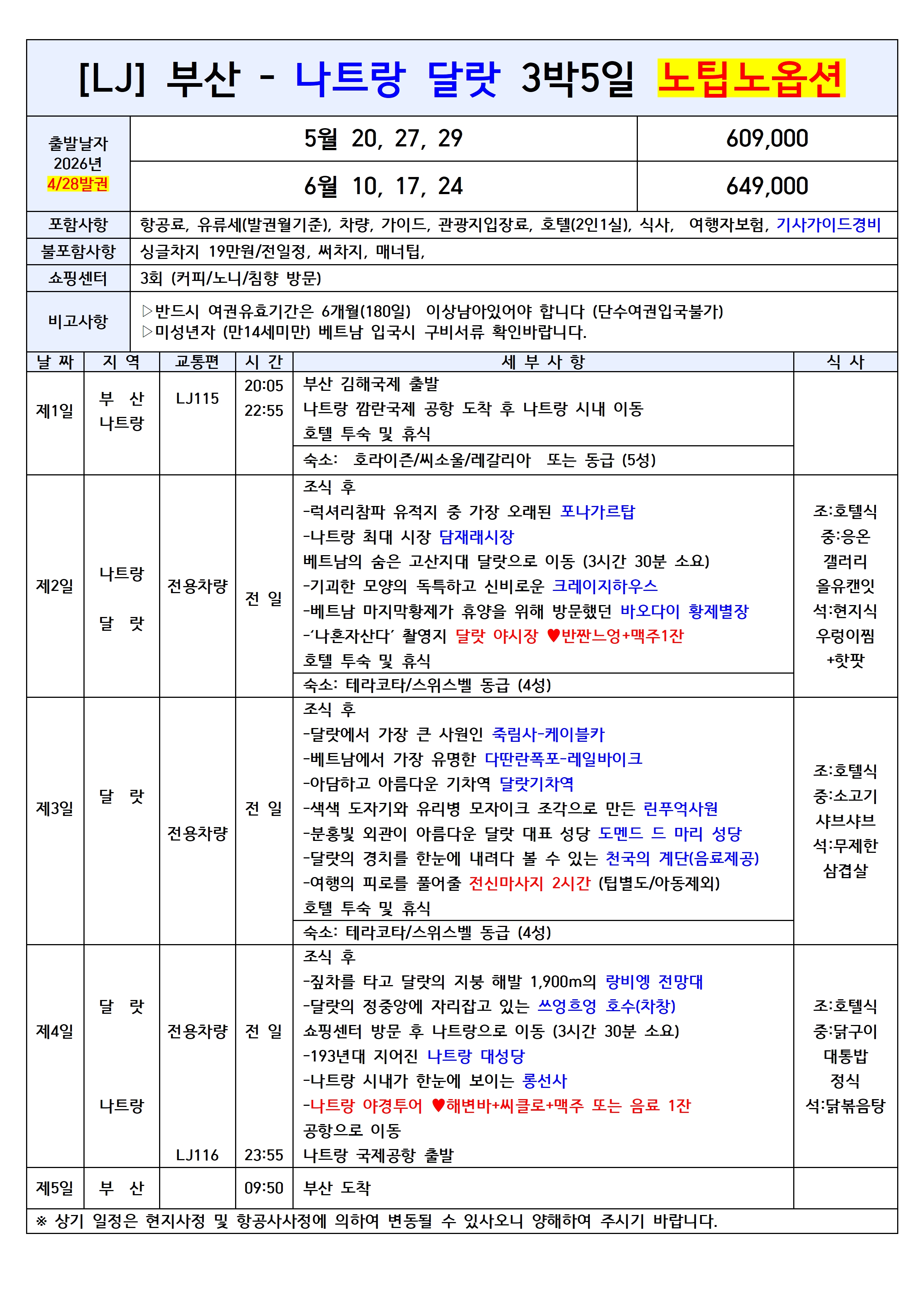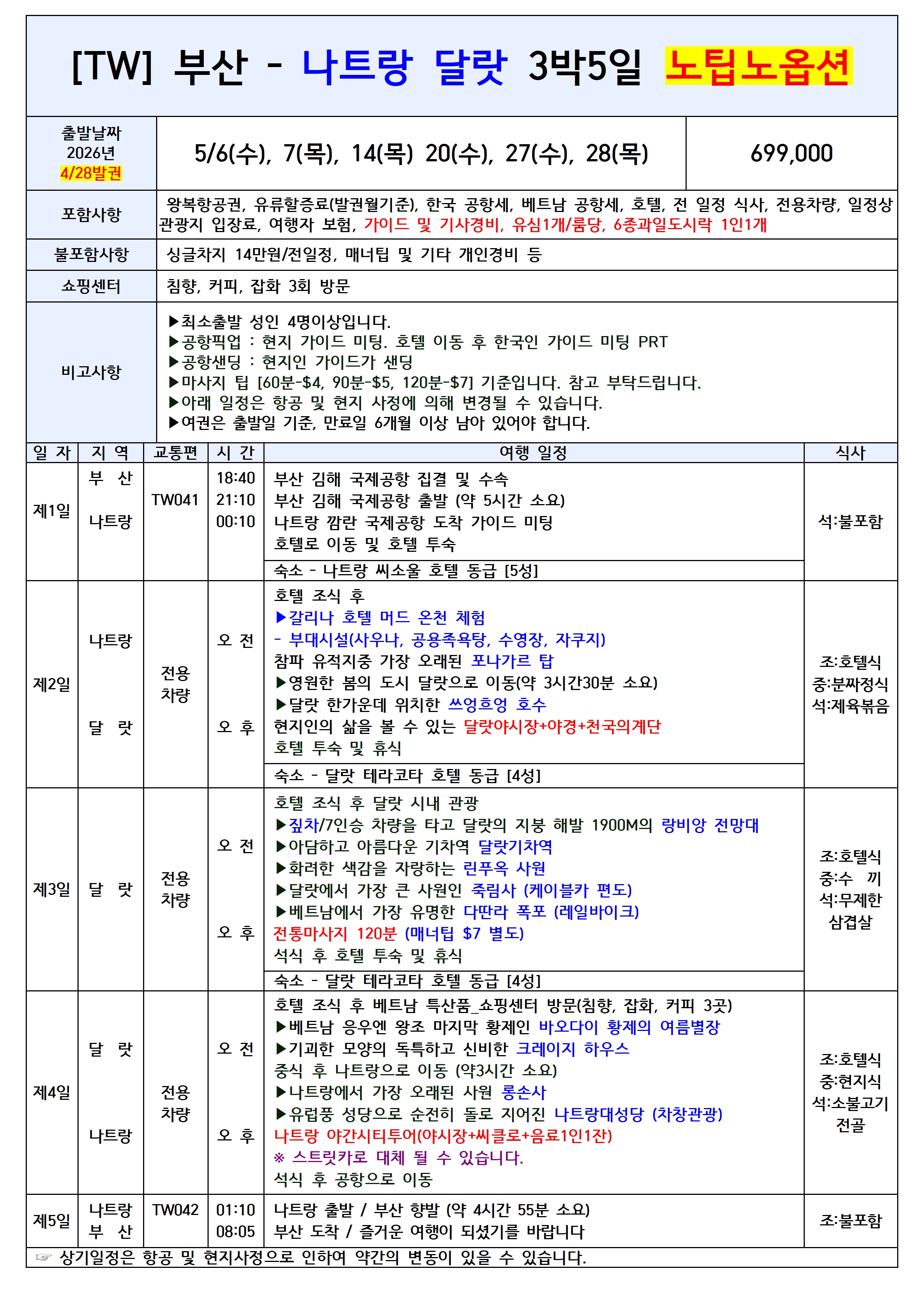 💥선착순특가💥[부산출발] 나트랑달랏 5일 노팁노옵션