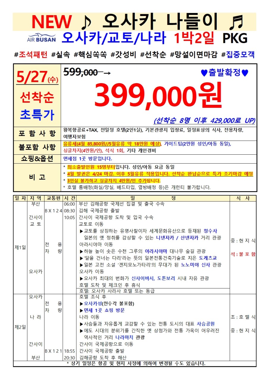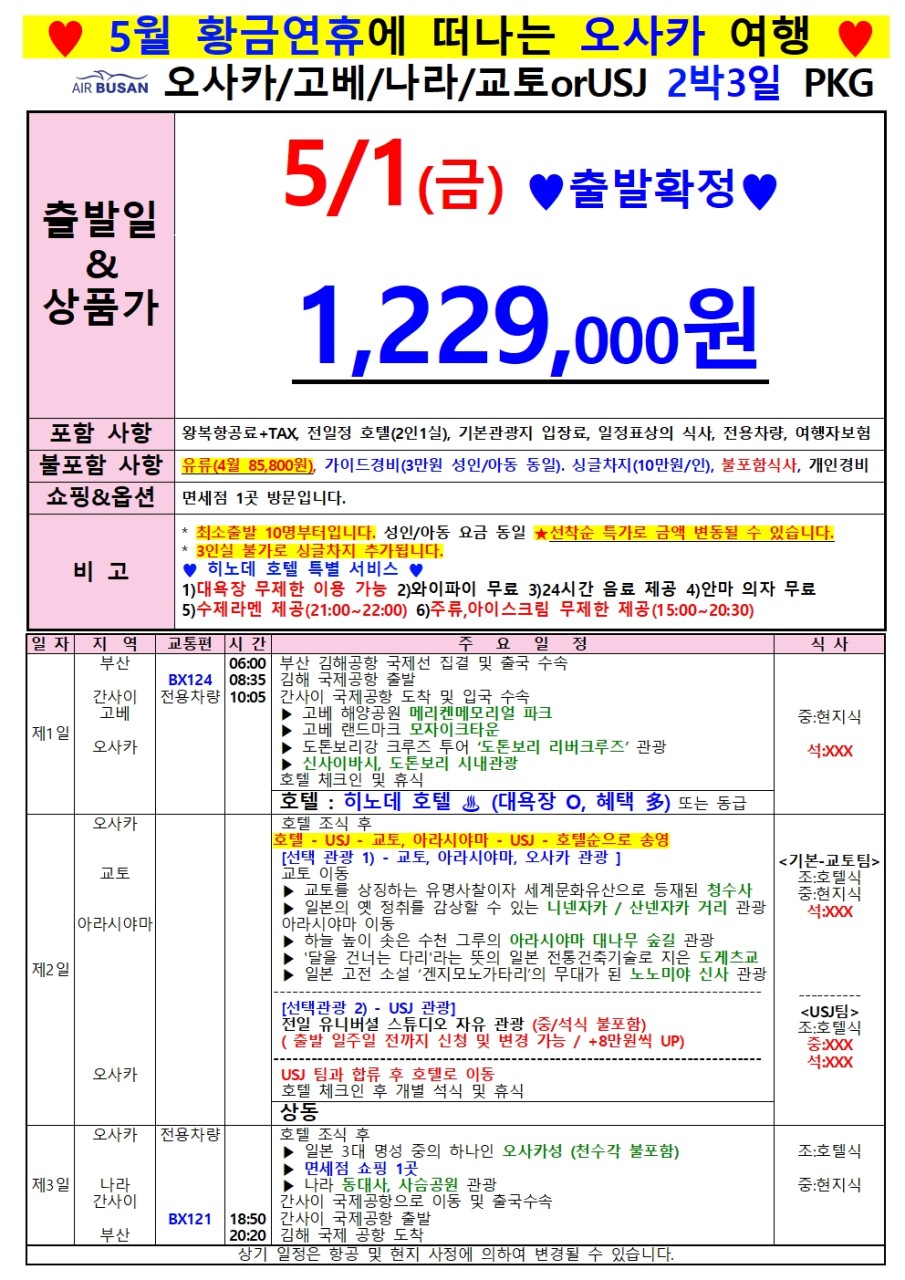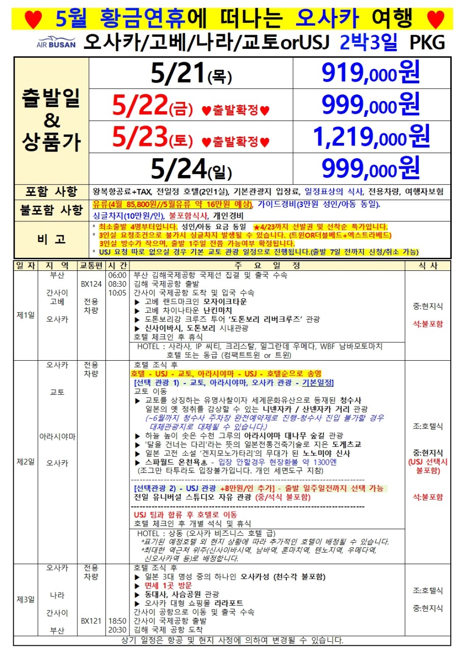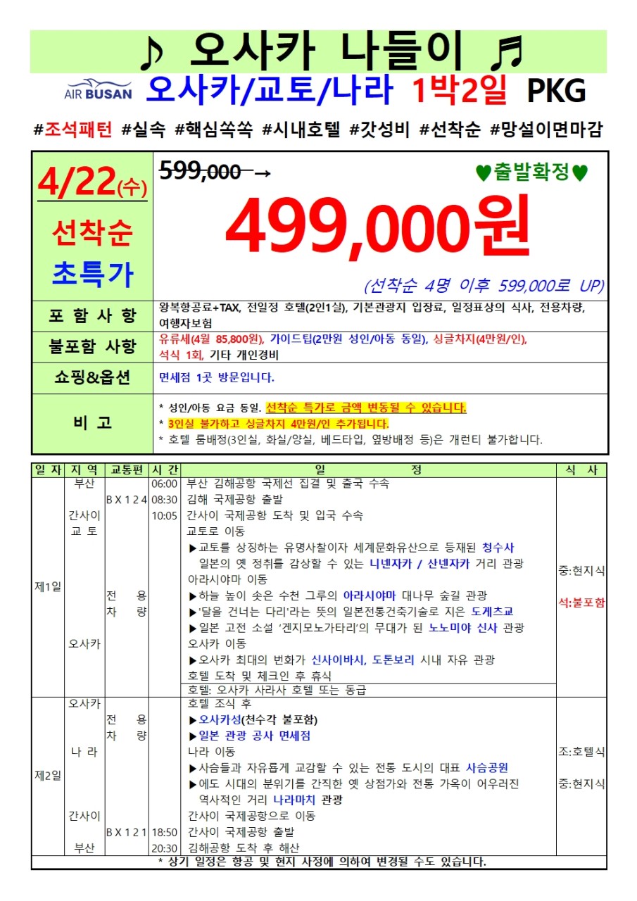 💥선착순특가💥[부산출발] 오사카 2일/3일/4일 패키지