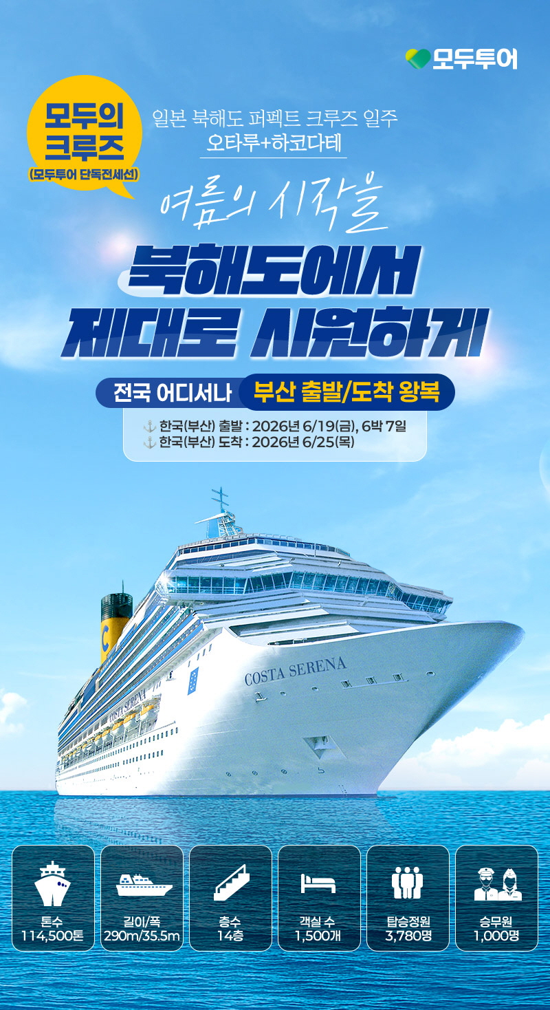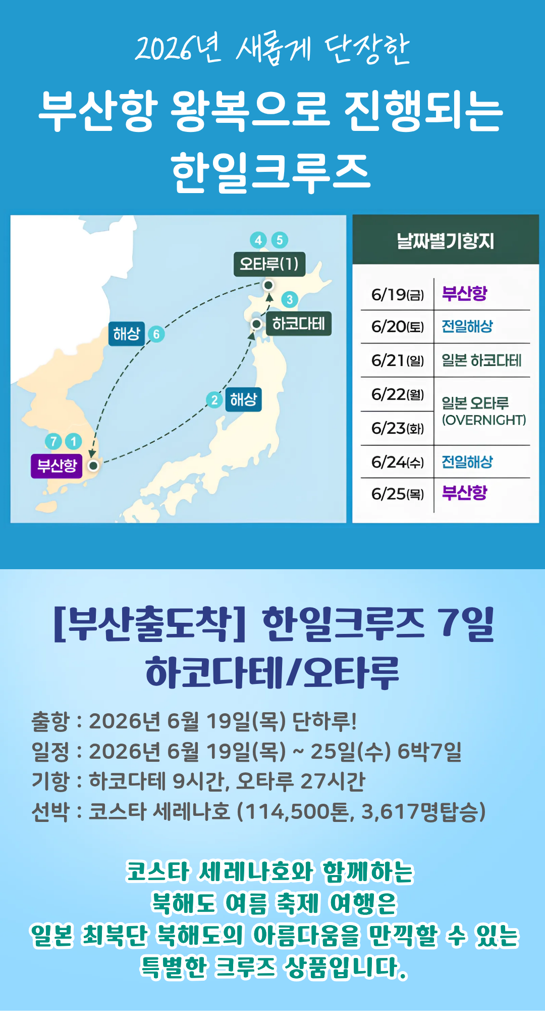 [부산출발] 한일크루즈 7일 <하코다테/오타루> 26년 6월 19일 출발 코스타세레나 🚢