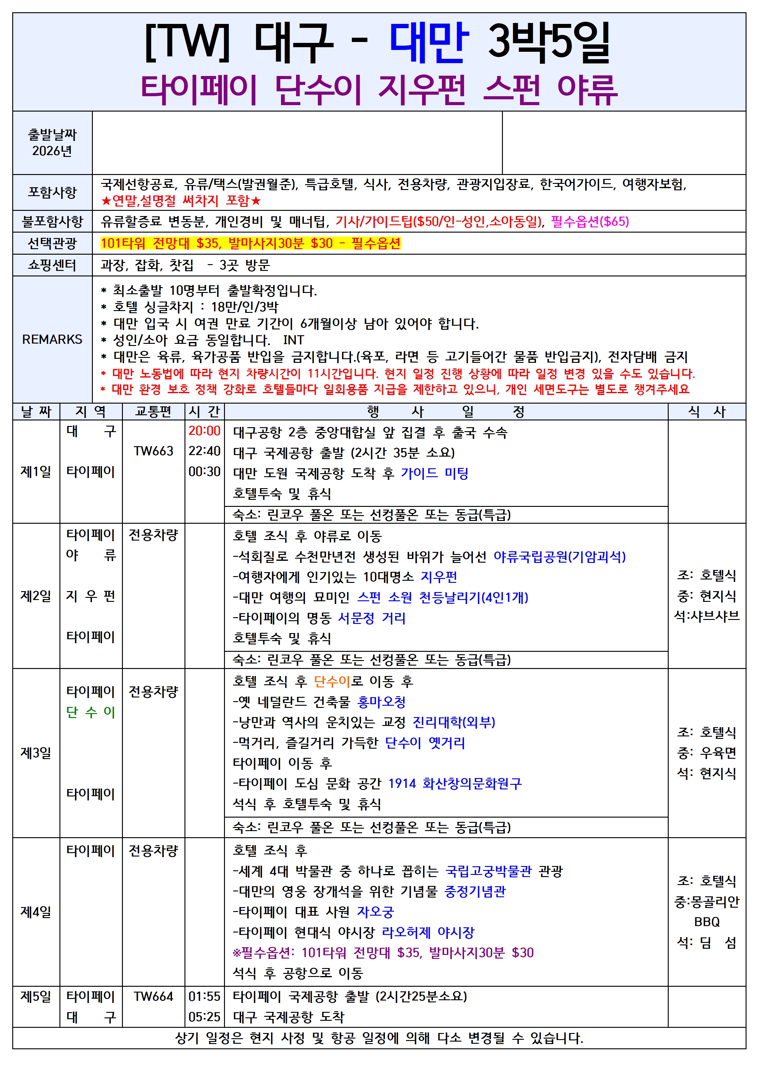 [대구출발] 대만 3박5일 타이페이/단수이/지우펀/야류/스펀 TW