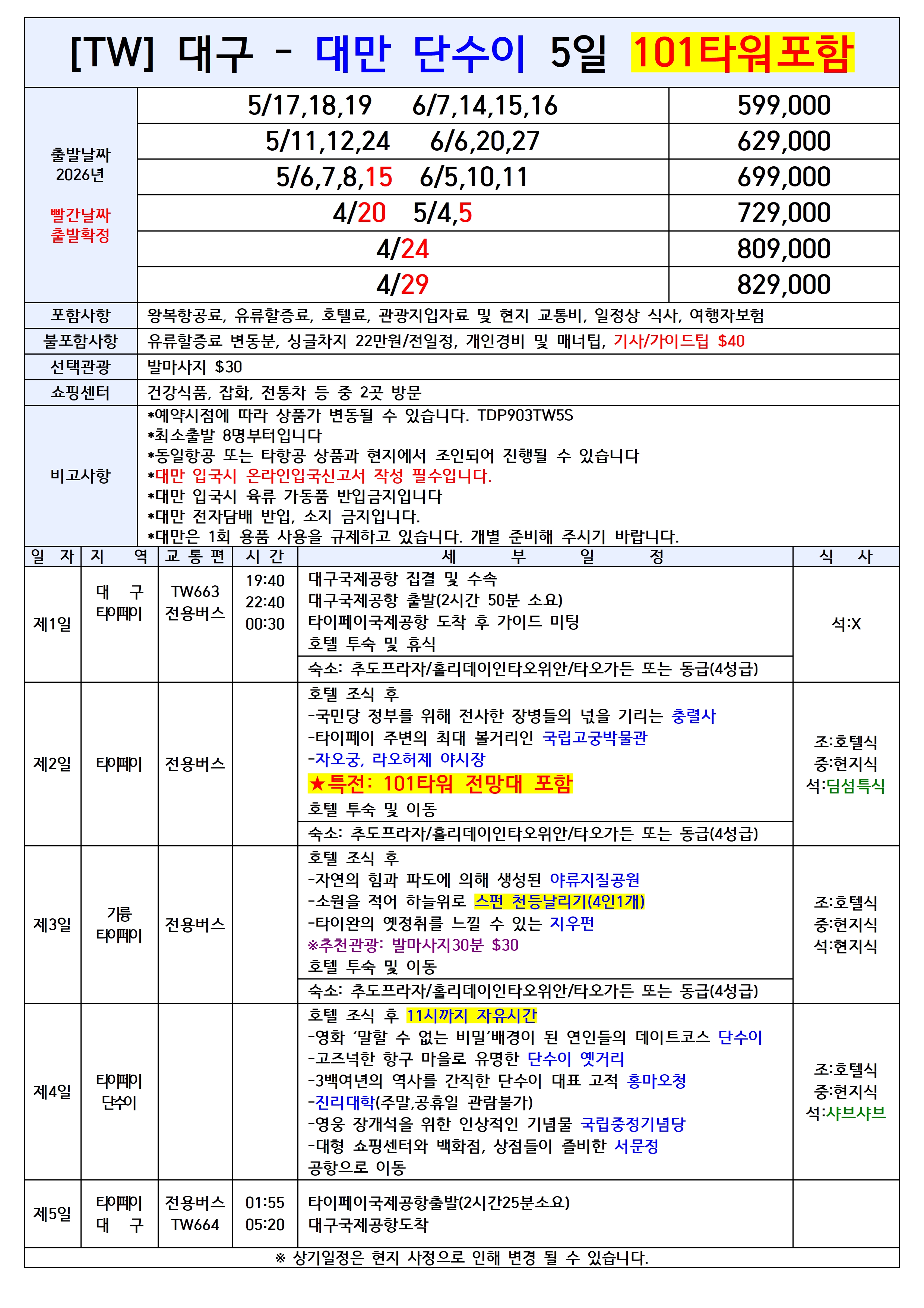 🔥선착순특가🔥[대구출발] 대만 4일/5일 티웨이항공