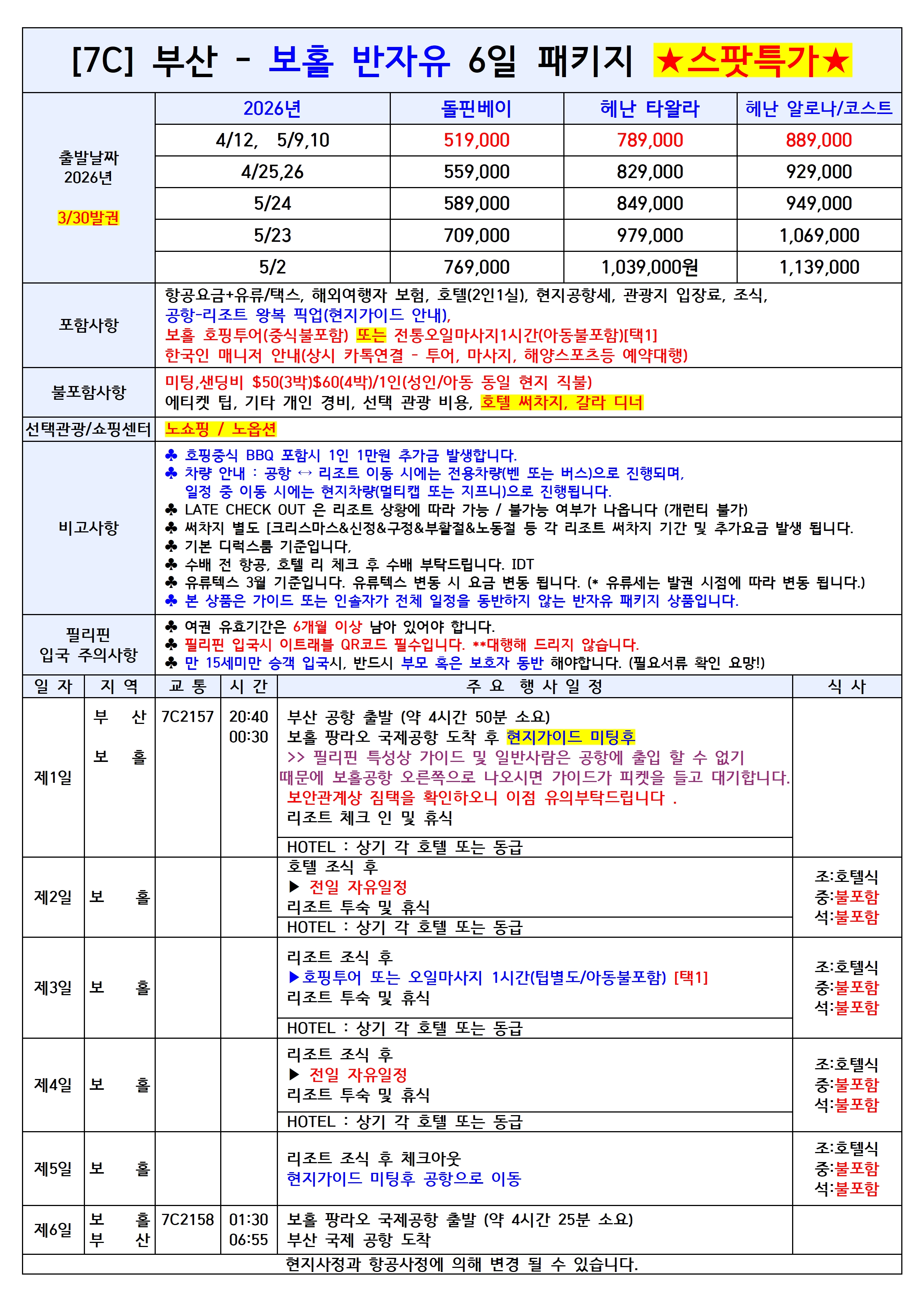 👉 가이드와 함께하는 편안한 여행!! 세미PKG 📌최상의 만족도 헤난 리조트 ⭐헤난 가성비 1위 헤난 타왈라 ⭐보홀 최고의 리조트!! 인스타맛집 헤난 알로나 ⭐난 신상이 좋아!! 헤난 프리미어코스트 🎉추천선택 옵션 사전포함 5만원 🌊마린 호핑투어(스노쿨링+중식BBQ)🌊 🐵보홀 데이투어(타르시어원숭이,초콜릿힐,멘메이드포레스트)
