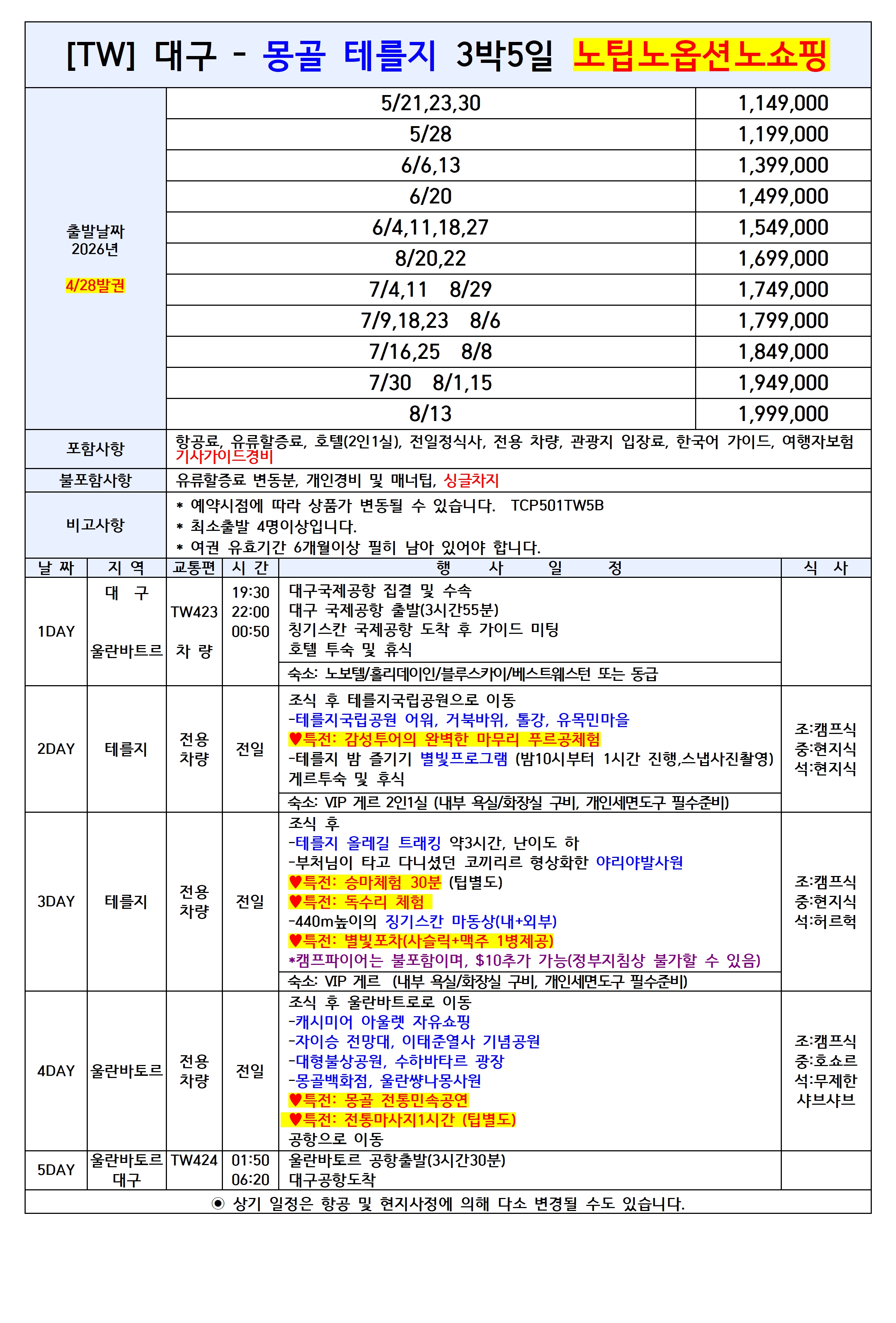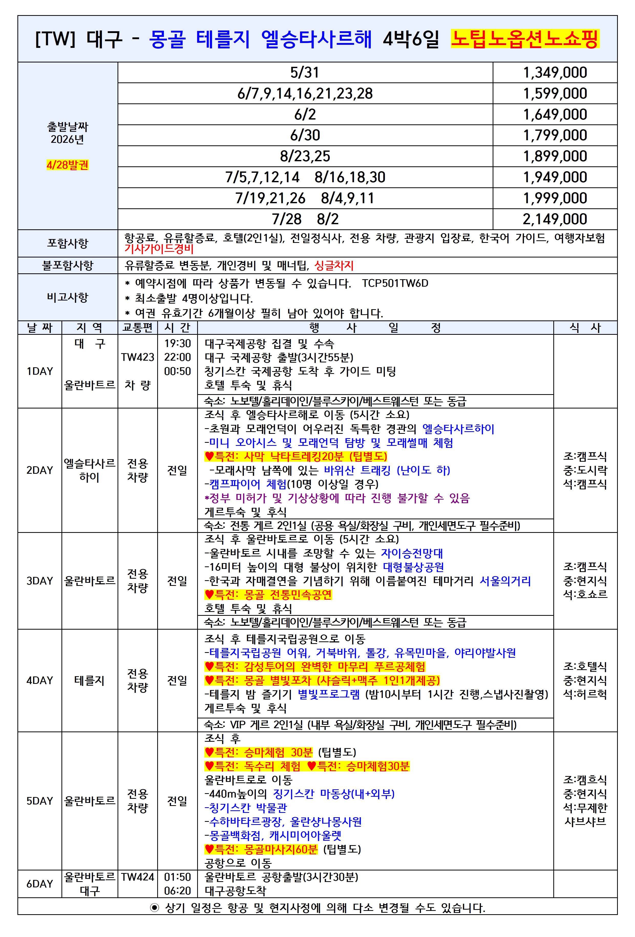 [대구출발] 몽골 울란바토르 테를지 5일/6일 노팁노옵션노쇼핑 TW