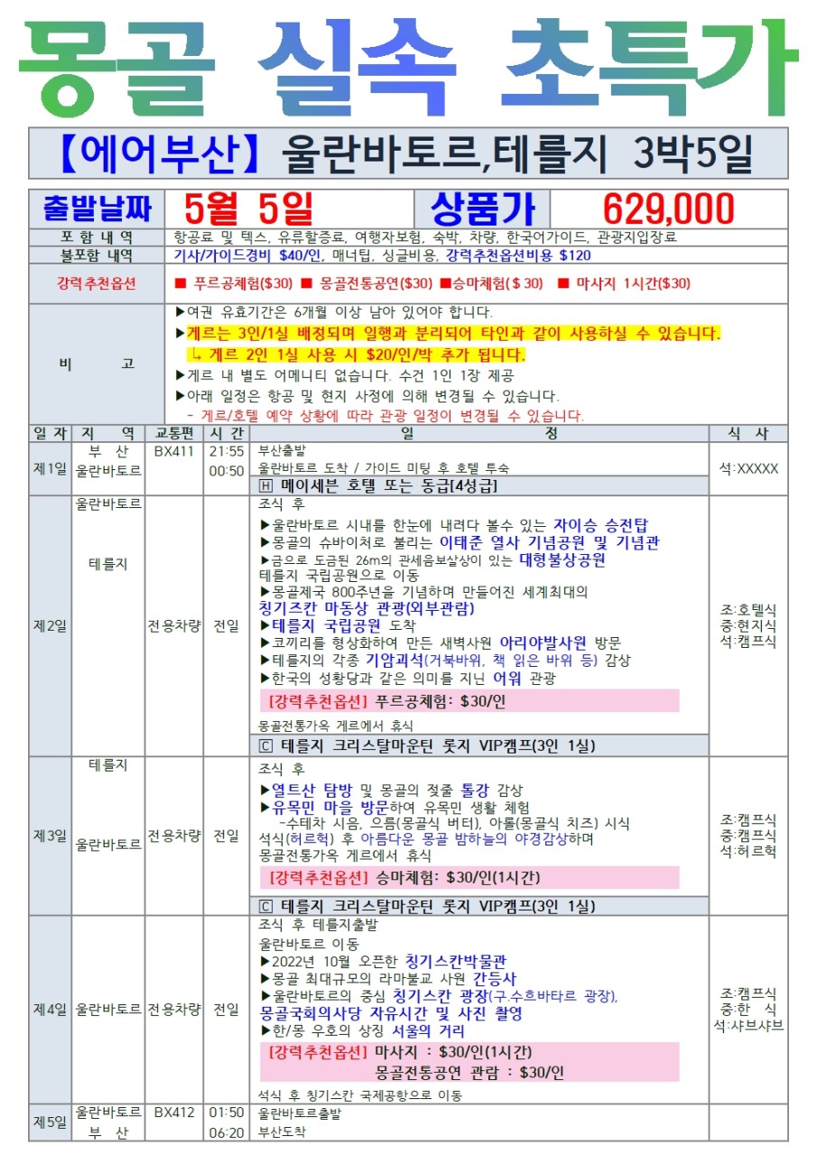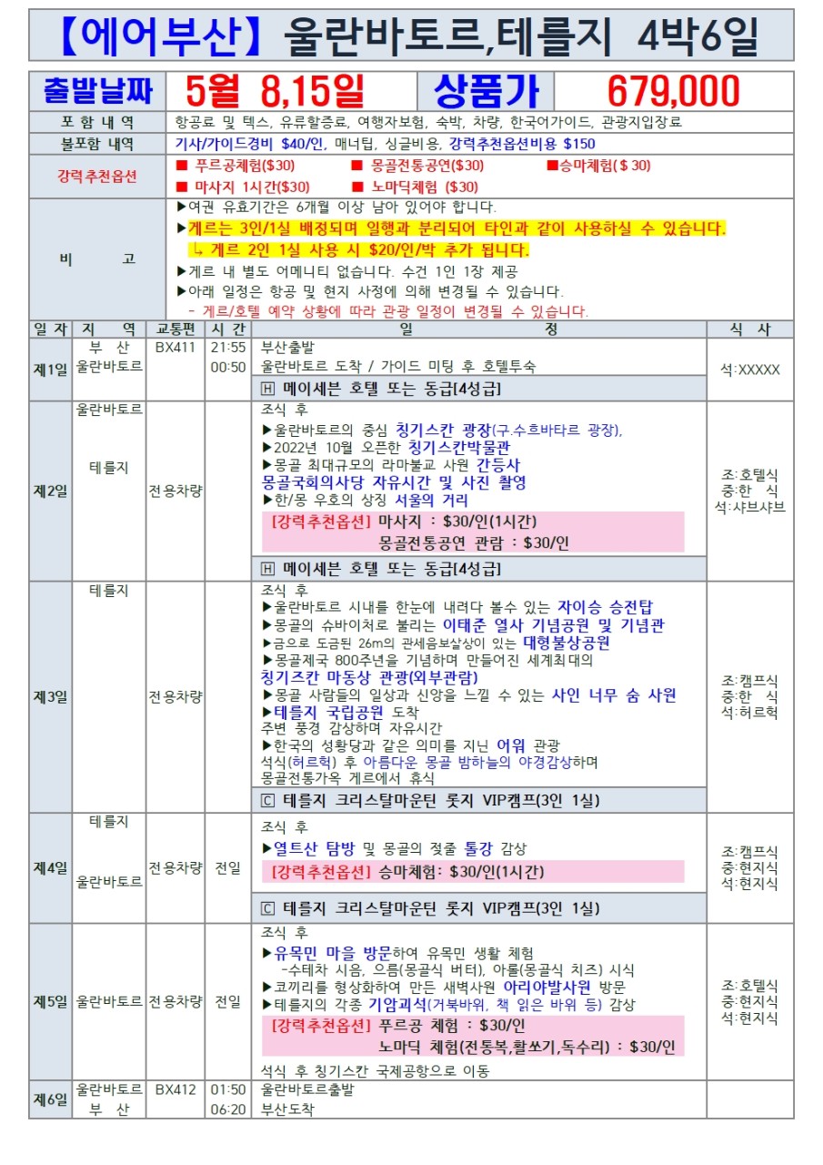 🔥선착순특가🔥[부산출발] 몽골 울란바토르/테를지 핵심일정