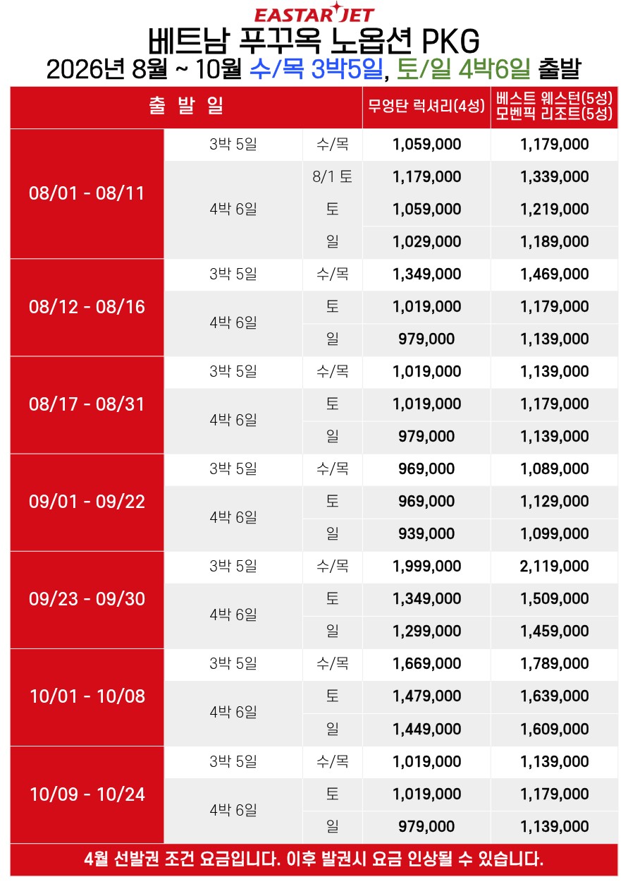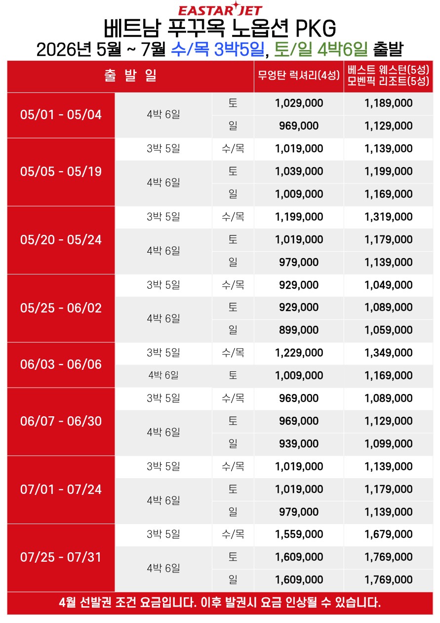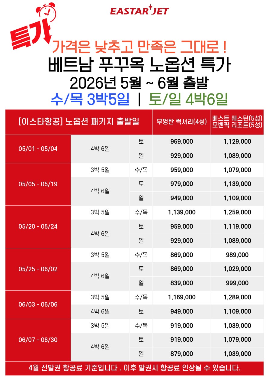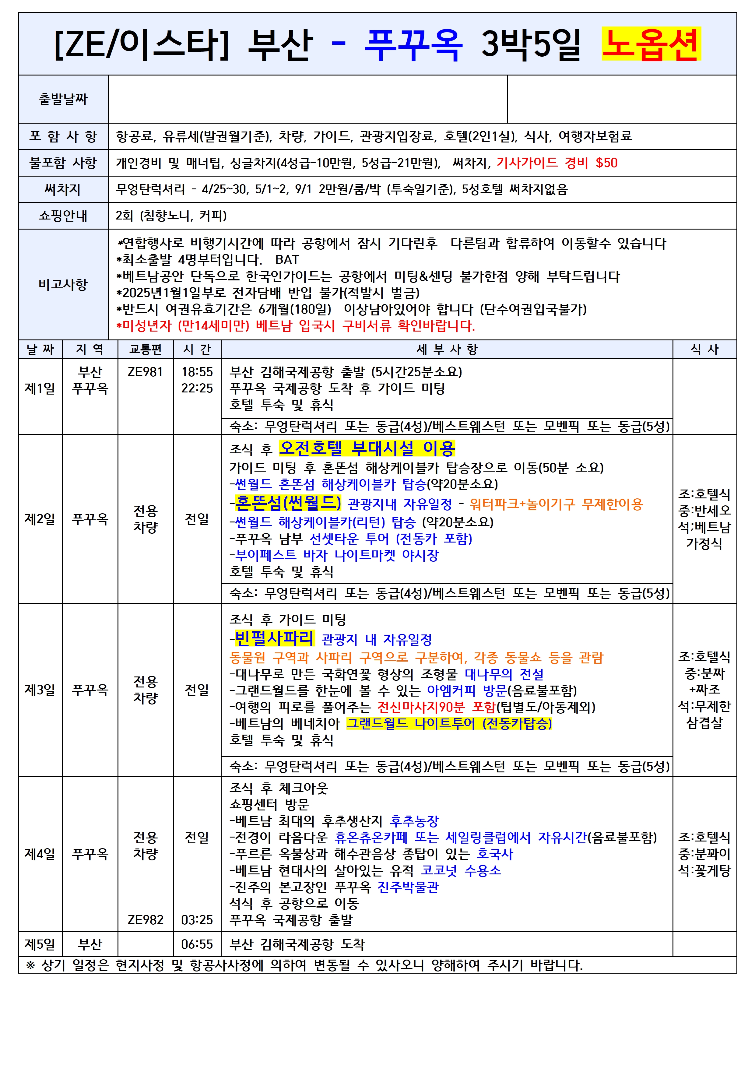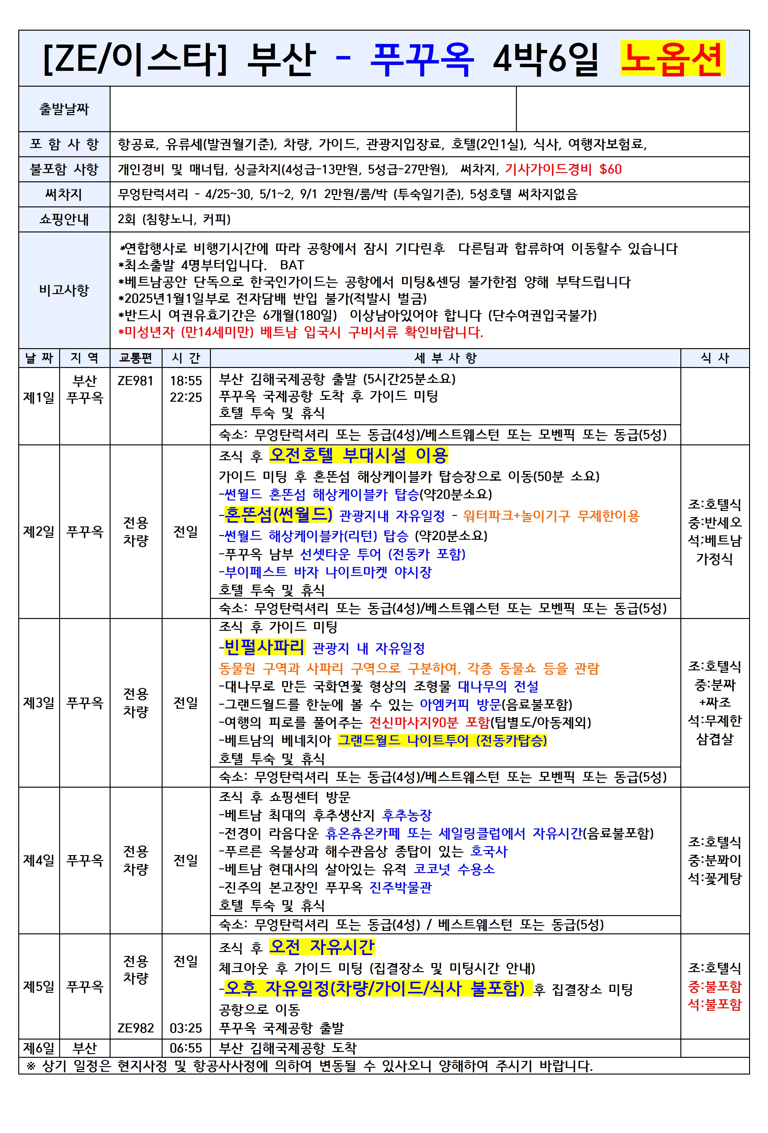[부산출발] 푸꾸옥 노옵션 관광 5일/6일 이스타항공