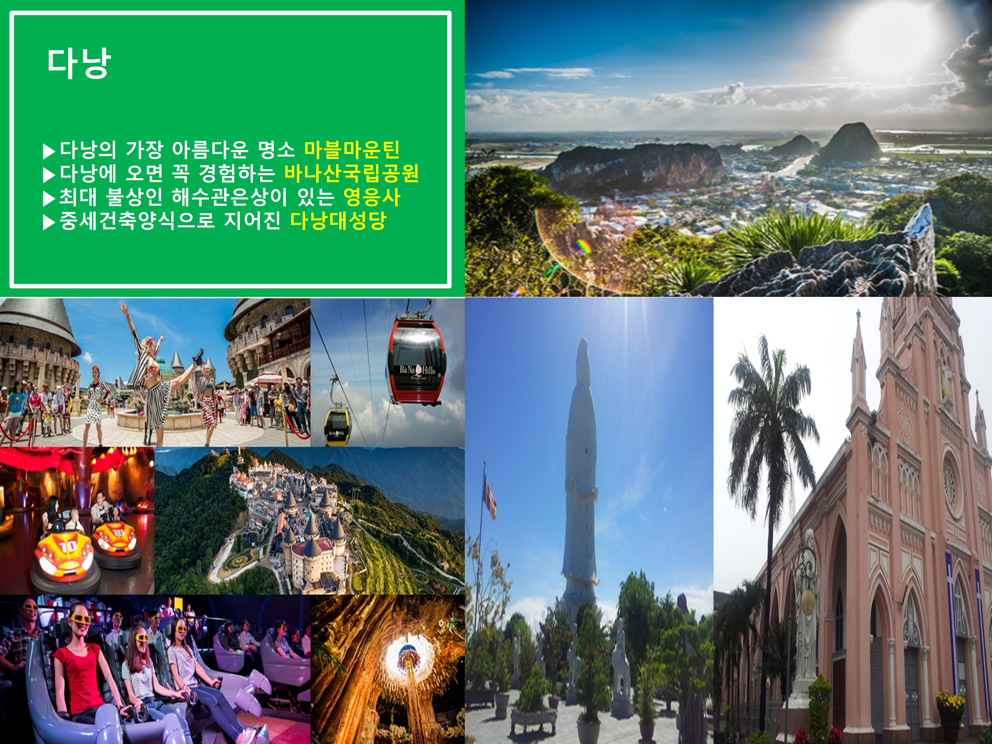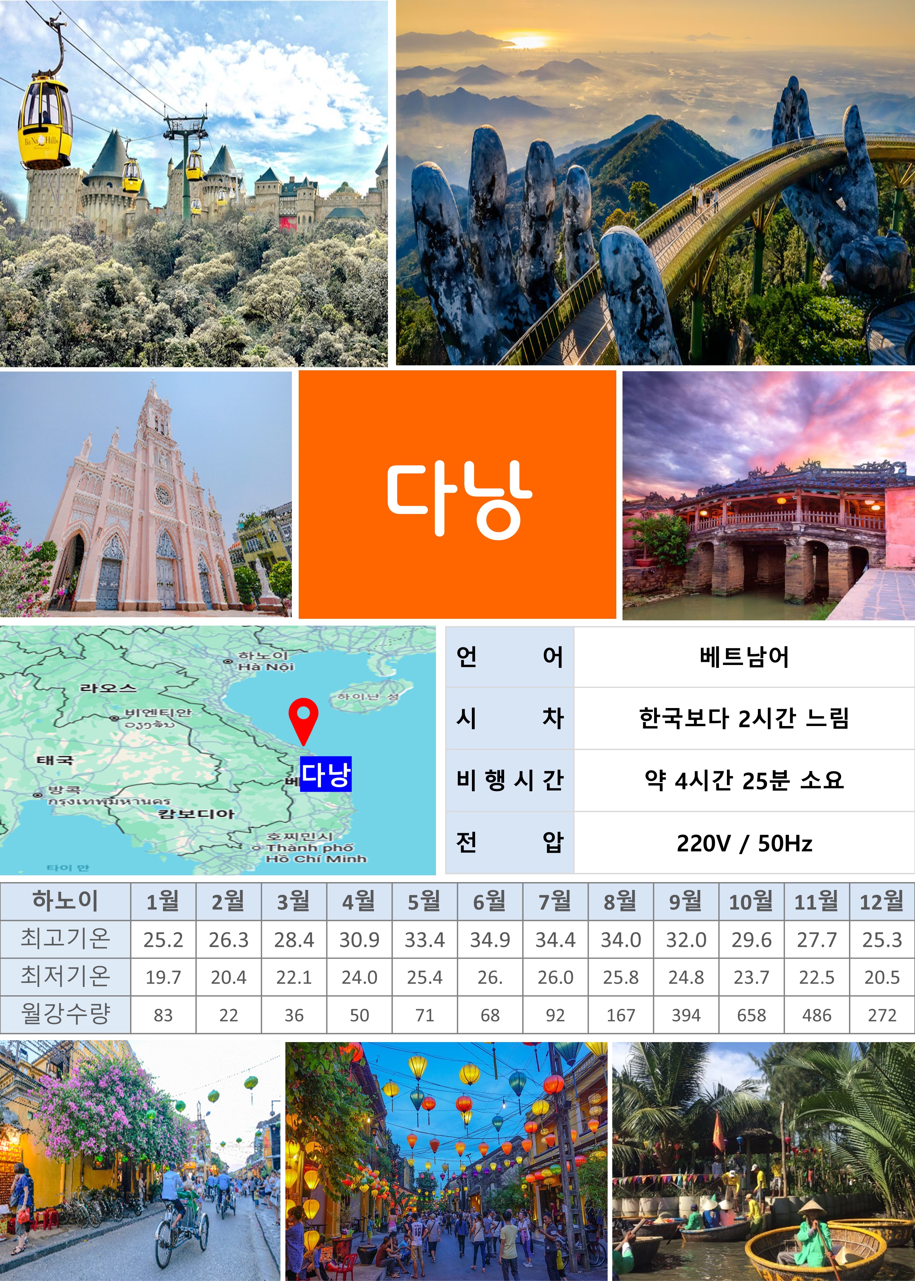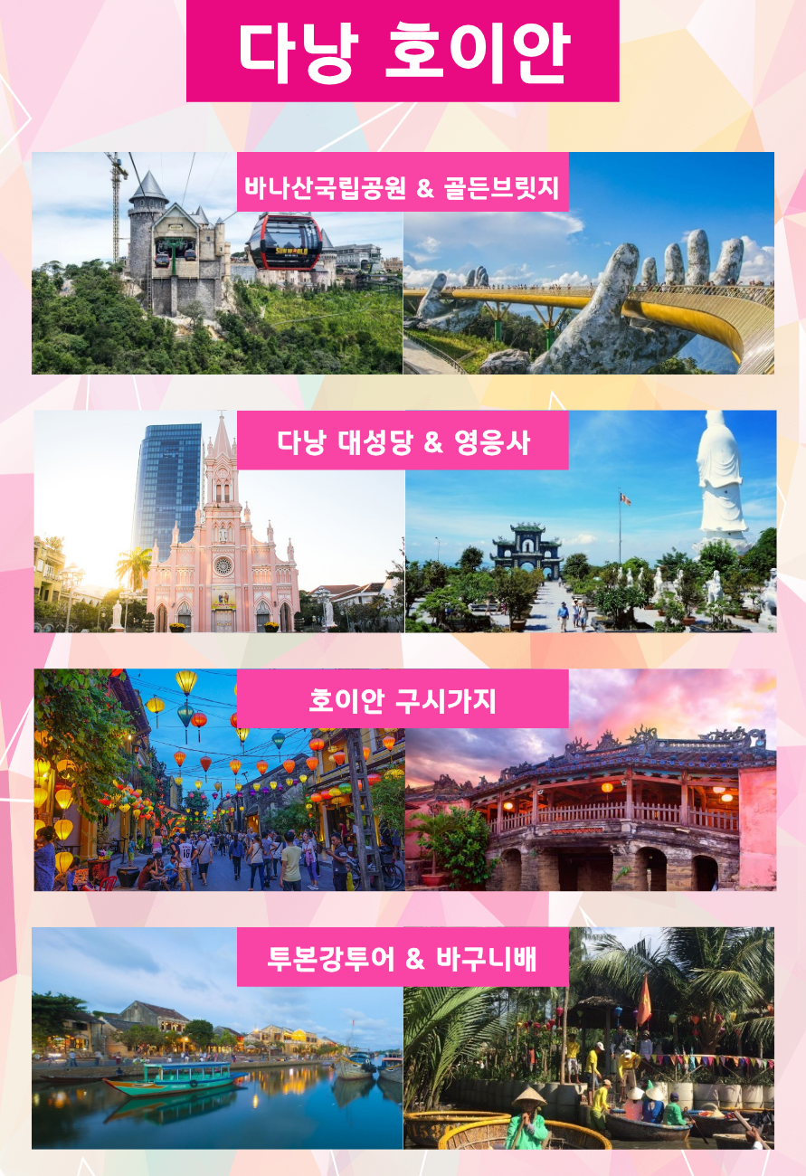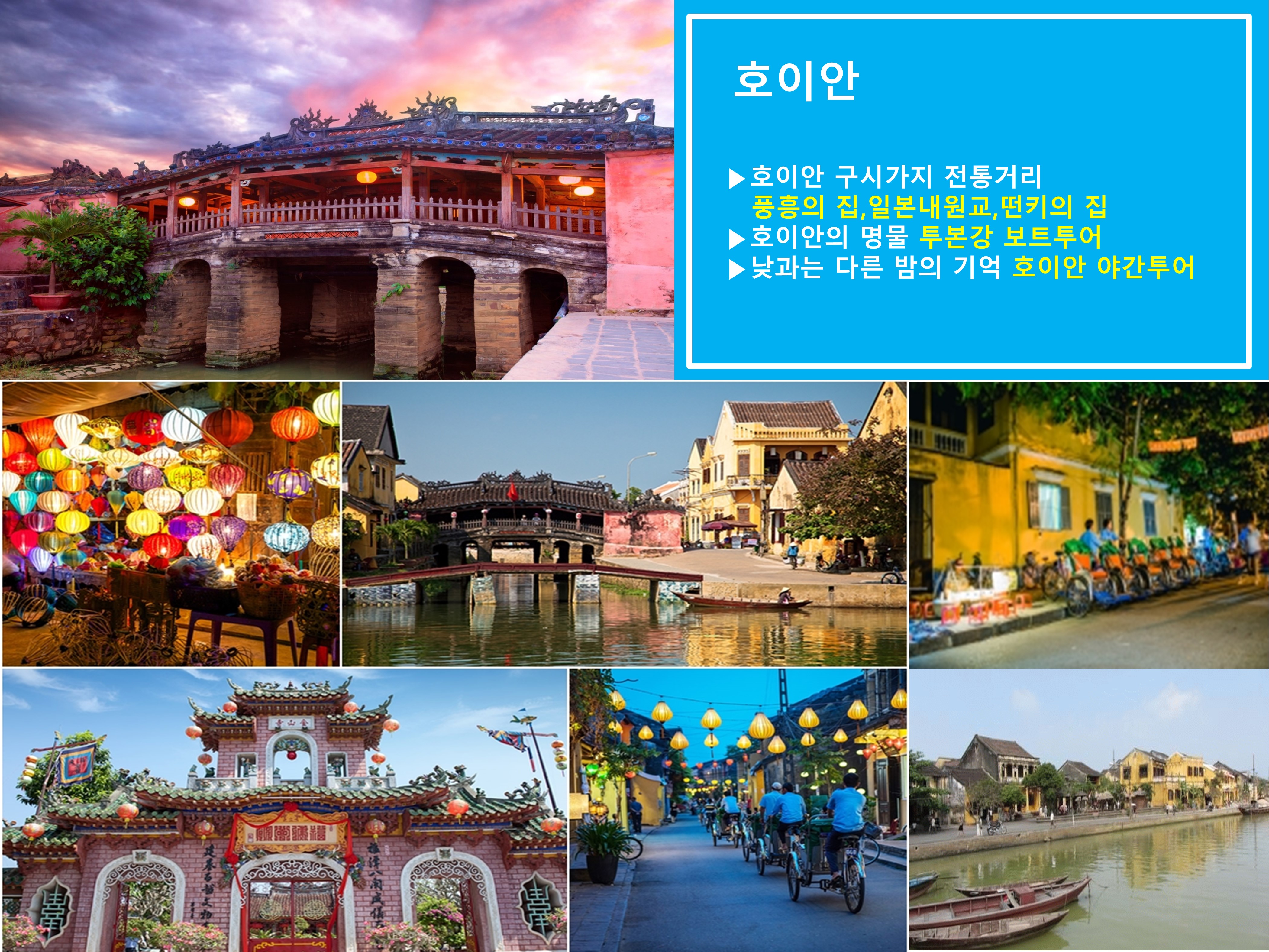 📍NO팁/NO옵션!! 📍5성급 호텔 📍전객실 과일바구니 제공 📍오전 자유시간 호텔 부대시설이용 📍전신마사지 120분&발마사지 60분(팁별도) 📍코코넛빌리지 바구니배 체험 📍호이안 야경투어(소원등+씨클로체험) 📍바나산 국립공원 📍한강유람선 탑승