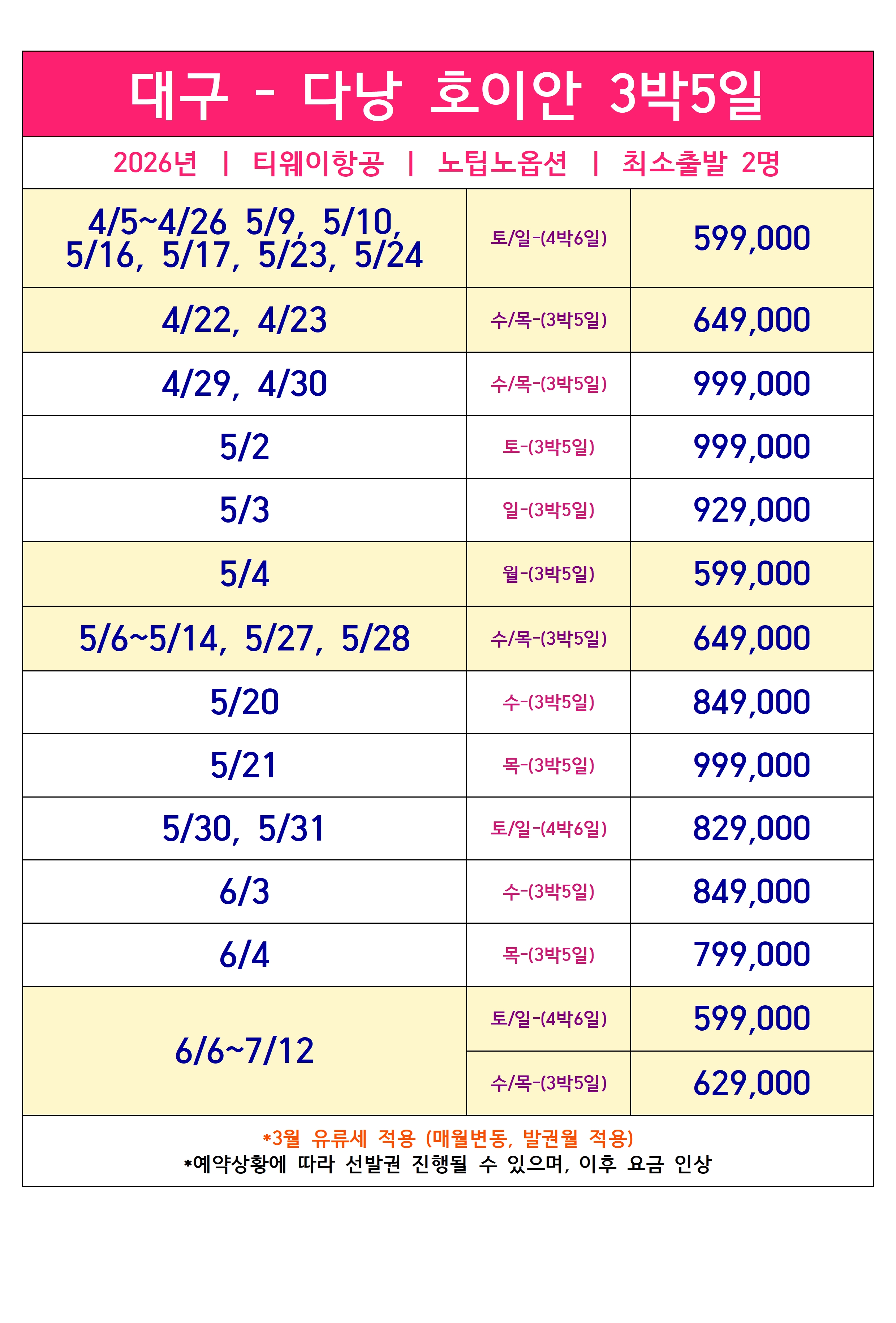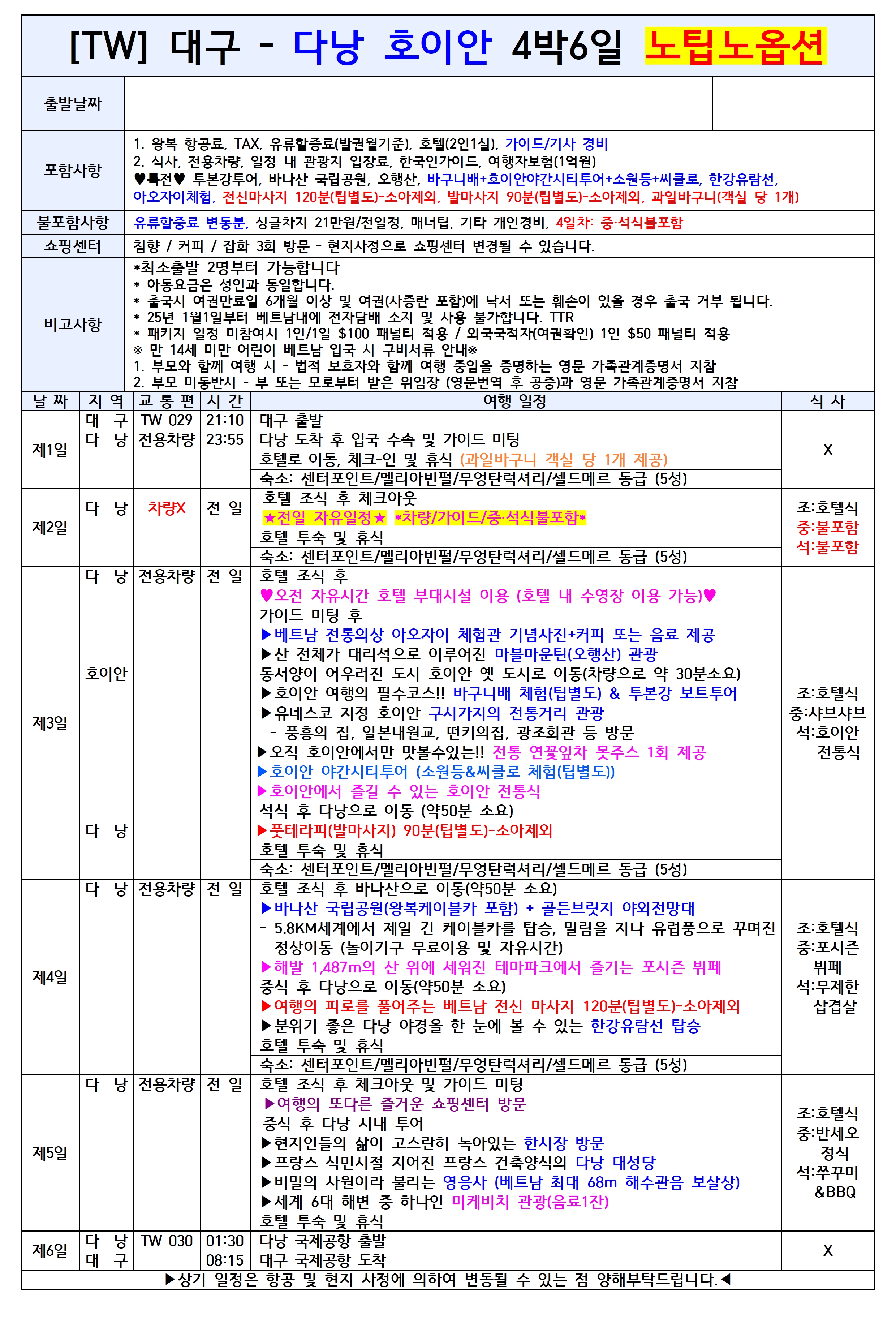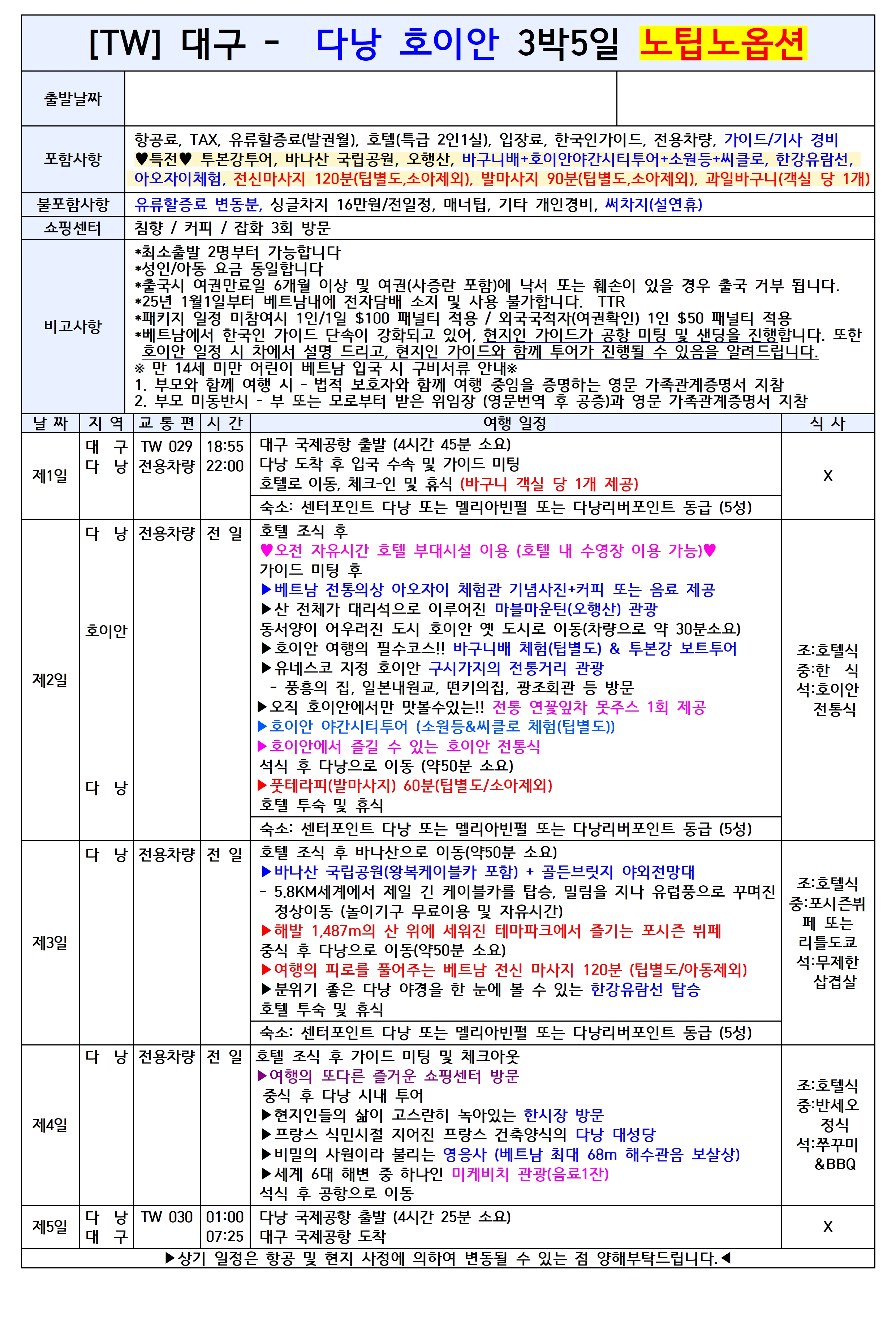 [대구출발] 다낭 호이안 5일/6일 노팁노옵션 티웨이항공