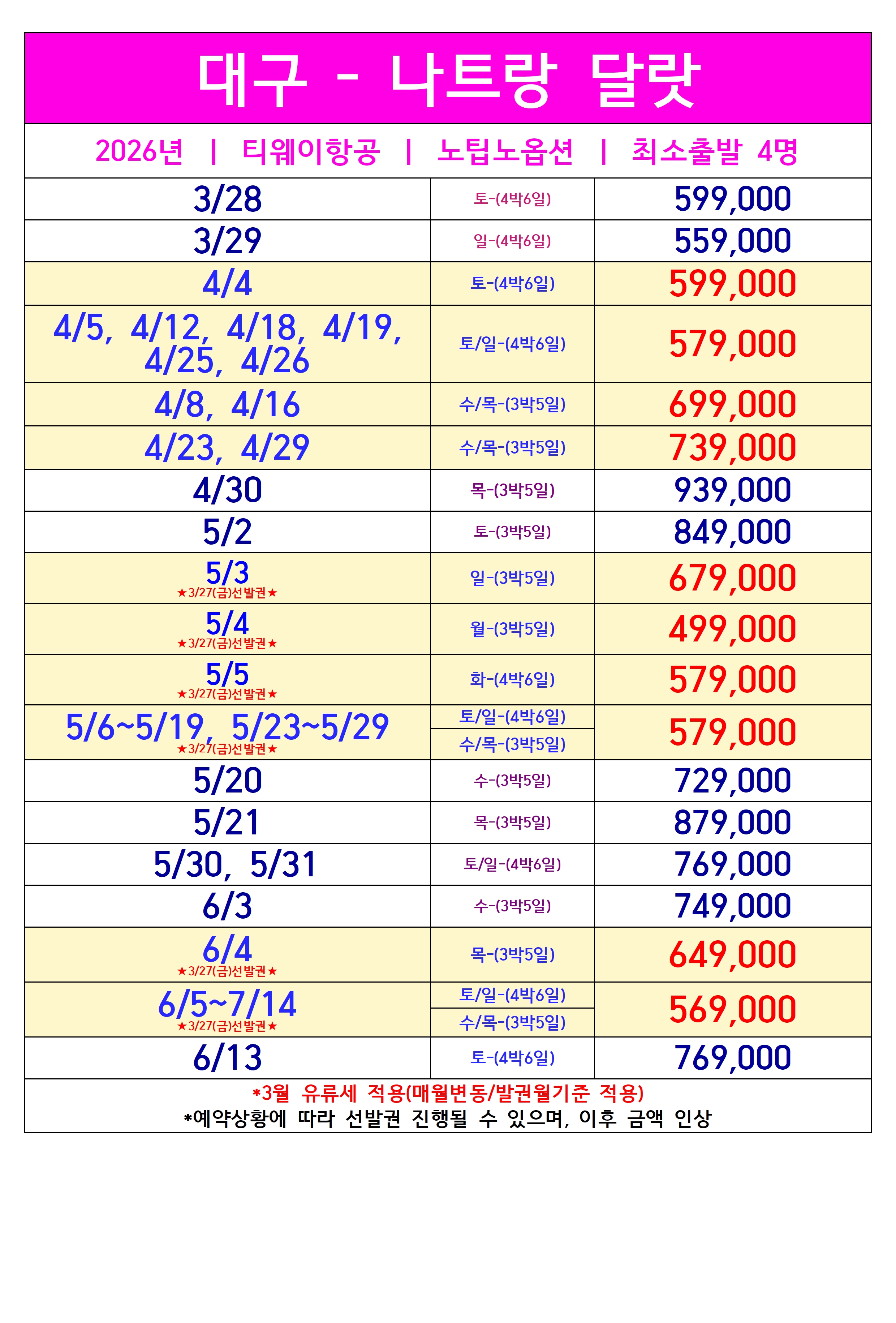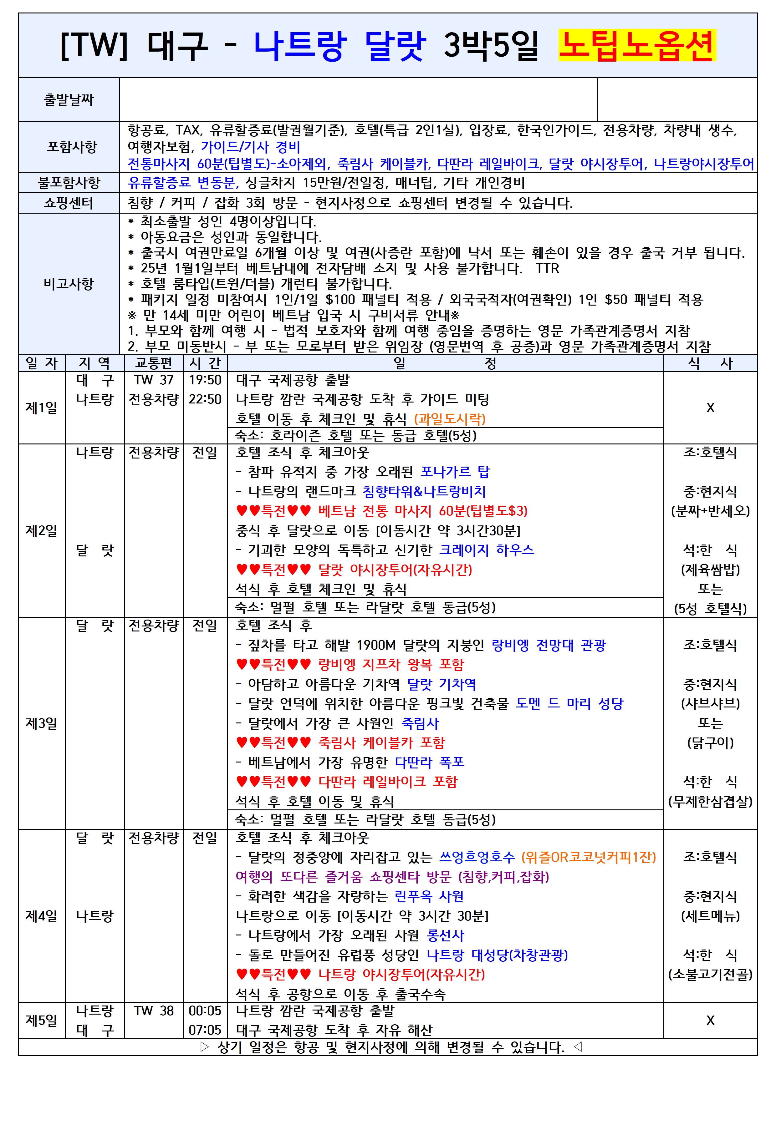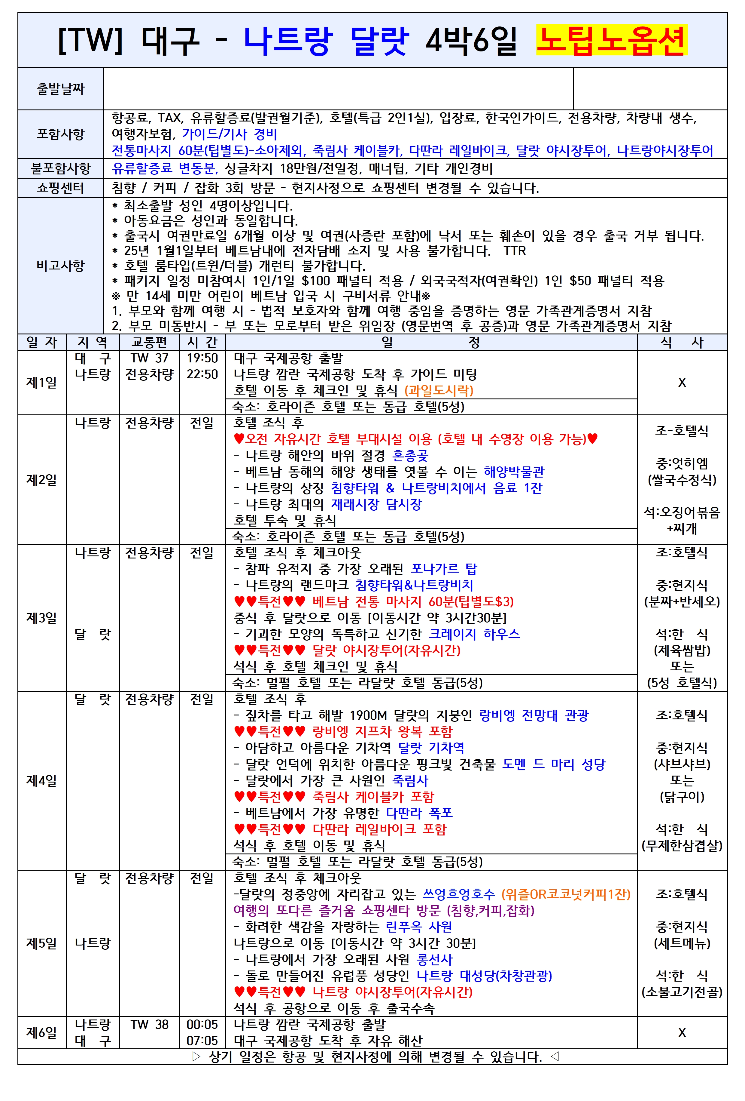 [대구출발] 나트랑 달랏 5일/6일 노팁노옵션 티웨이항공