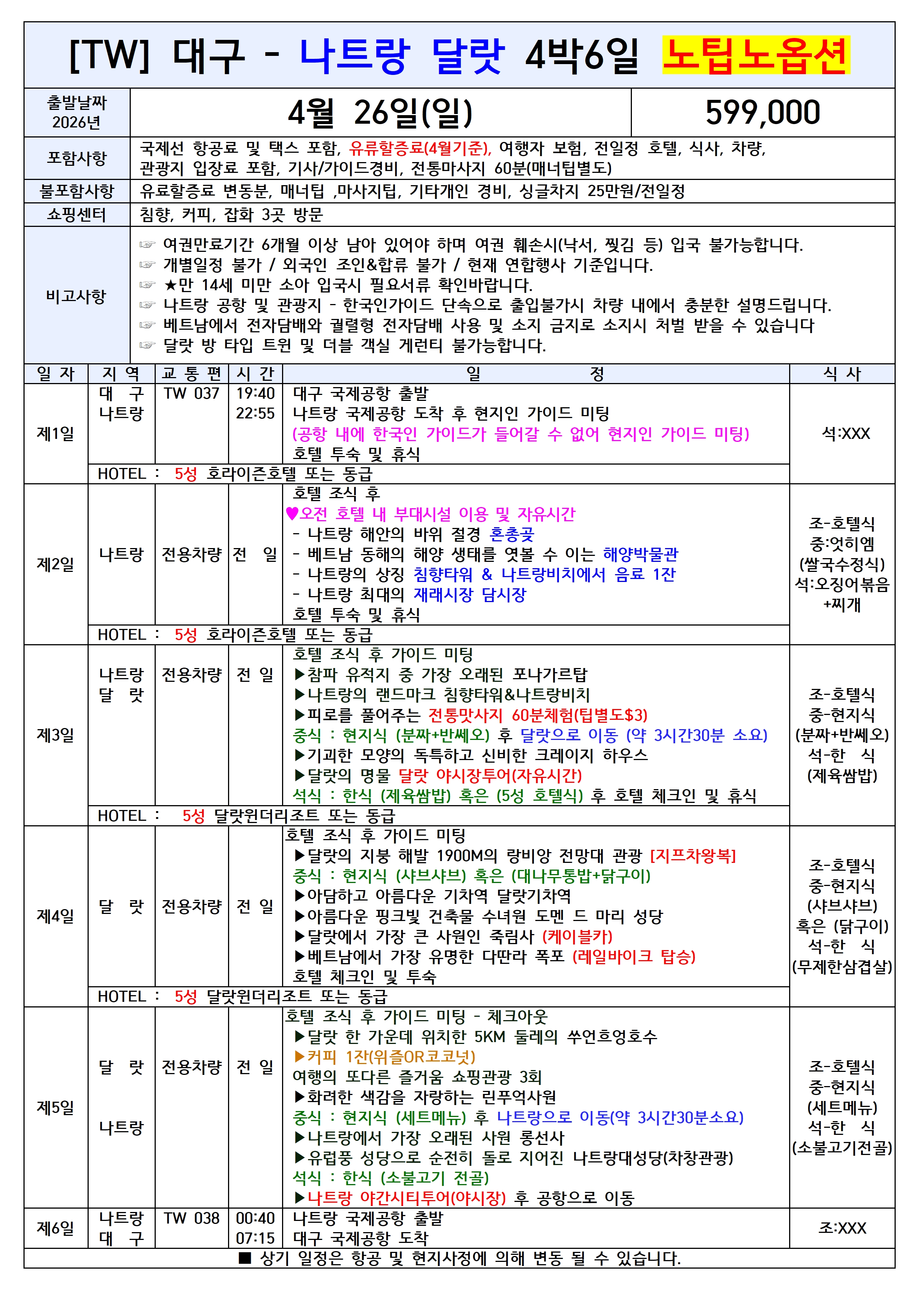 🔥선착순특가🔥대구출발 나트랑&달랏 노팁노옵션 특가