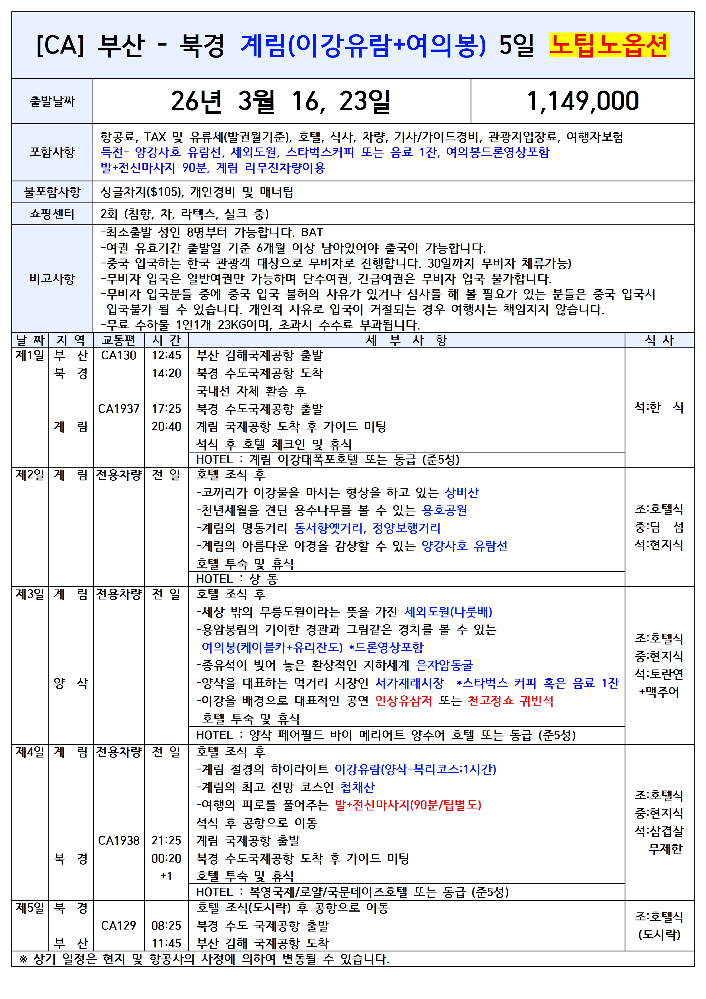 [부산출발] 북경 계림 5일 패키지 중국국제항공
