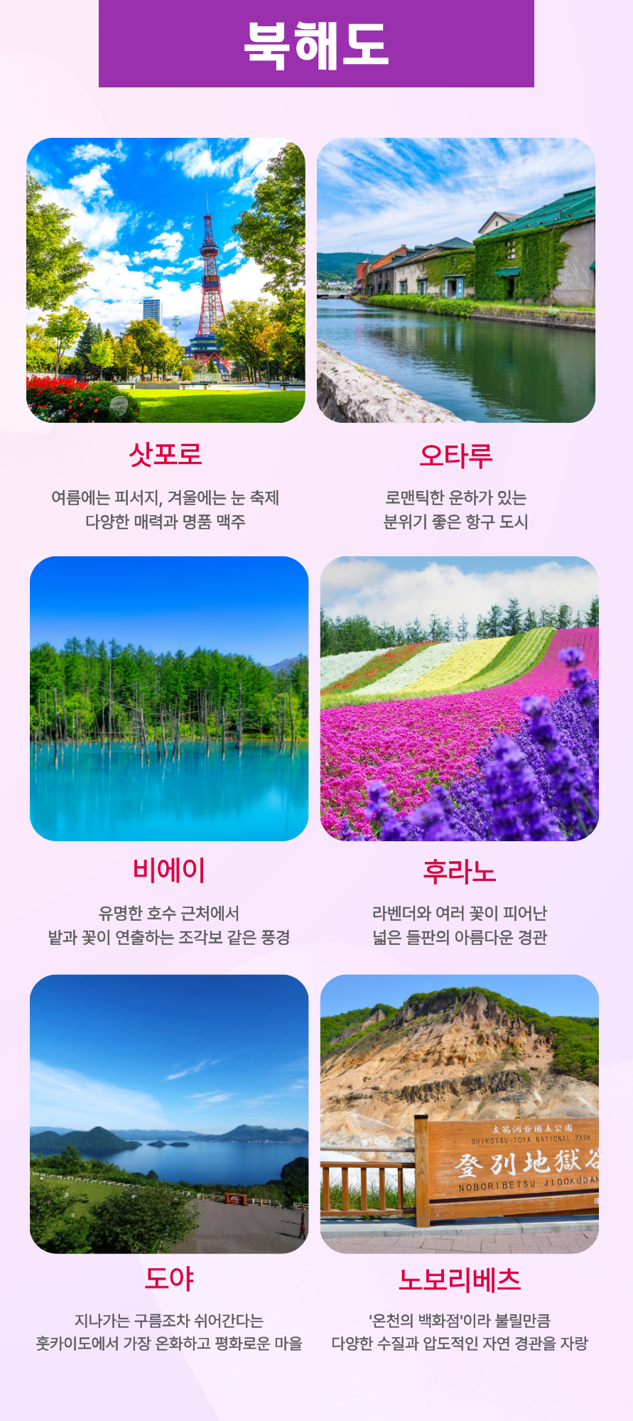 ❤️품격BA팩(온천2박)❤️ 비에이+소윤쿄+오타루+도야+노보리베츠 👍담당자추천!😎홋카이도 베스트셀러! 🌈도시+온천+자연을 한번에~ 📍온천천국 신비로운 노보리베츠 지옥계곡 📍홋카이도 3대 경관으로 아름다운 도야 호수 📍러브레터 촬영지로 로맨틱한 감성천국 오타루 📍눈의 융단에 서 있는 나무들이 늘어선 비에이 📍낭만도시 삿포로