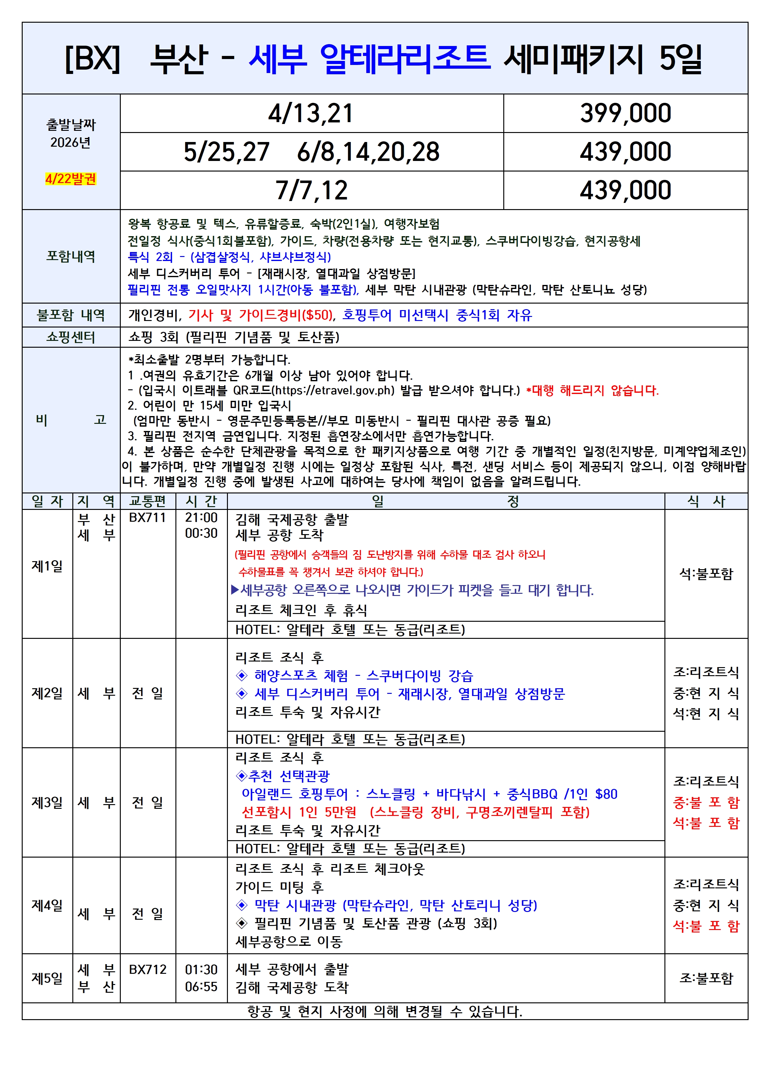 [부산출발] 세부 5일 세미패키지 알테라리조트