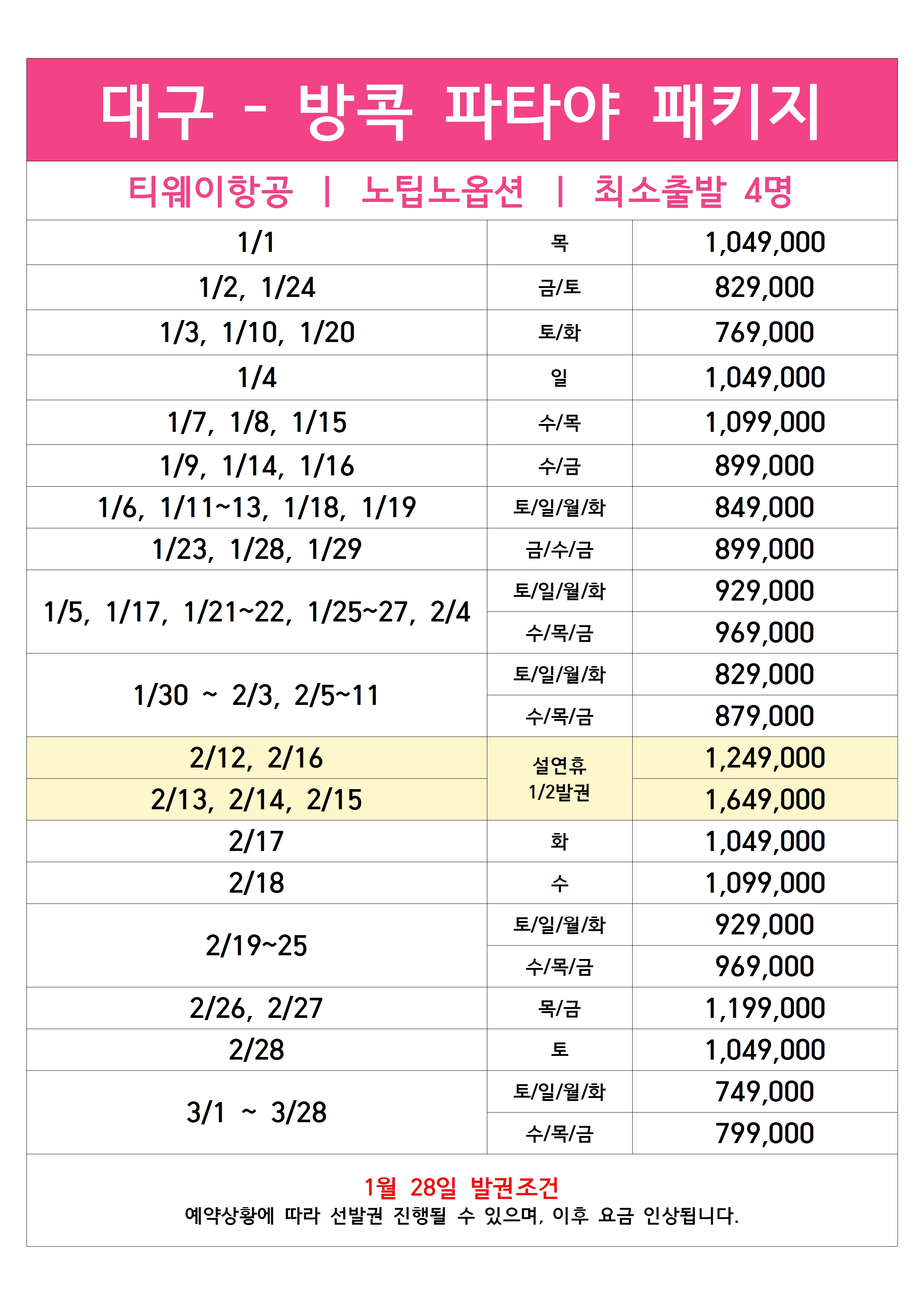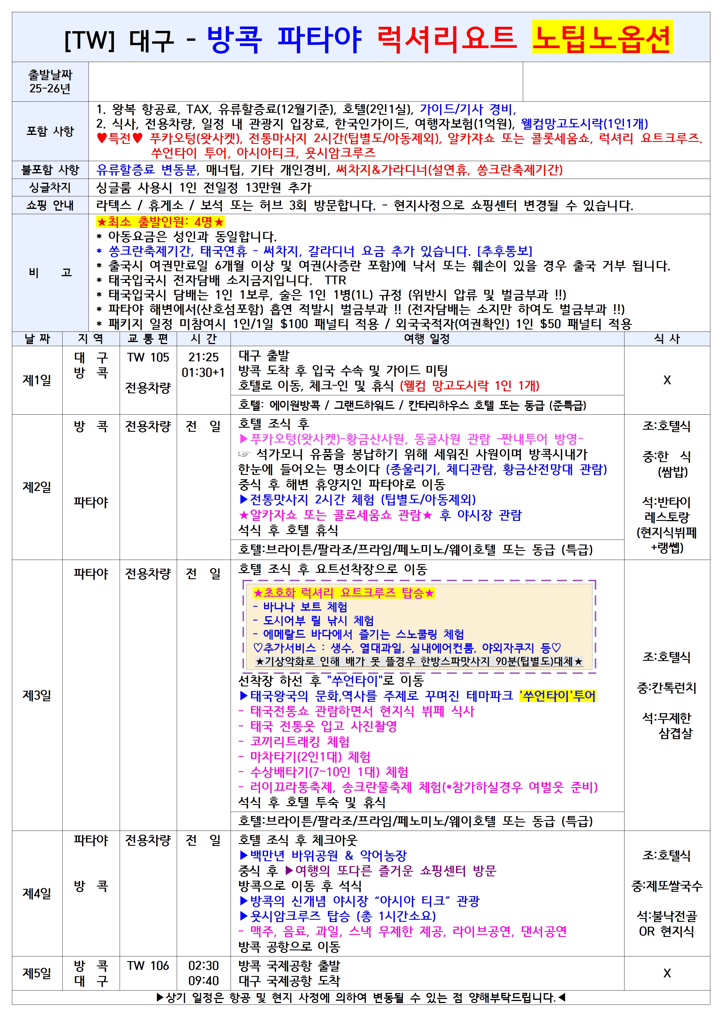 [대구출발] 방콕 파타야 노팁노옵션 티웨이항공