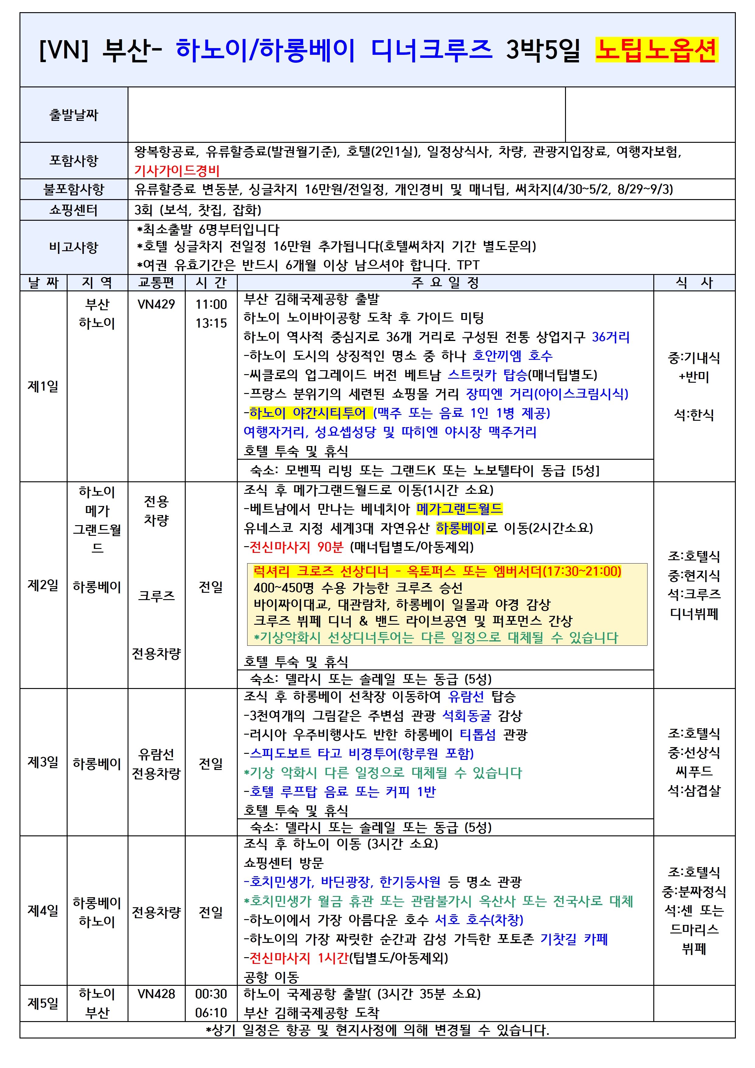 [부산출발] 하노이 하롱베이 3박5일 노팁노옵션/크루즈디너/그랜드월드 VN