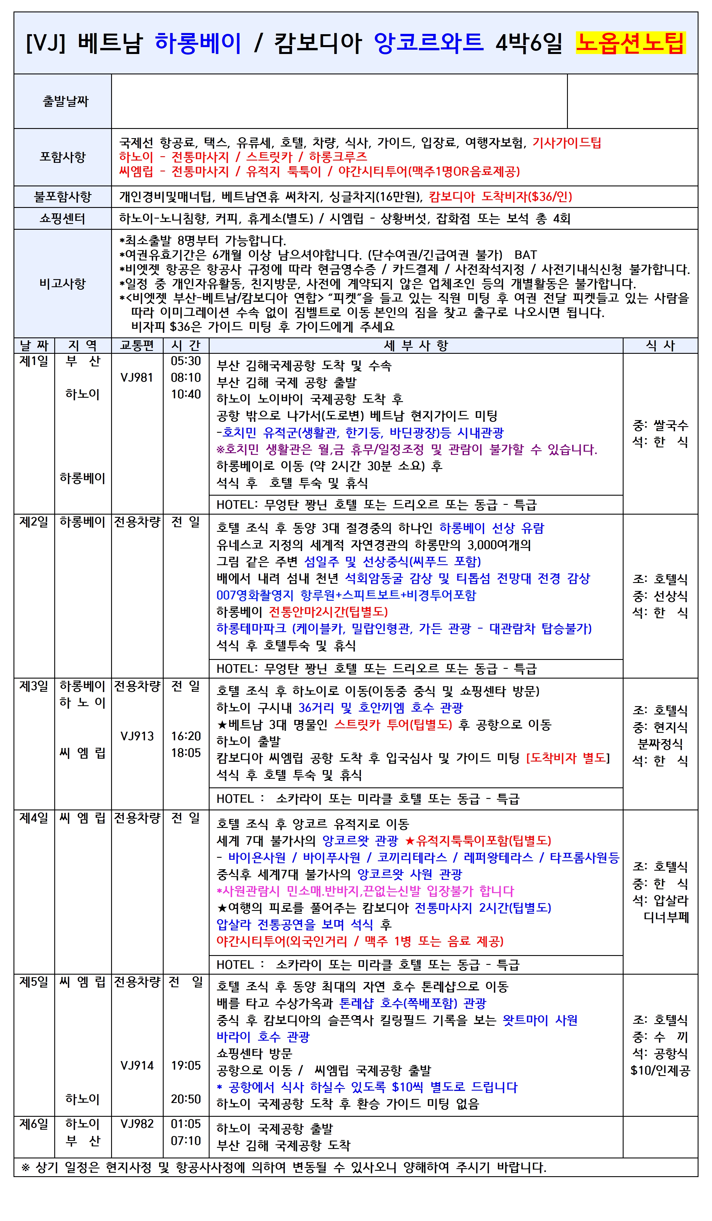 [부산출발] 베트남 하노이 하롱베이 & 캄보디아 앙코르와트 6일 노팁노옵션 비엣젯항공