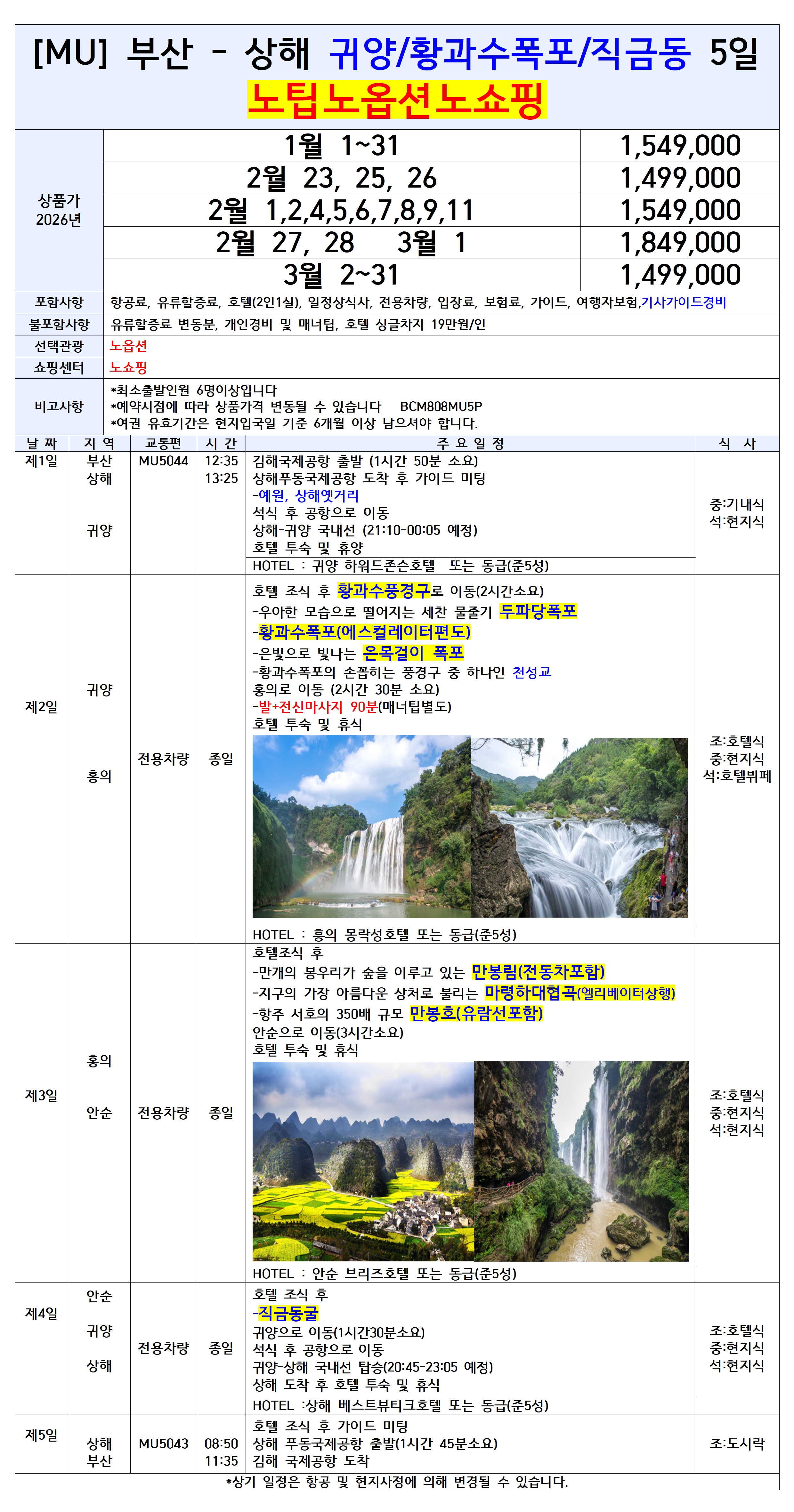 📍노쇼핑 / 노옵션 / 노팁(현지 추가경비 0원) 📍아시아 최대 폭포 황과수 폭포 관광 📍만개의 봉우리가 숲을 이룬 아름다운 자연 만봉림 관광 📍상해 - 귀양 국내선 이용 📍세계 월드 체인 2박 포함! 편안한 준5성 숙박 📍여행의 즐거움을 더할 호텔뷔페 특식 1회 포함 📍여행의 피로를 풀어주는 발+전신마사지 포함(매너팁 없음, 포함) 📍종유 동굴의 왕! 천하제일동 "직금동" 포함