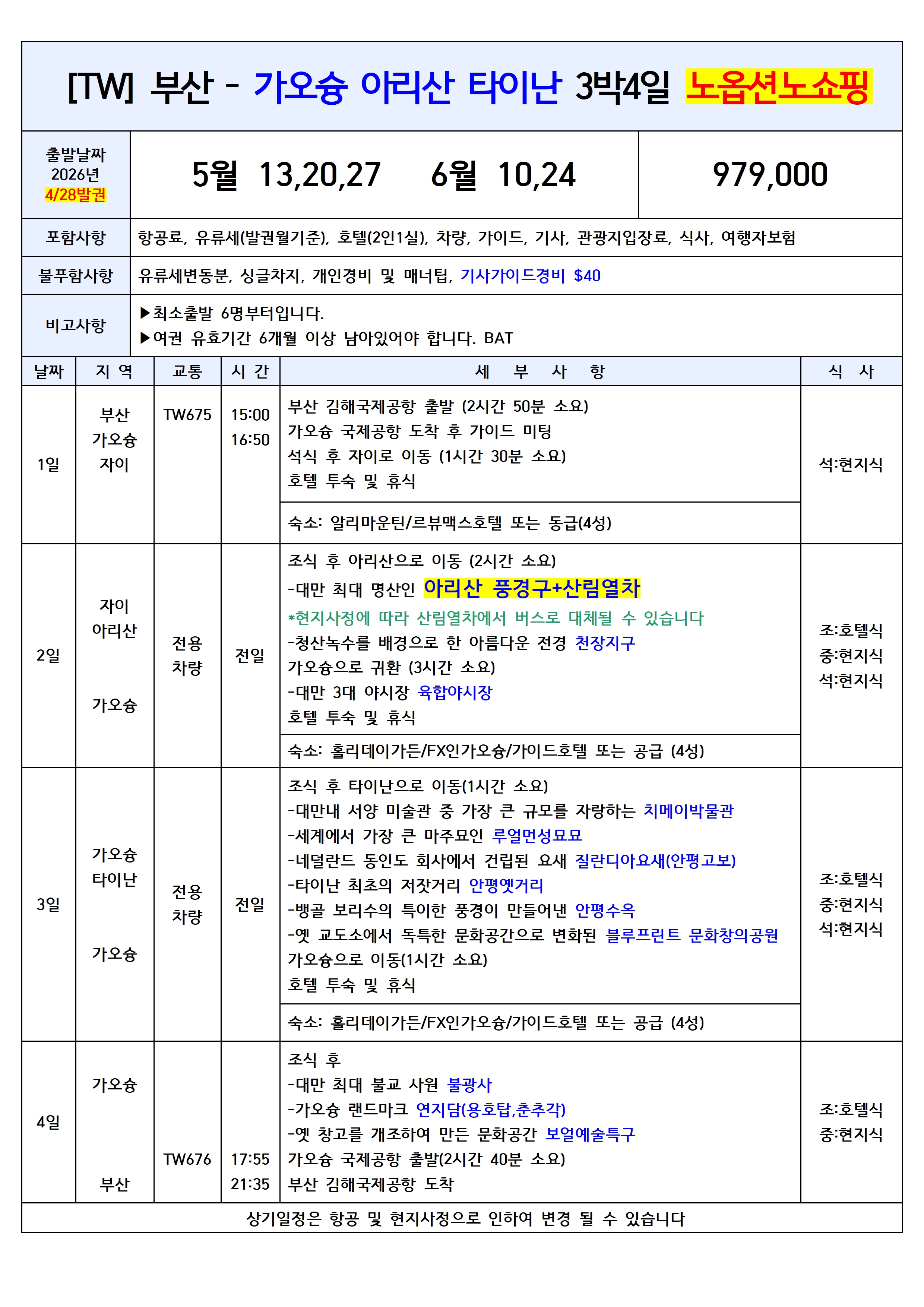 💥선착순특가💥[부산출발] 대만 타이페이/단수이/가오슝/아리산