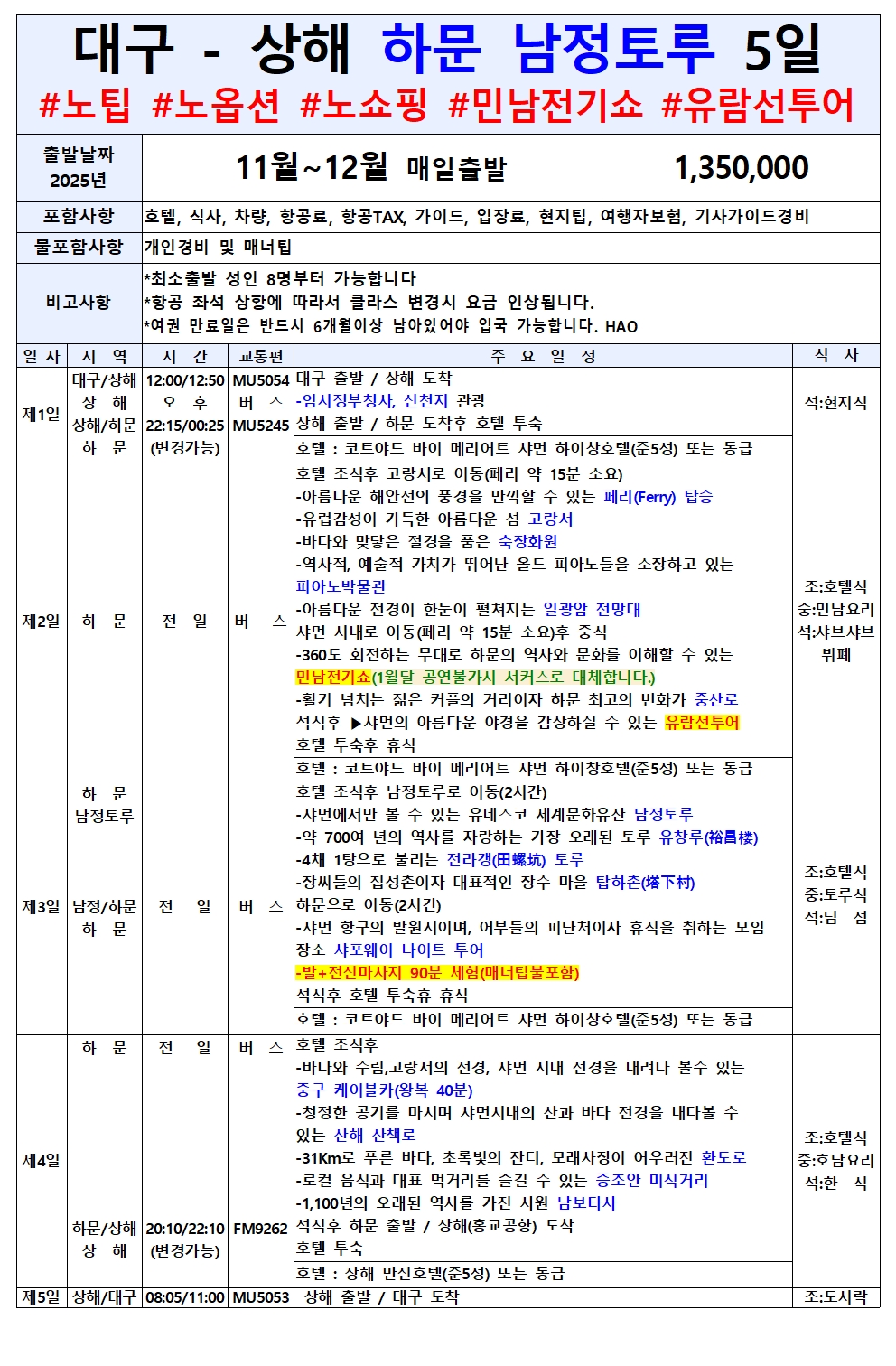 [대구출발] 상해 하문 남정토루 5일 노팁노옵션노쇼핑