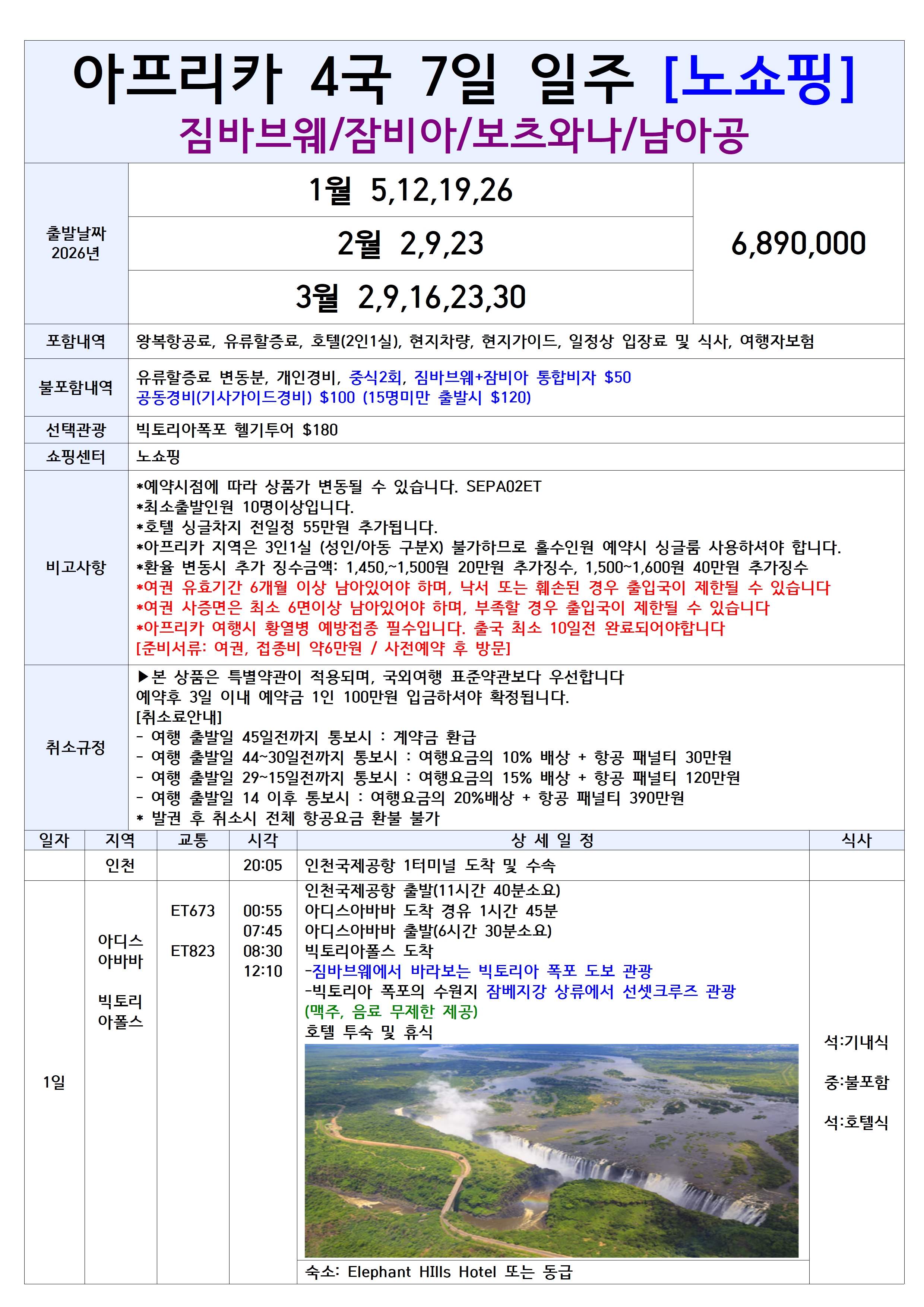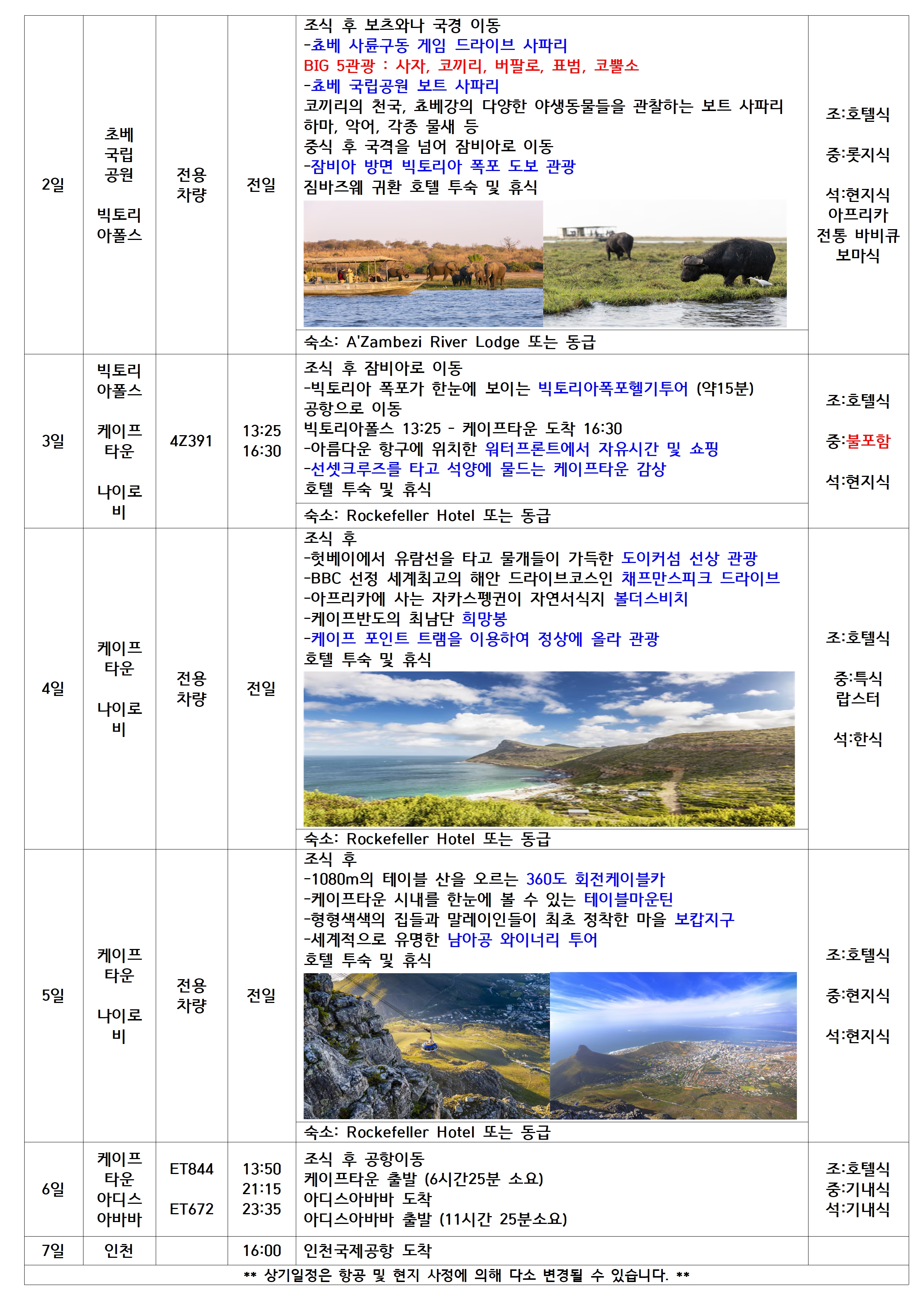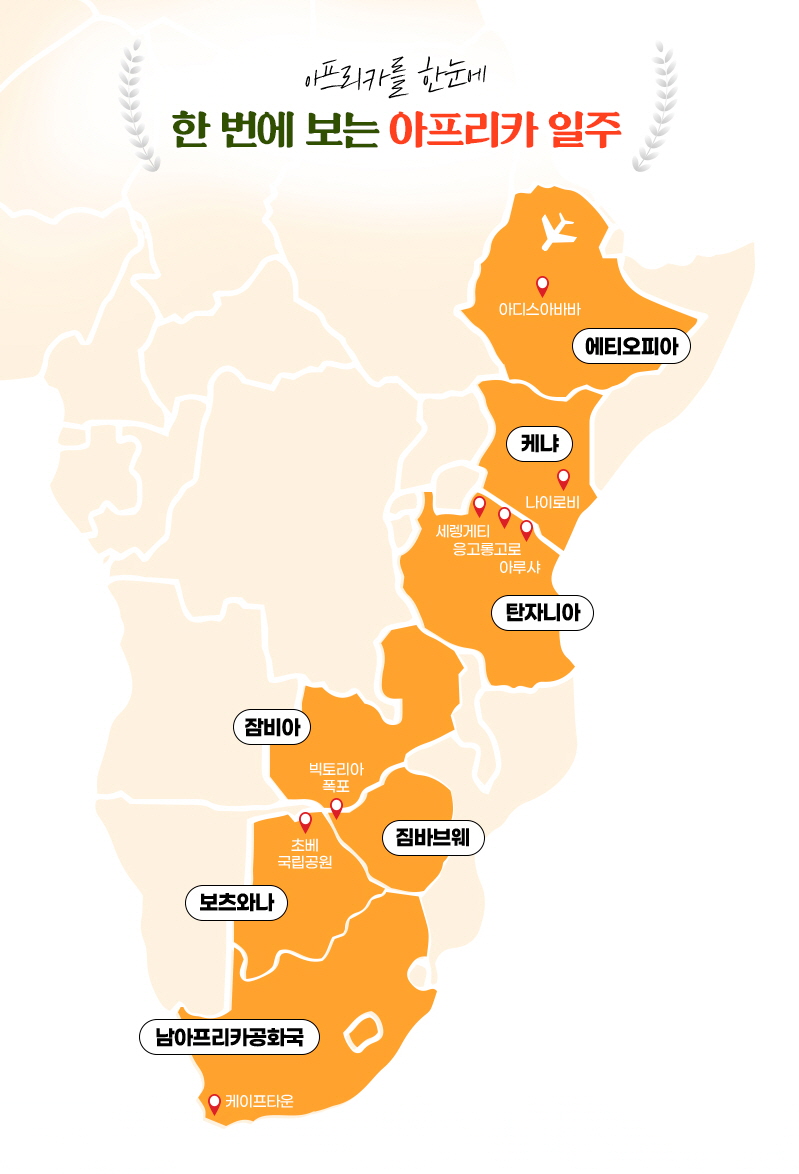 인천 → 아디스아바바 → 빅토리아폴스 → 케이프타운 → 아디스아바바 → 인천