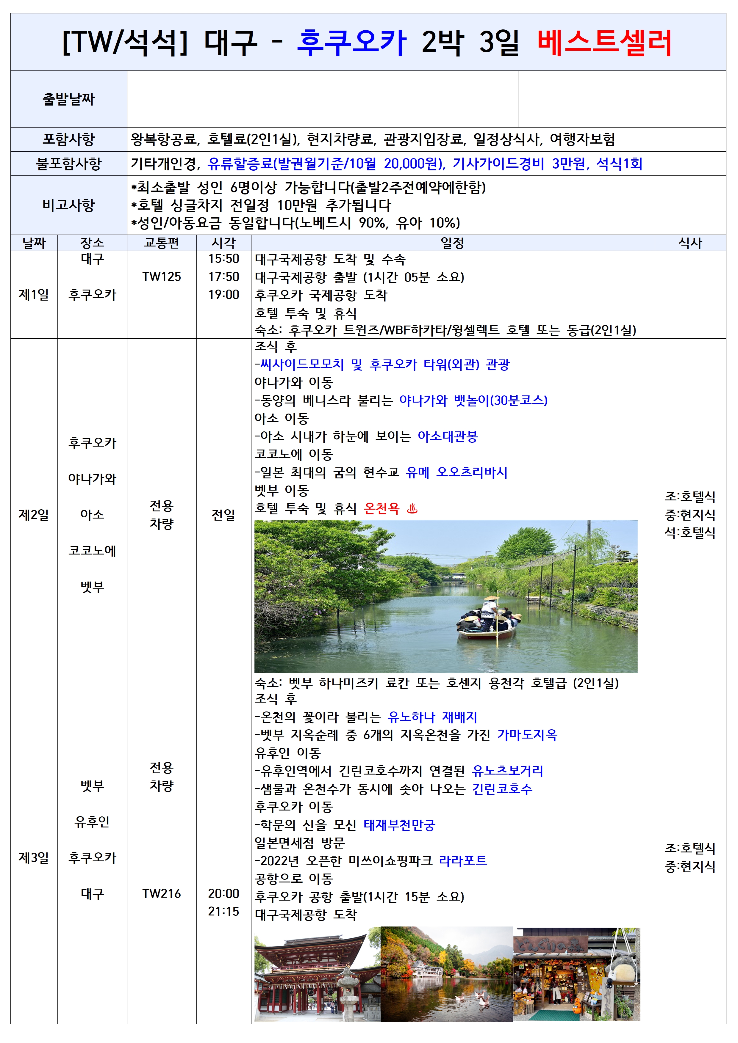 [대구출발] 후쿠오카 유후인 아소 야나가와뱃놀이 3일 석석패턴 티웨이항공
