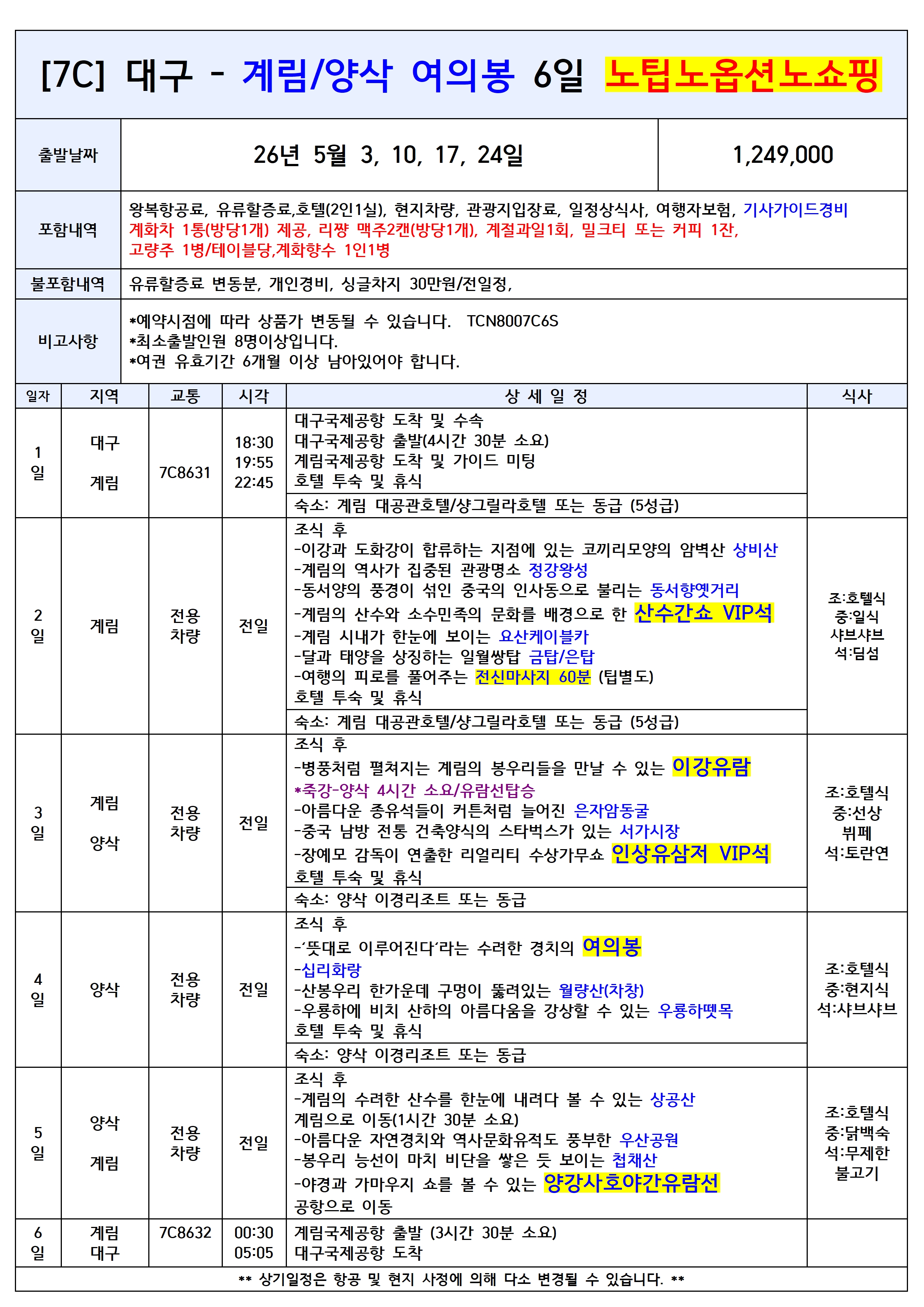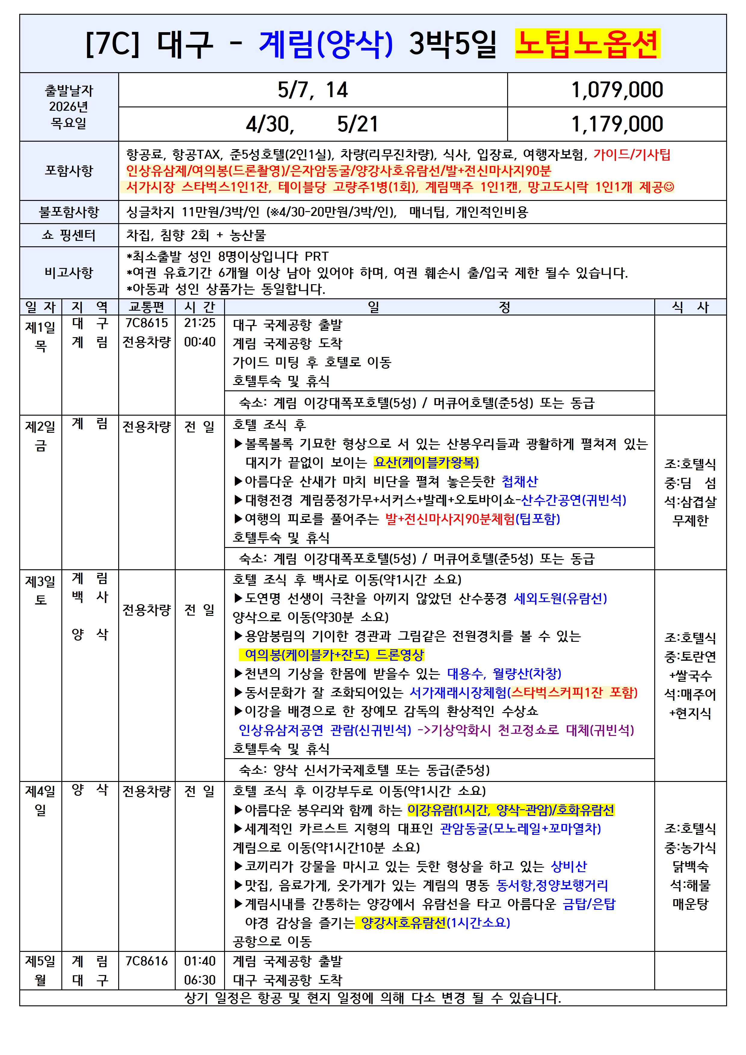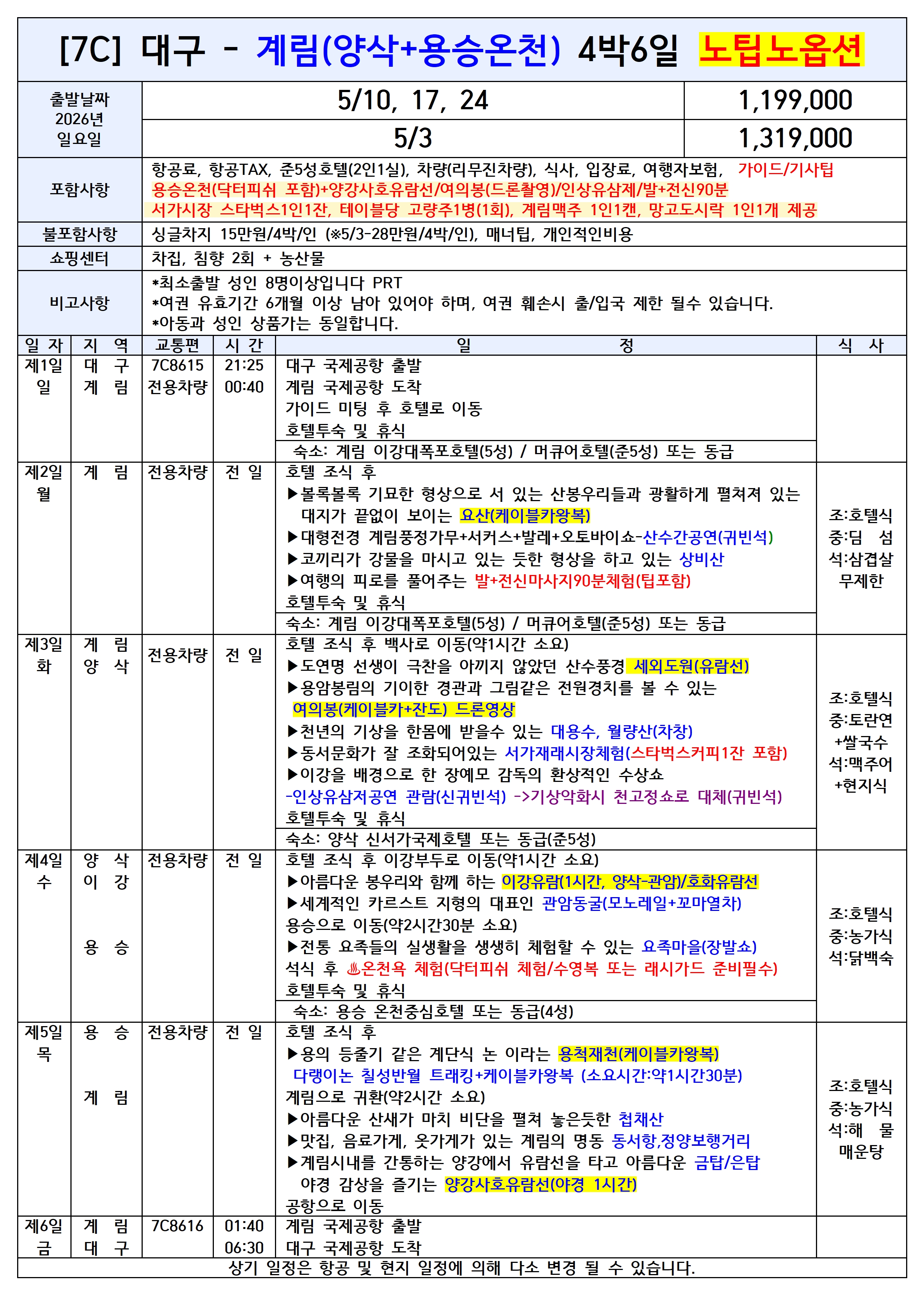桂林山水甲天下(계림산수갑천하) "계림(桂林)의 산수는 하늘 아래 제일이다" ❤대구↔계림 직항 전세기 상품❤ ✈ 대구에서 계림 직항으로 즐기는 산수갑천하 여행! 🛫 2026년 4월 30일 ~ 5월 24일(총8항차) 🛫 목요일 3박5일 / 일요일 4박6일 운항 ✈ 대구-계림 7C8615 21:25-00:40 ✈ 계림-대구 7C8616 01:40-06:30