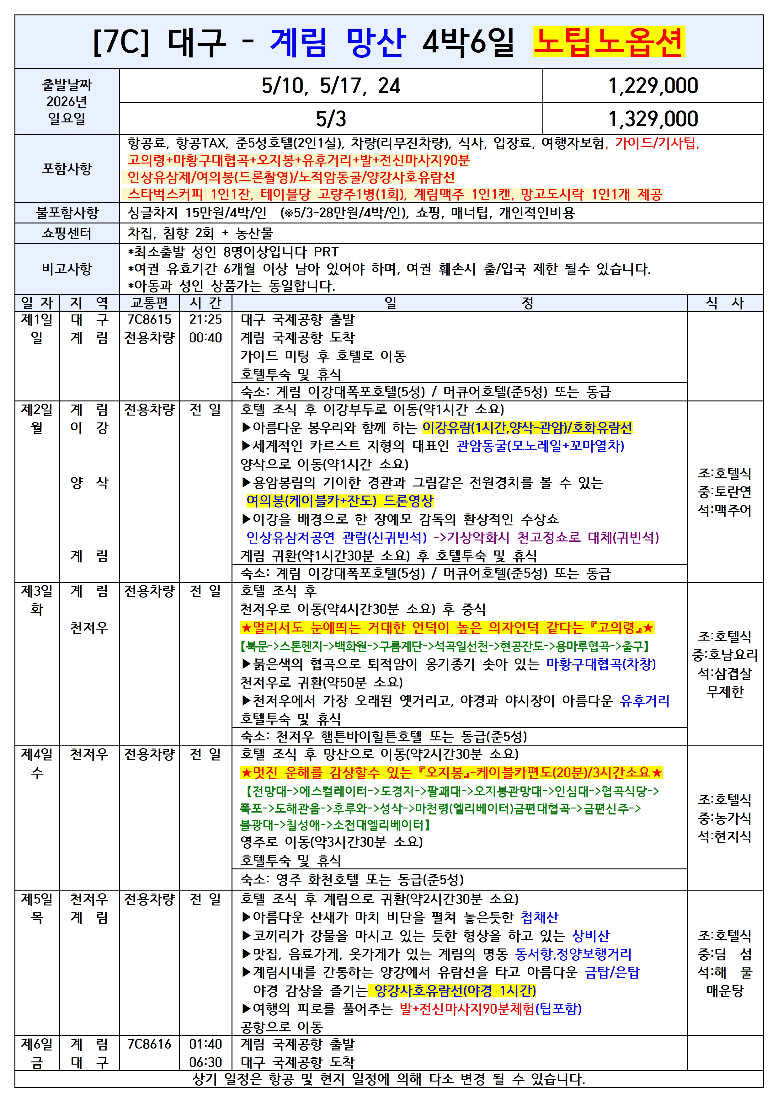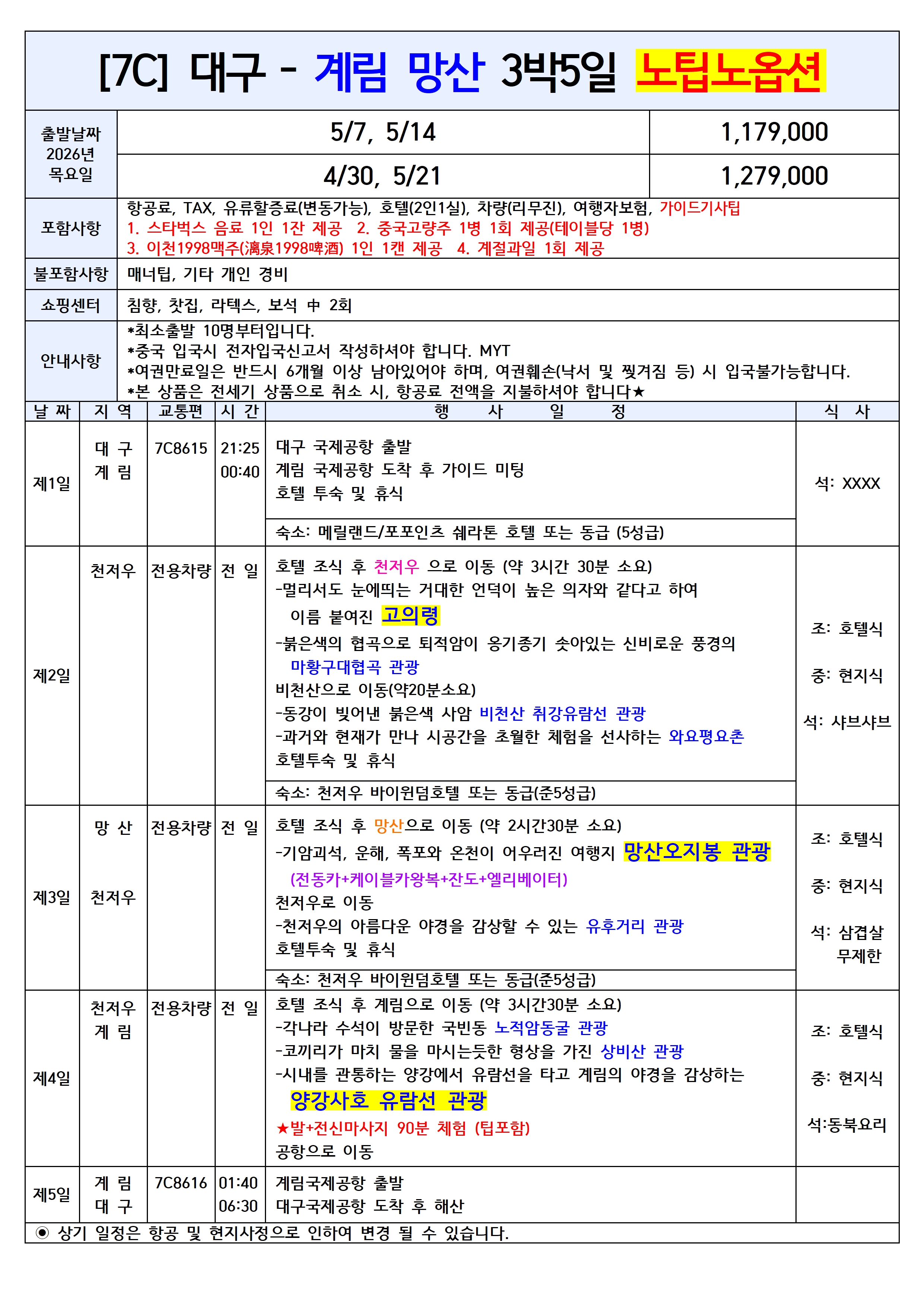 [대구출발] 계림 5일/6일 노팁노옵션/노쇼핑 전세기 제주항공