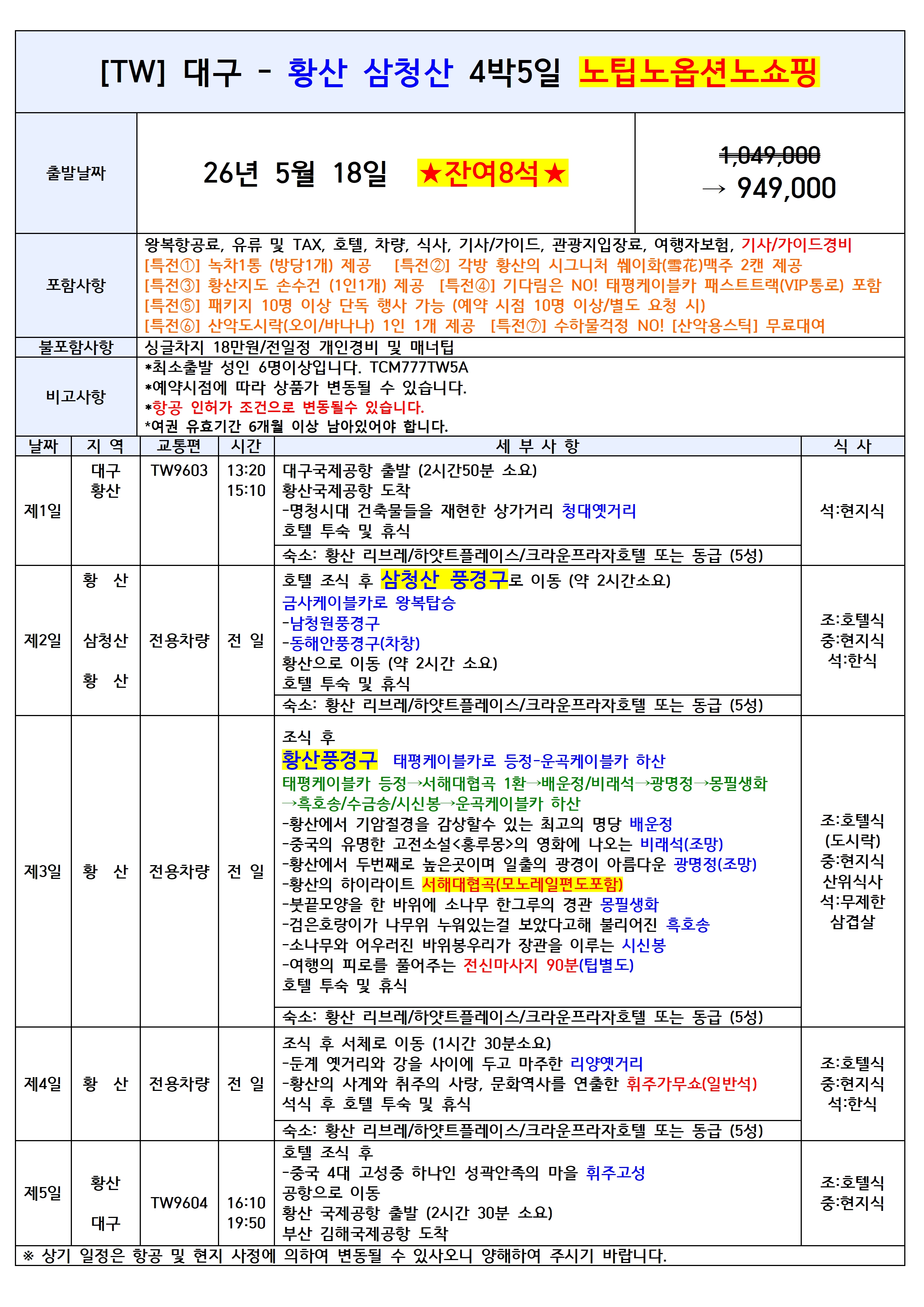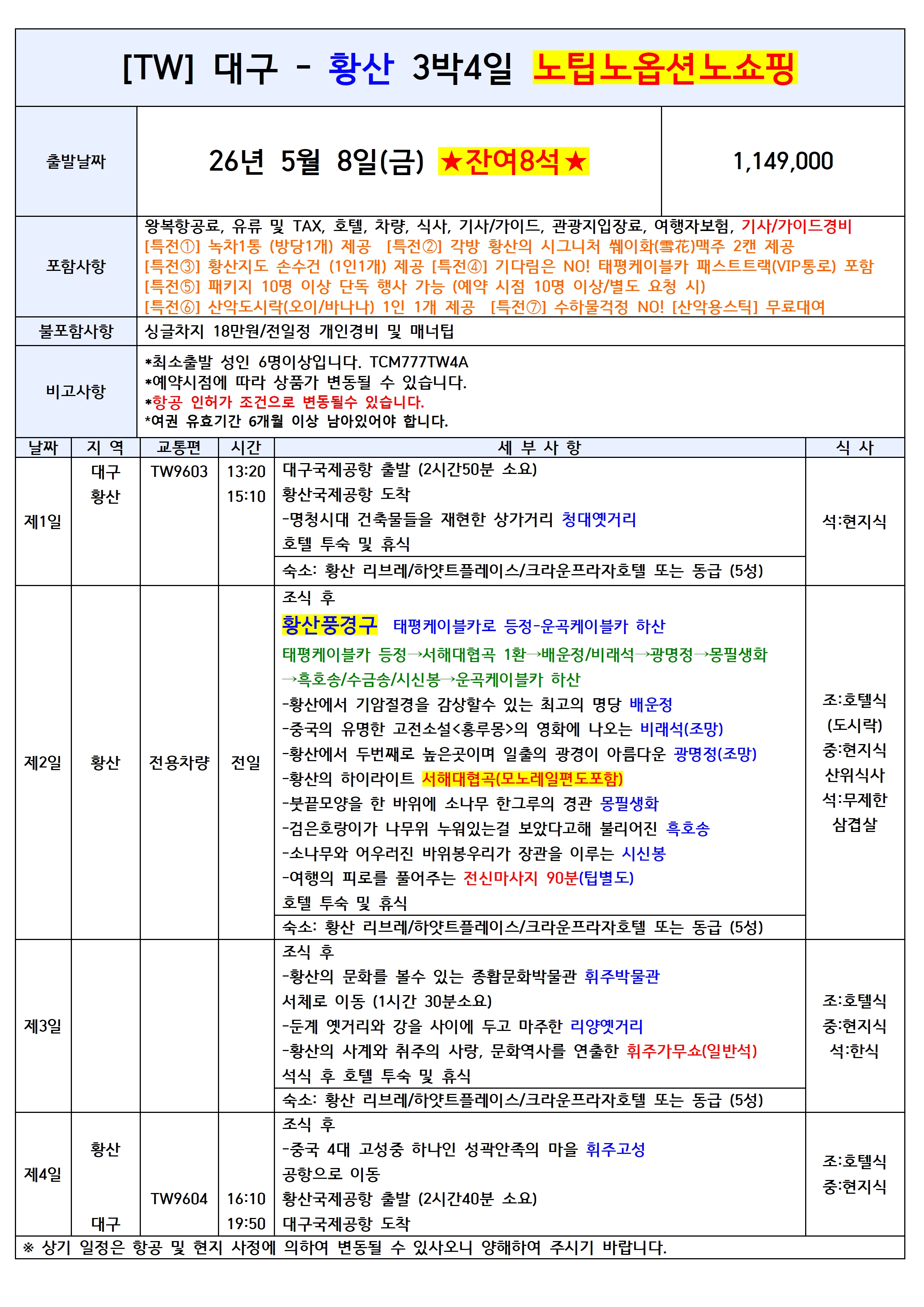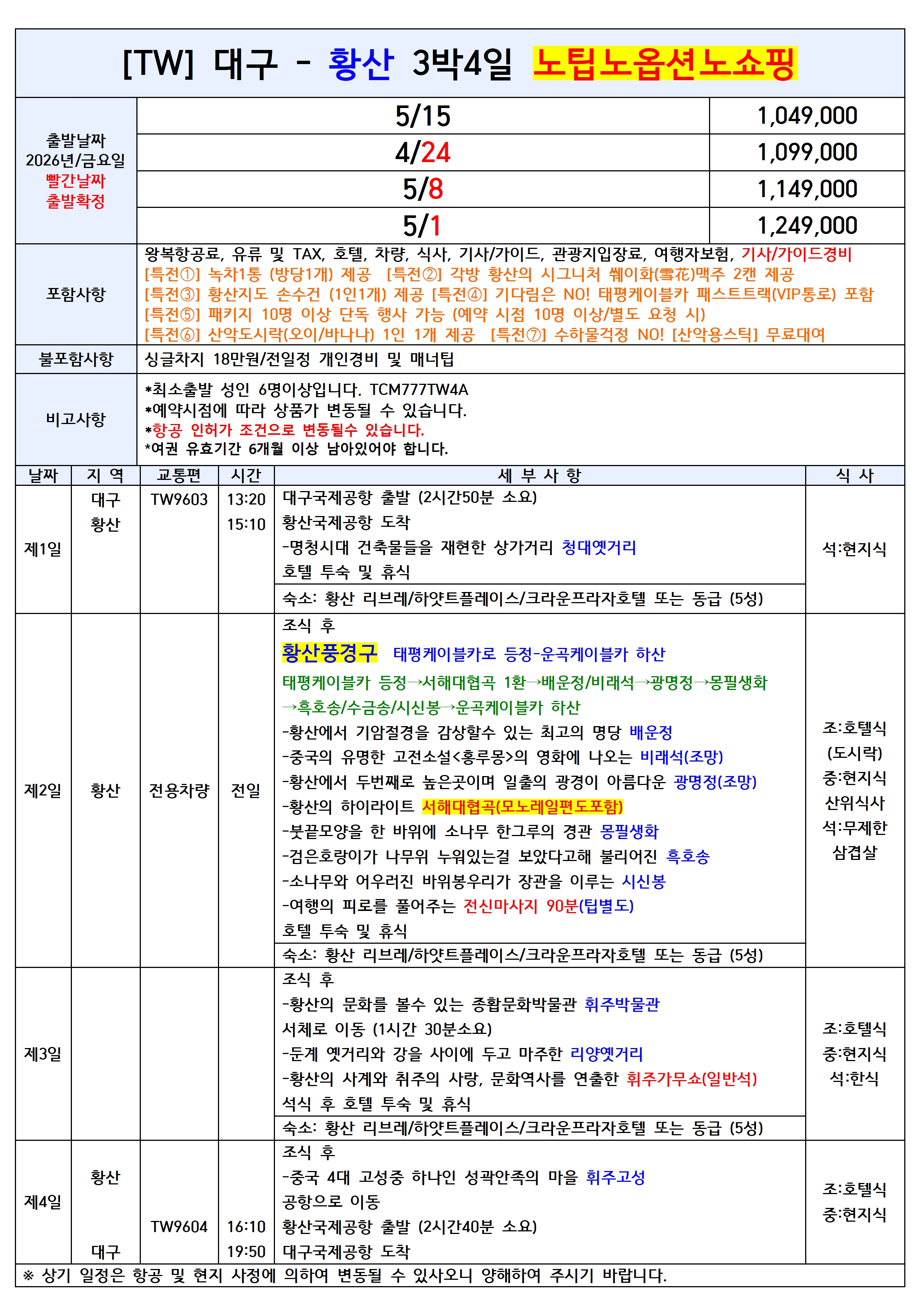 [대구출발] 황산 전세기 4일/5일 노팁노옵션/노쇼핑 티웨이항공