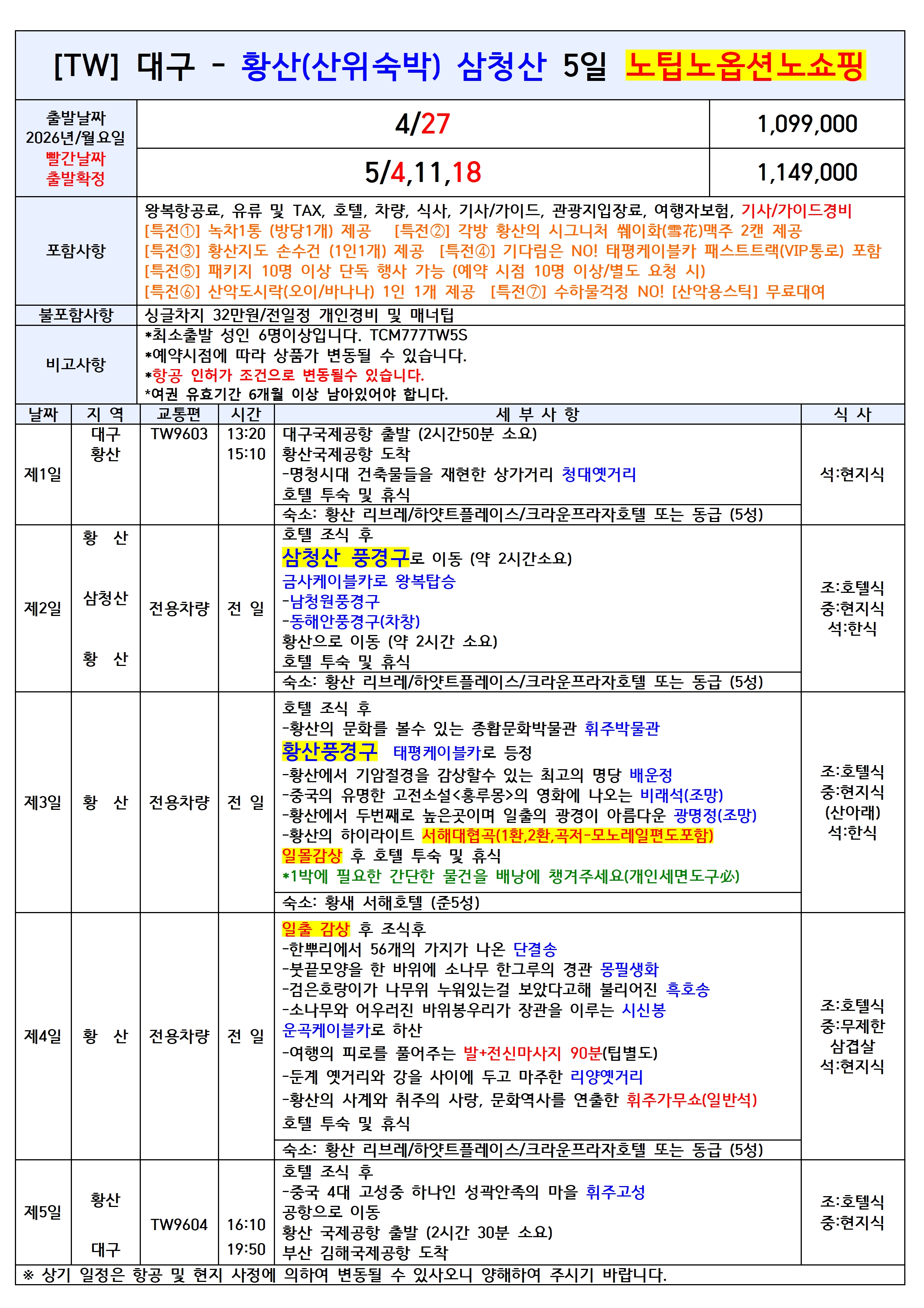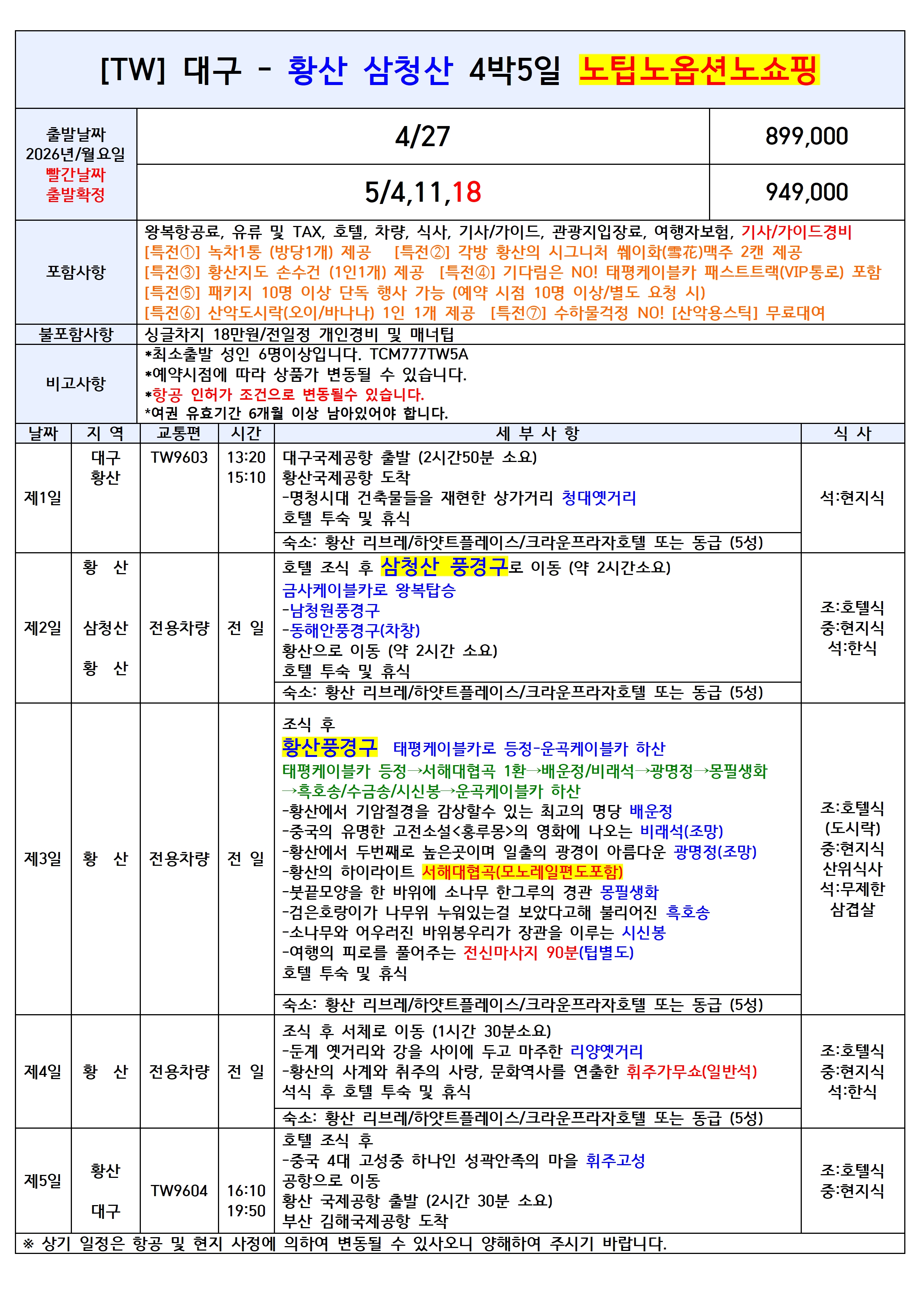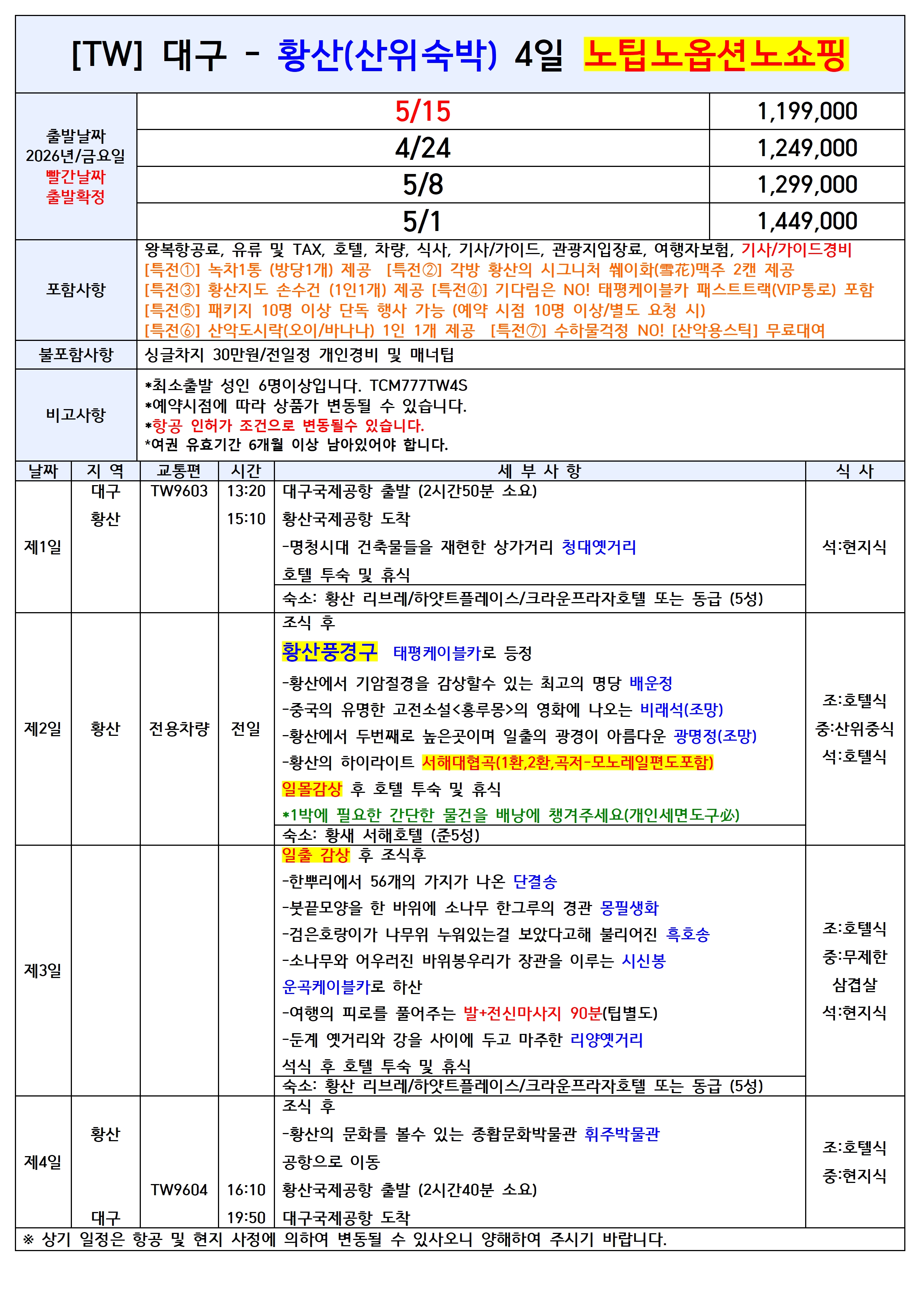 [대구출발] 황산 전세기 4일/5일 노팁노옵션/노쇼핑 티웨이항공