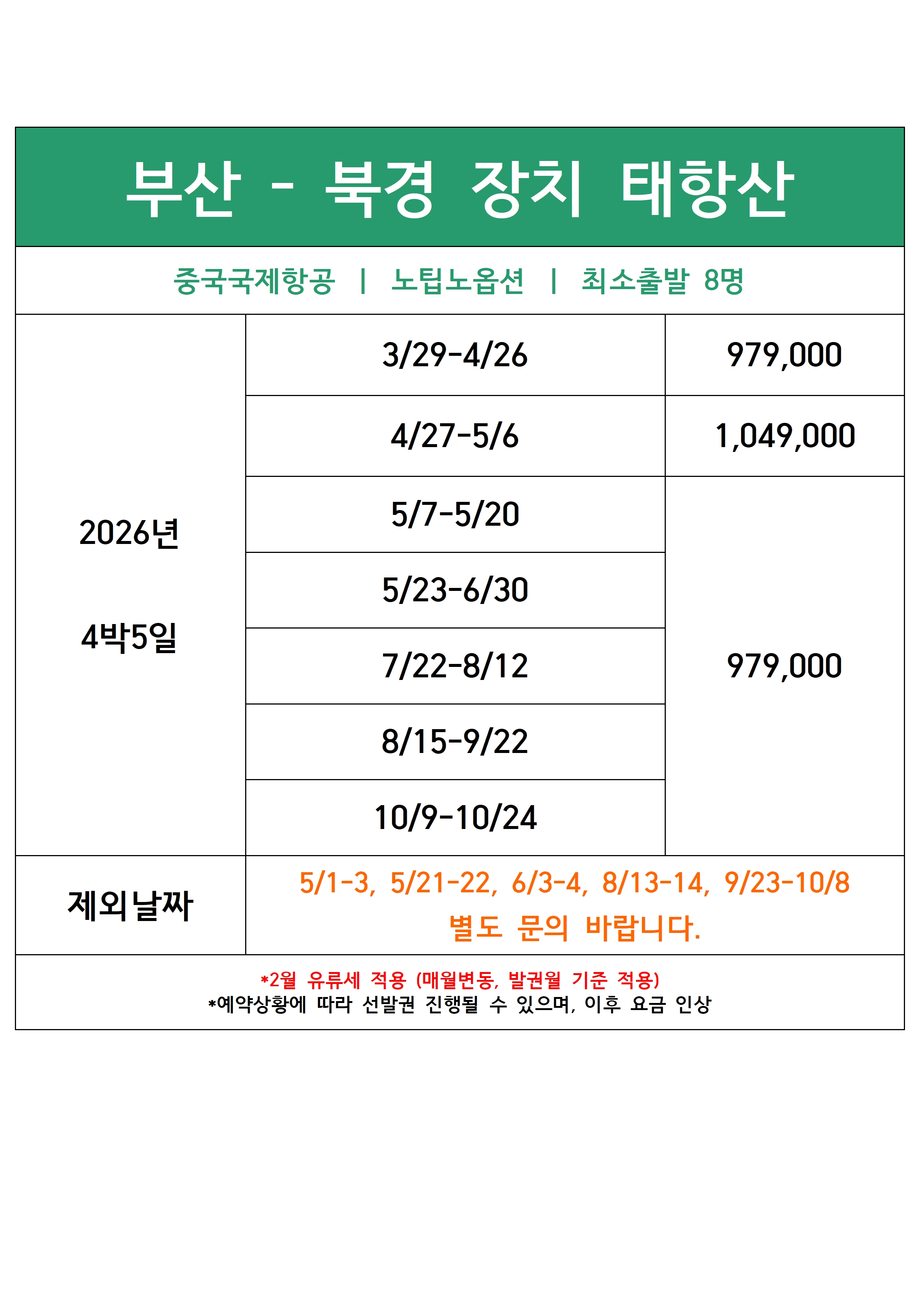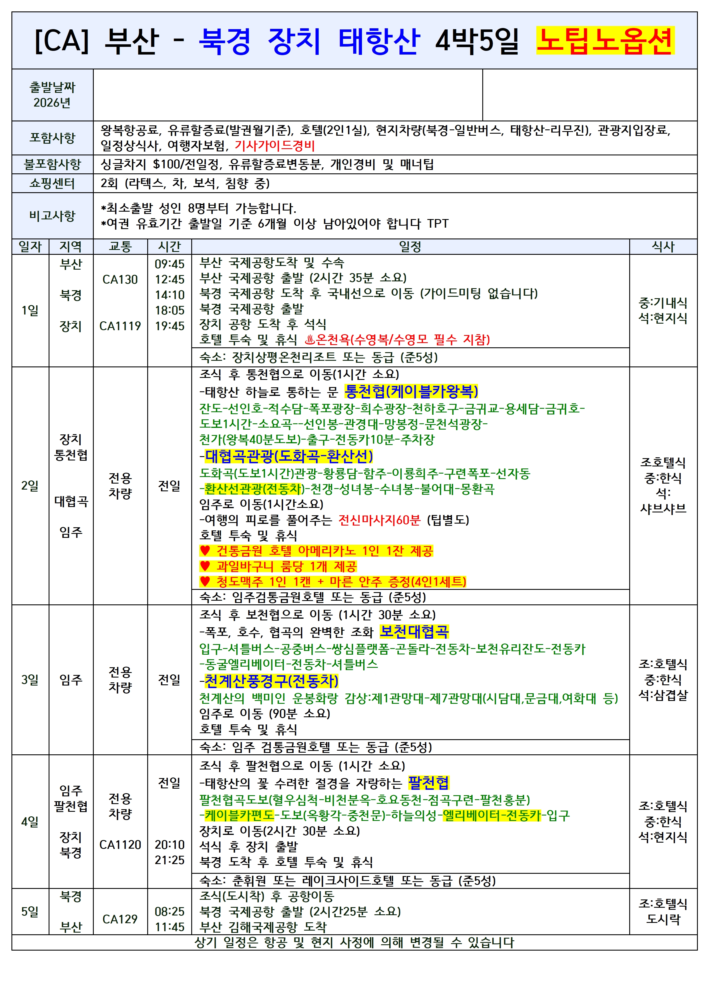 [부산출발] 북경 장치 태항산 4일/5일 노팁노옵션 중국국제항공