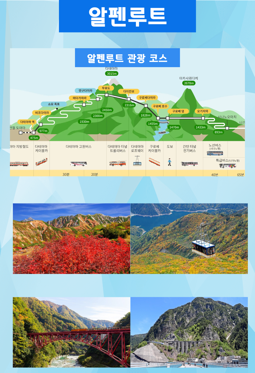 🌈 알펜루트는요. 🍂 일본의 지븡. 일본의 북알프스라는 별명을 가지고 있어요. 🍂 4월 ~ 11월 한시적으로 관광이 가능하고 🍂 4월에는 설벽을 볼 수 있고 _9월에는 단풍을 볼 수 있고 🍂10월 하순에는 정상에 눈이 내리는 그런 곳이랍니다. 🍂 계절에 맞춰 알록달록 예쁜 옷을 갈아입고 그림같은 풍경을 보여주는 인심 후한 곳이랍니다.