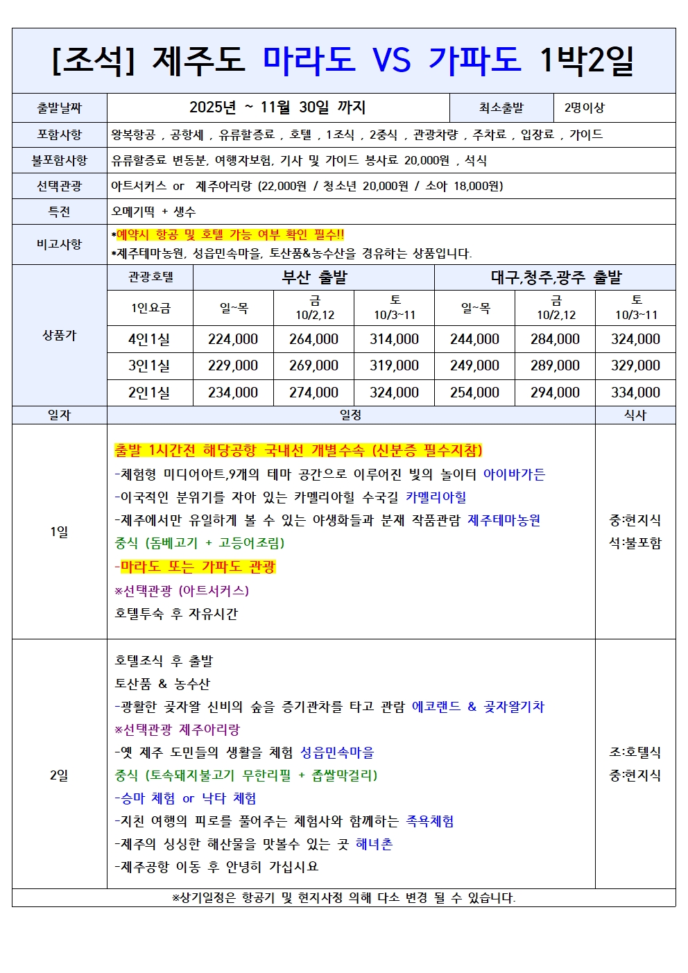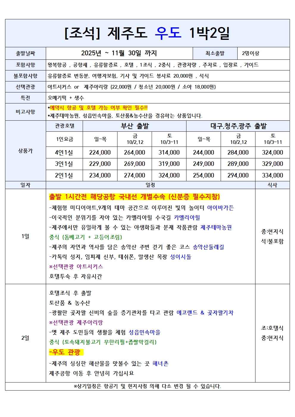 제주도 마라도/가파도/우도 1박2일 패키지 조석패턴