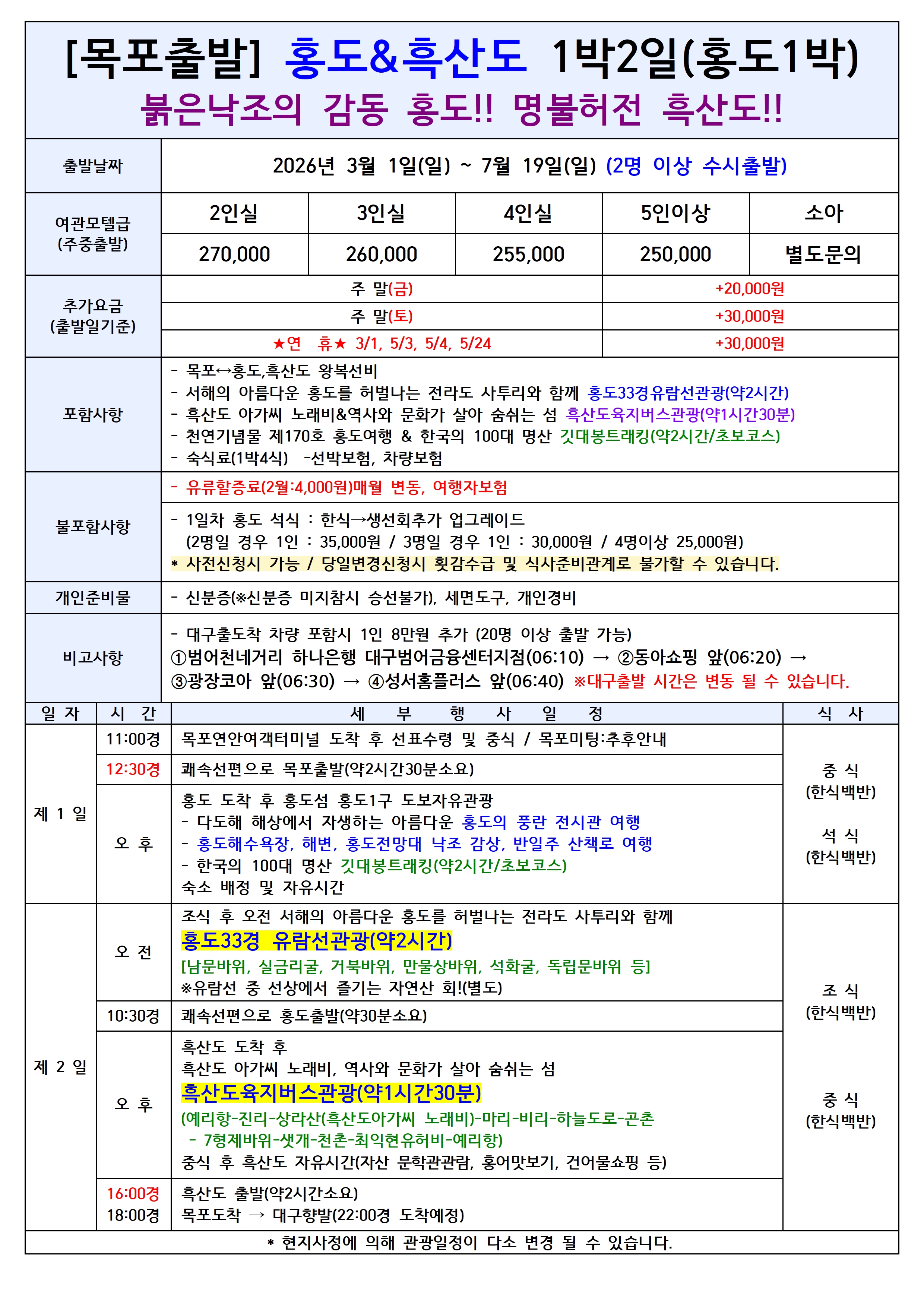 붉은낙조의 감동 홍도!! 명불허전 흑산도!! 홍도&흑산도1박2일(홍도1박) 목포집결