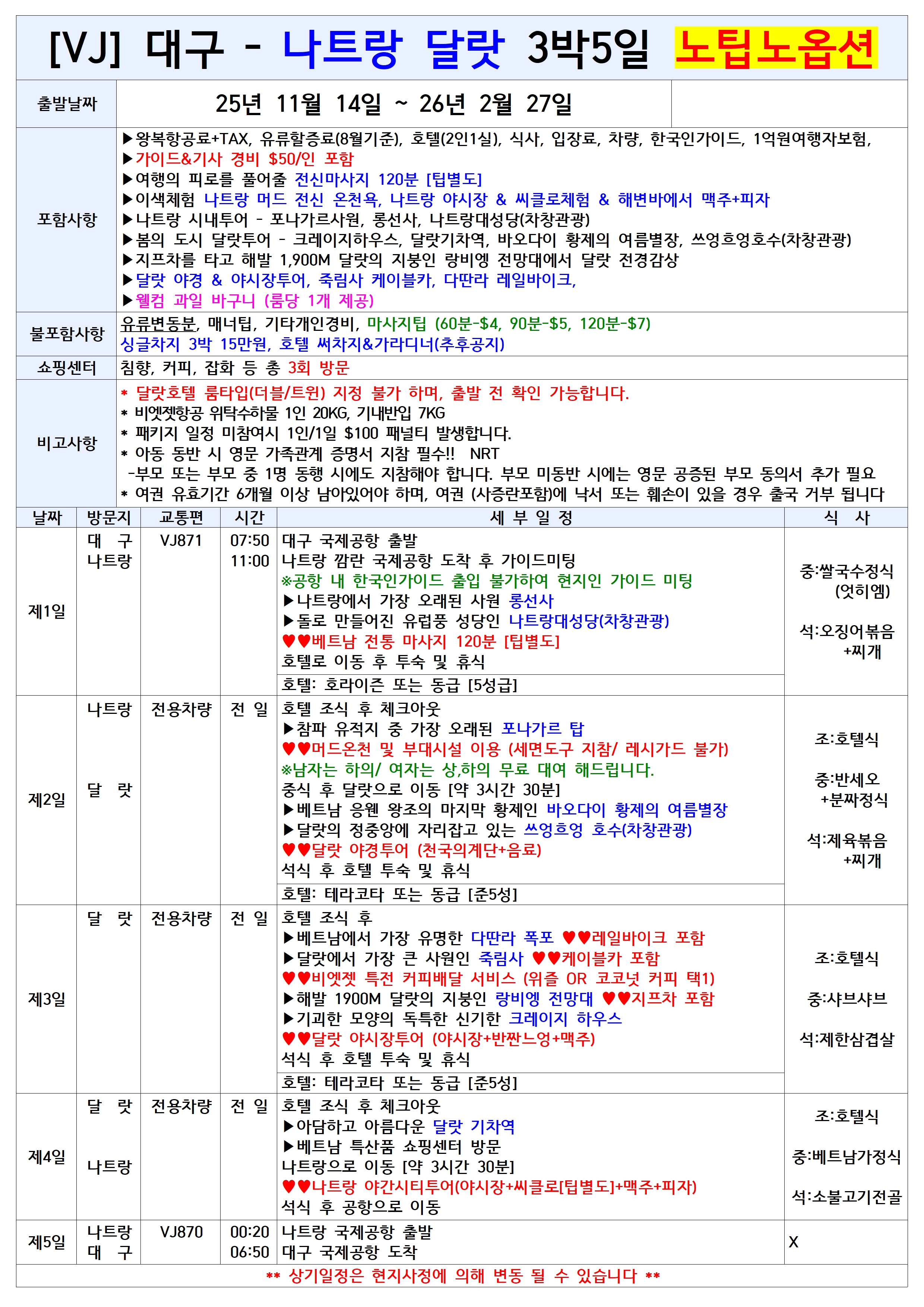 [대구출발] 나트랑 달랏 3박5일 노팁노옵션 비엣젯항공