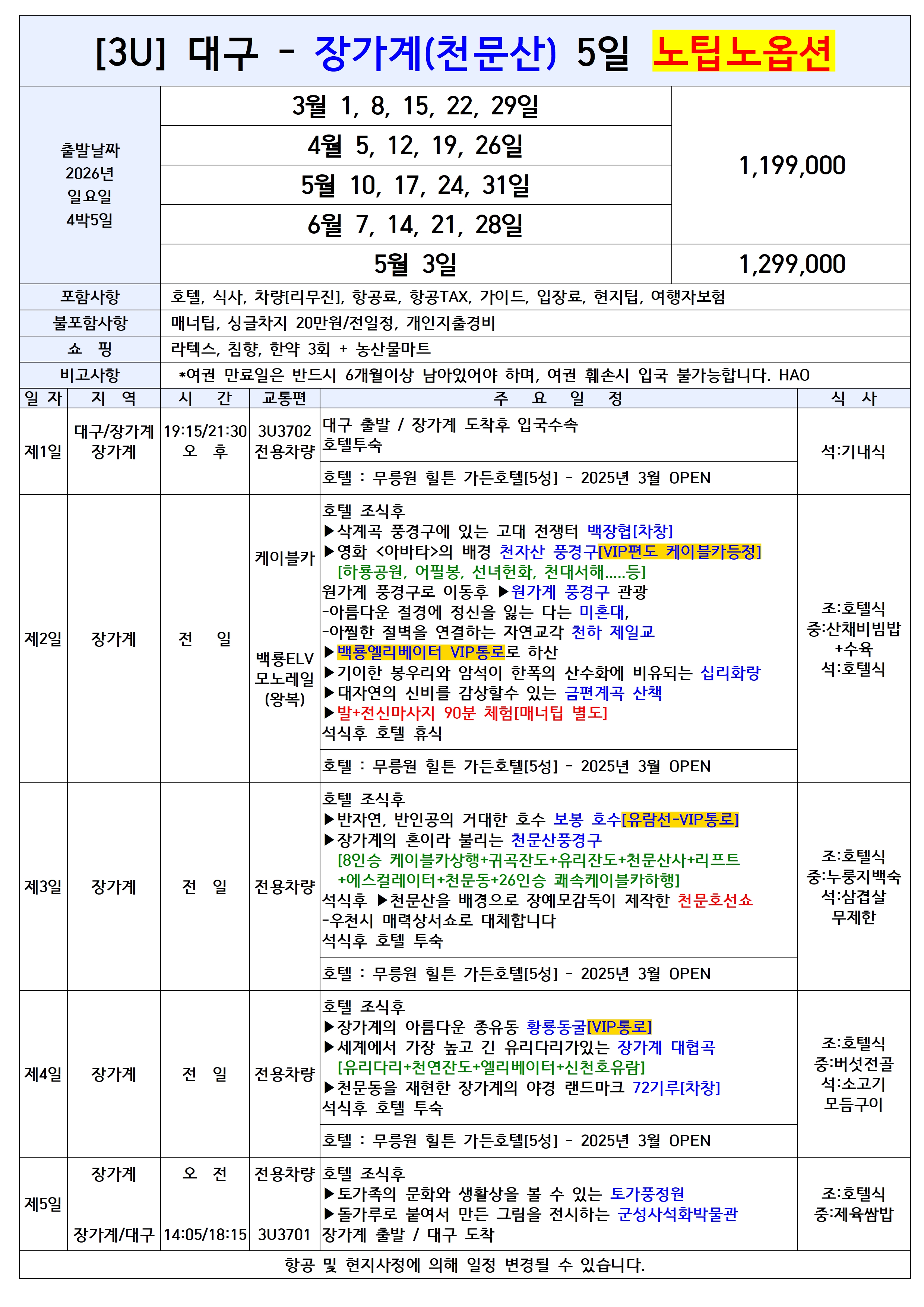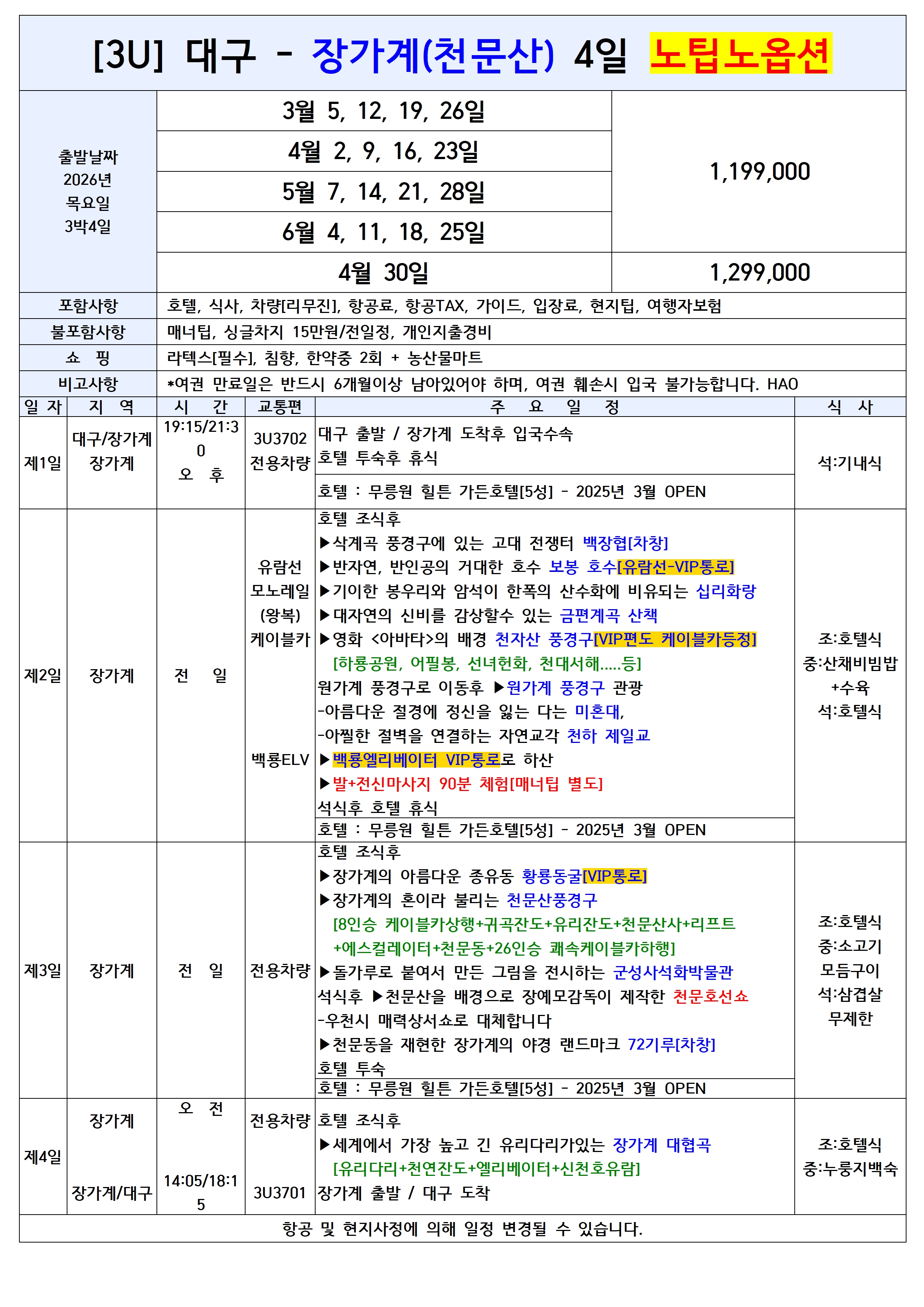 ★2026년 대구출발 사천항공 장가계전세기 상품입니다.★ 🌟5성급 힐튼가든호텔(25년3월OPEN) 🌟VIP통로:천자산케이블카+백룡엘리베이터+황룡동굴+보봉호 🌟매주 목요일(4일), 일요일(5일) 주2회운항! 🌟노팁+노옵션+리무진+5성급