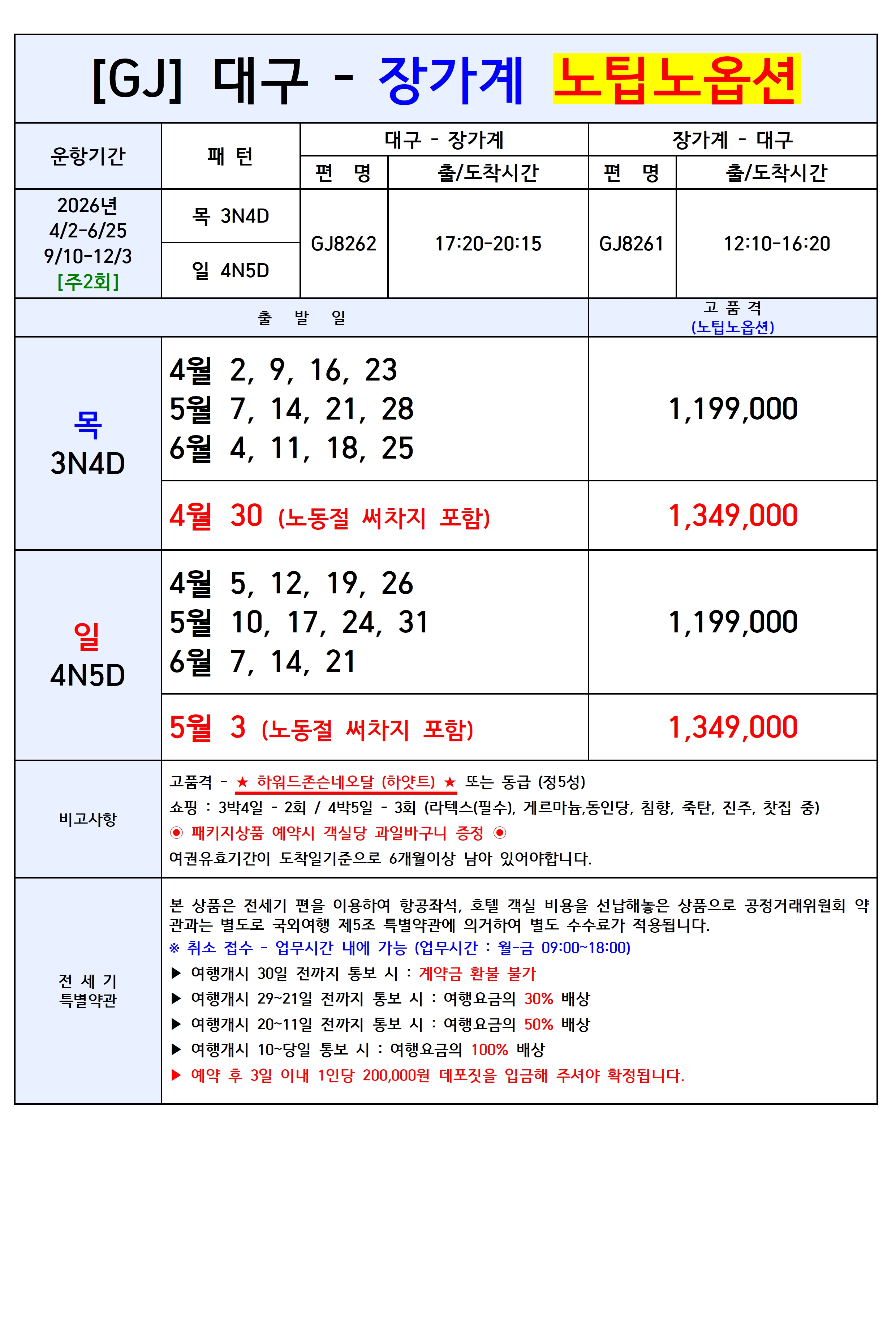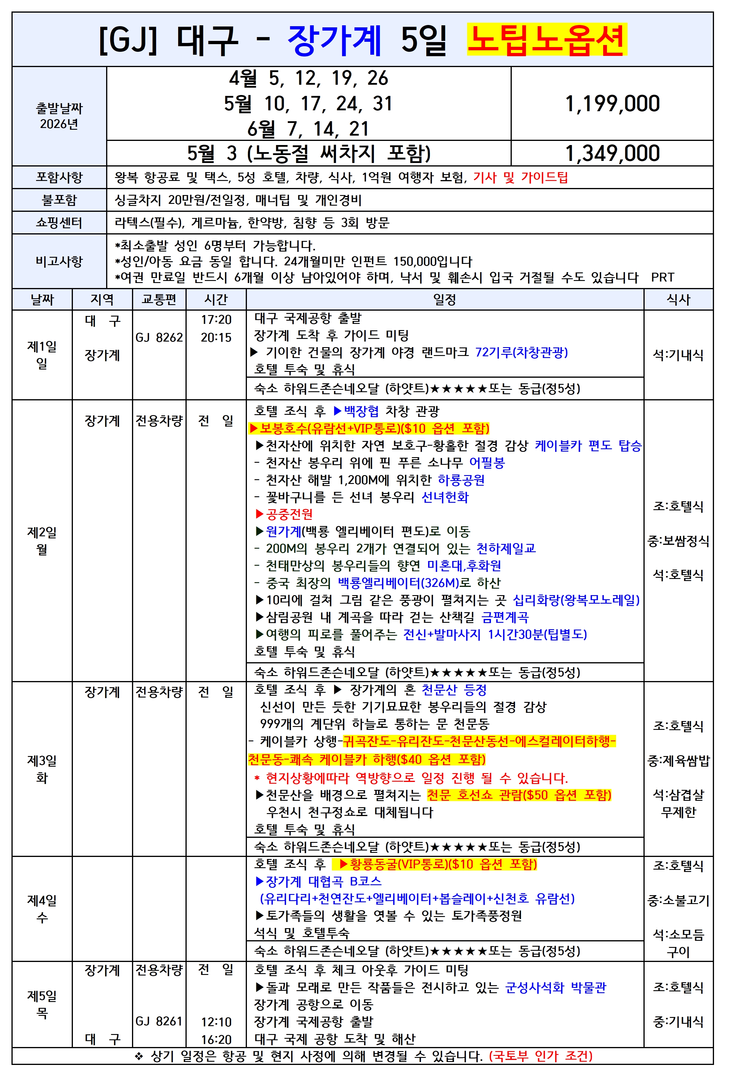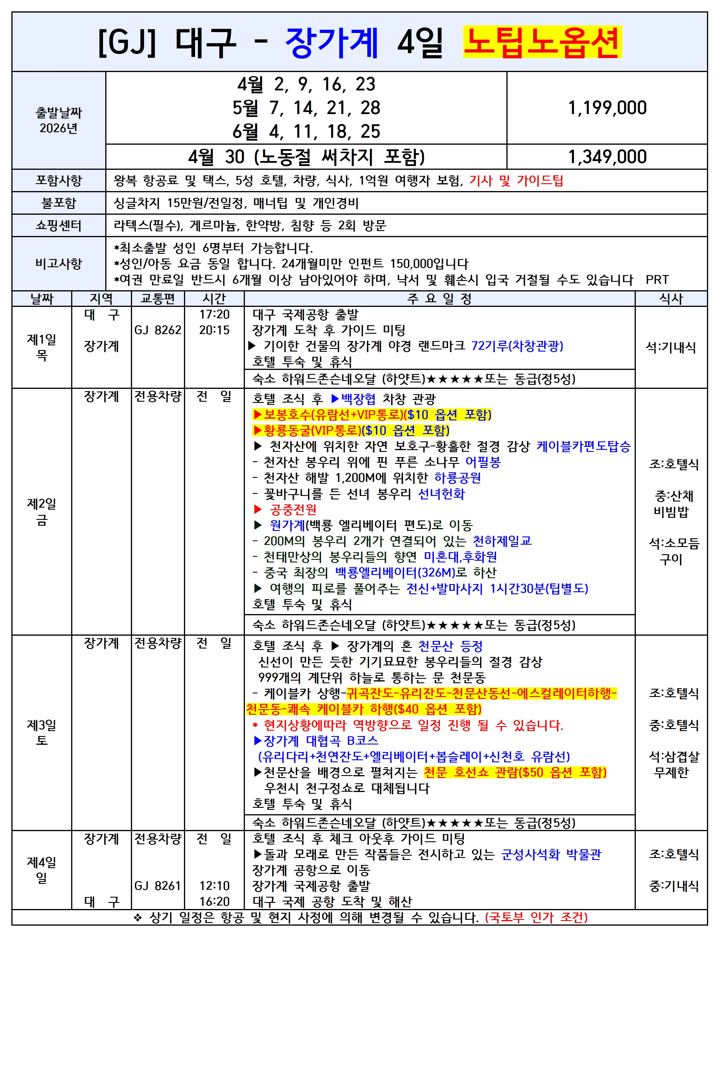 📢26년 4/2 ~ 6/25 대구 GJ룽에어 장가계 고품격 패키지 ✔ 정5성 네오달 호텔 (구.하얏트) ✔ 노팁,노옵션,공중정원 포함 ✔ 방당 과일바구니 증정