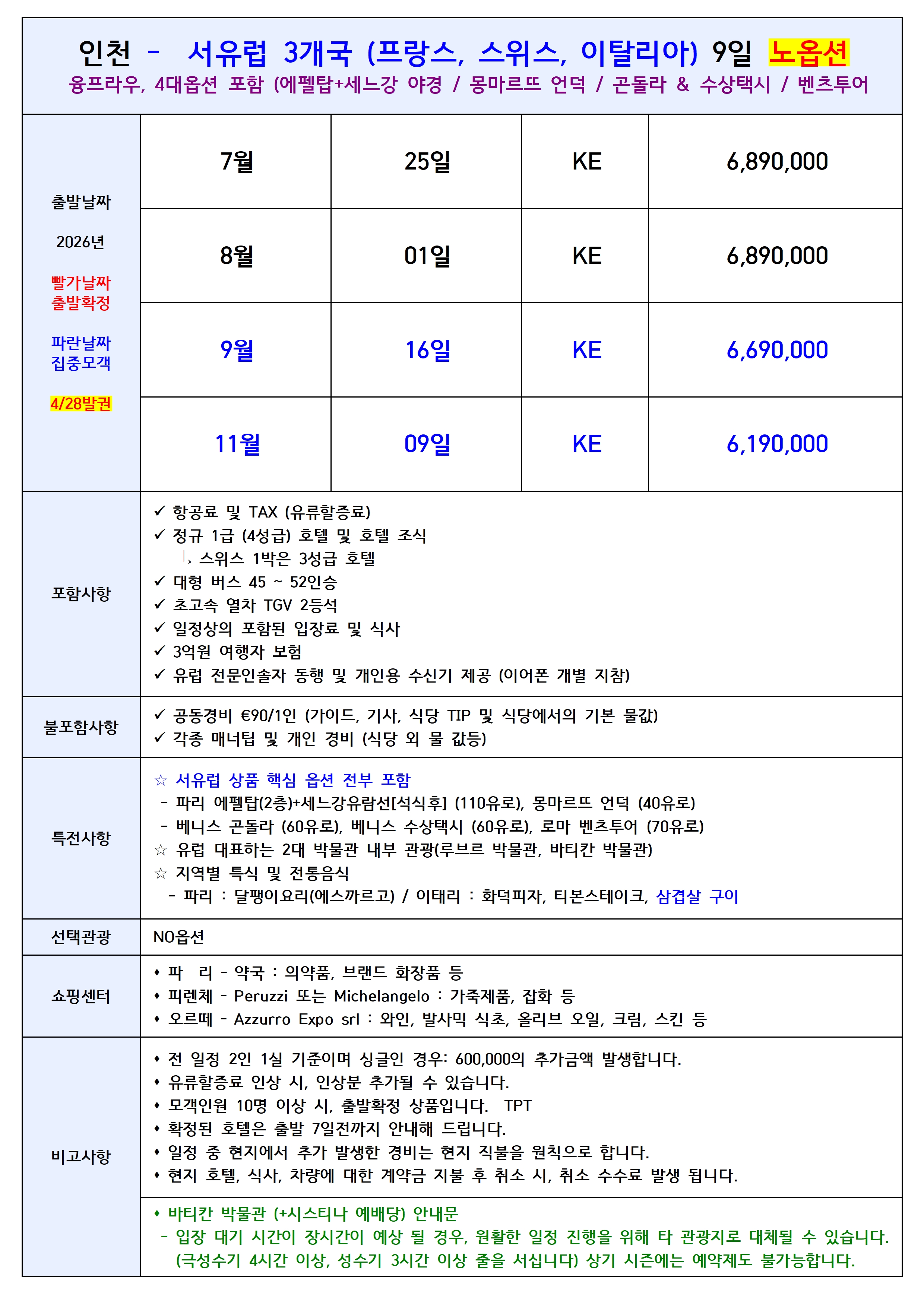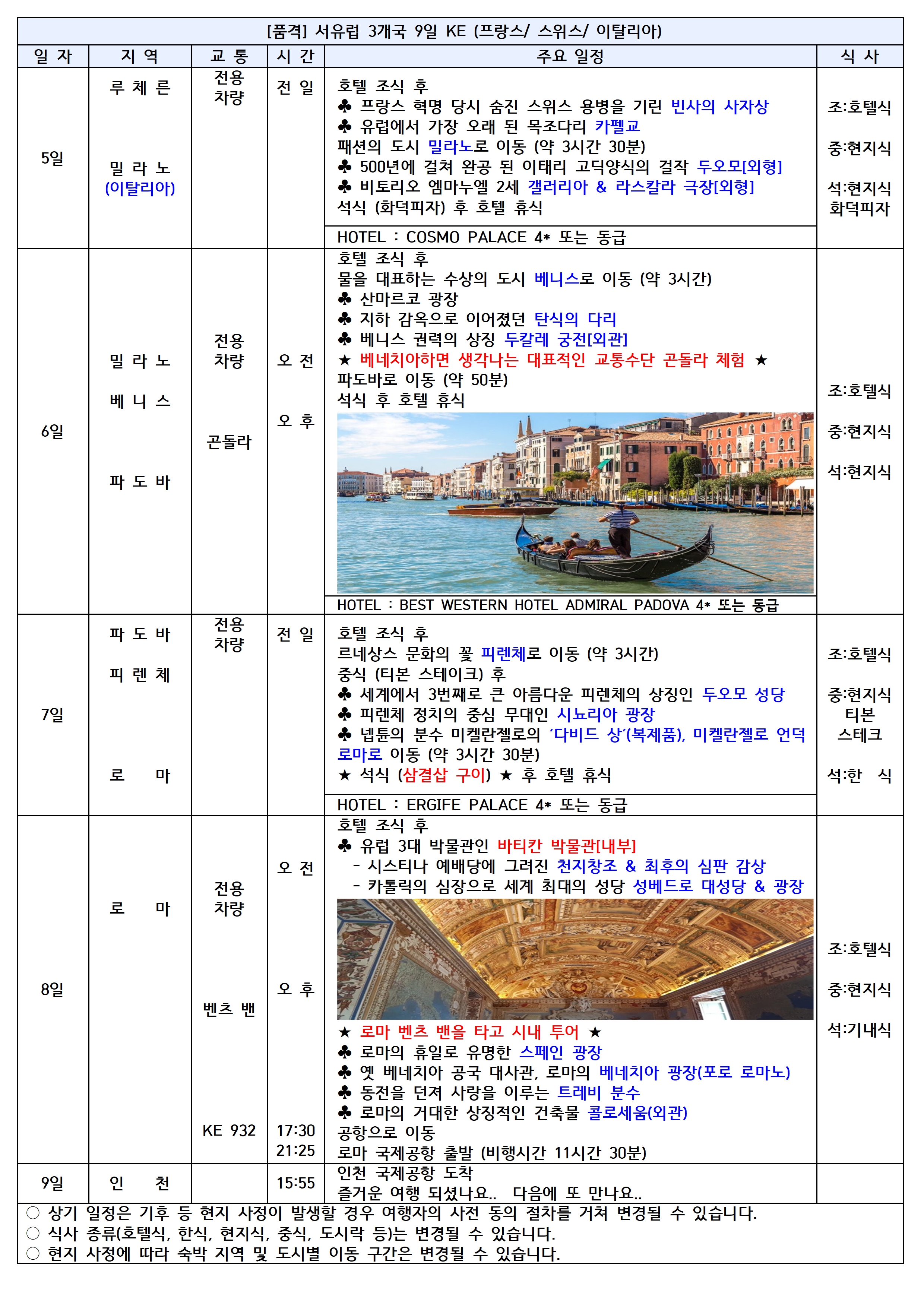 프랑스, 스위스, 이탈리아를 한 번에 돌아보는 단 한 번의 기회!