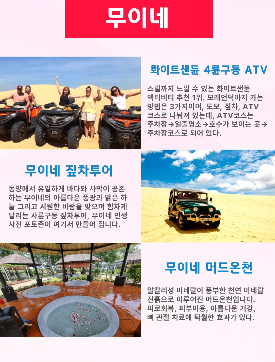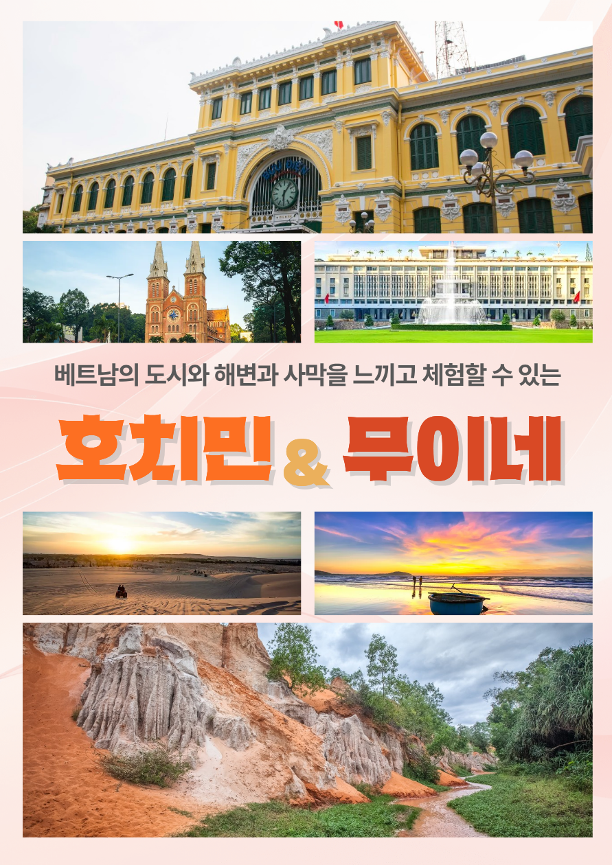 아름다운 사막도시 무이네에서 인생샷 📷 📌여행의 피로를 풀어줄 전신 마사지 1회포함 📌화려한 호치민 시티투어 포함(떤딘성당, 전쟁박물관, 중앙우체국, 통일궁, 벤탄시장 등) 📌동양에서 가장 가까운 아름다운 무이네 사막투어 포함 (화이트샌듄, 레드샌듄) 📌미토 열대과일 농장 체험+쪽배 탑승 후 맹글로브 정글 수로 관광 📌전 일정 전 여행지가 포토존인 호치민/무이네/미토