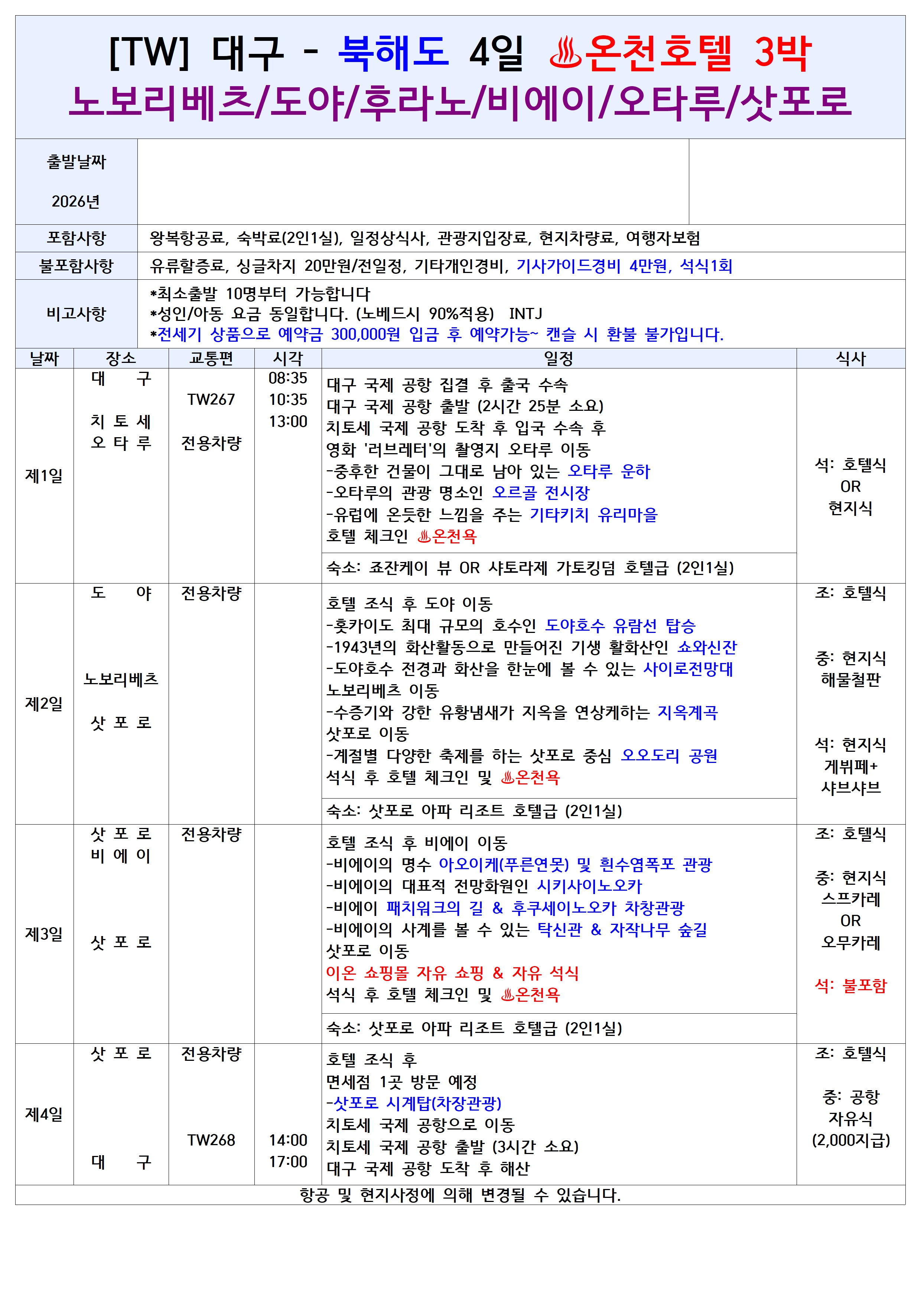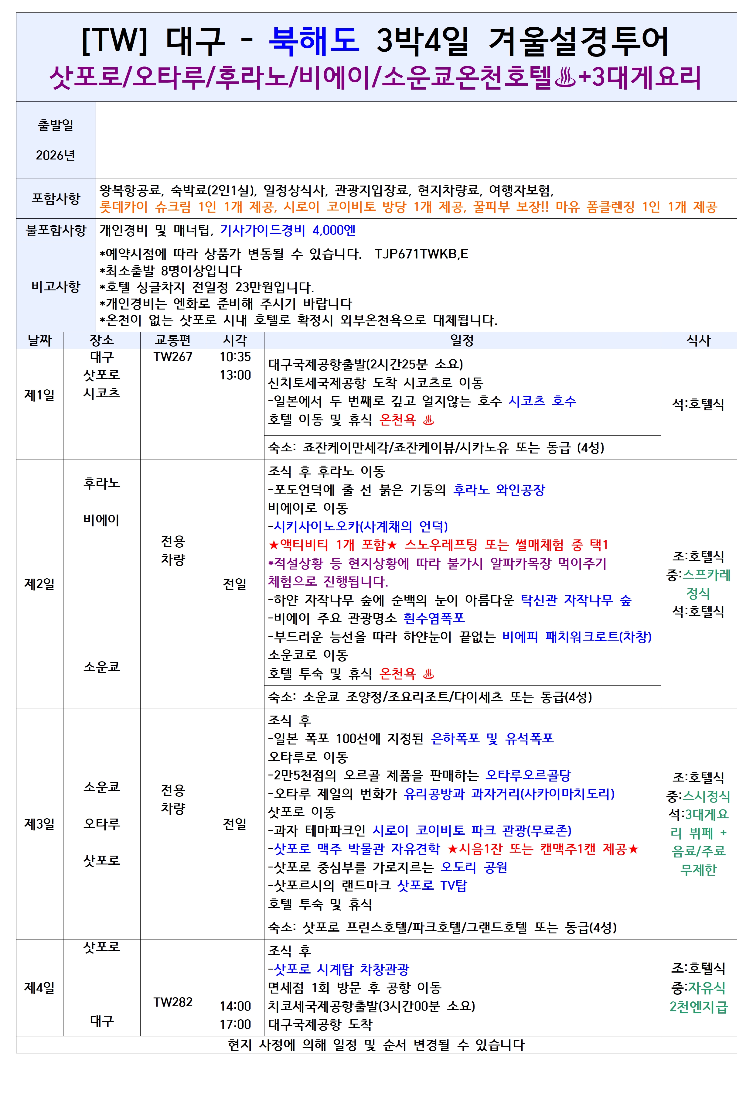 [대구출발] 북해도 비에이 3박4일 품격 패키지 티웨이항공