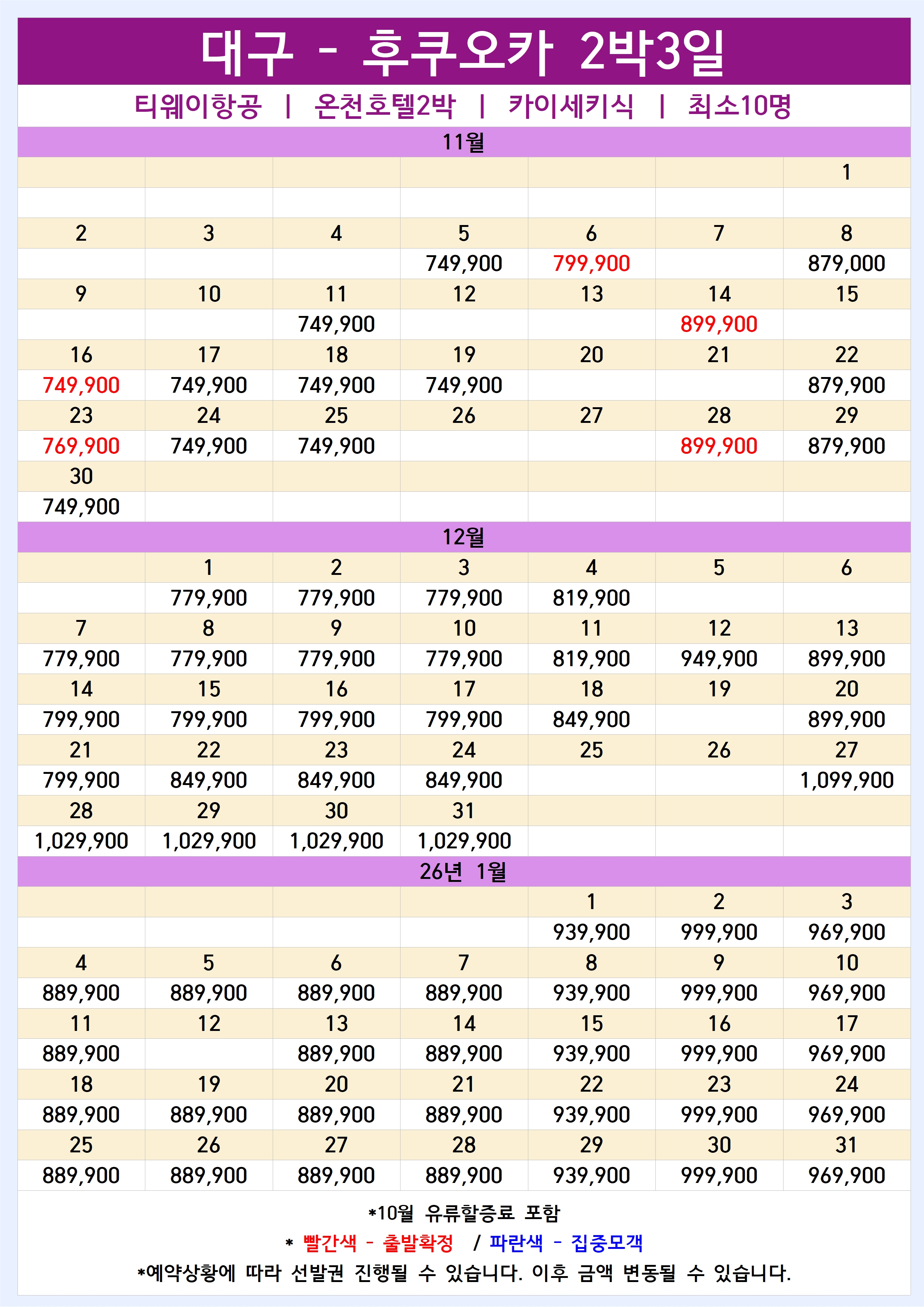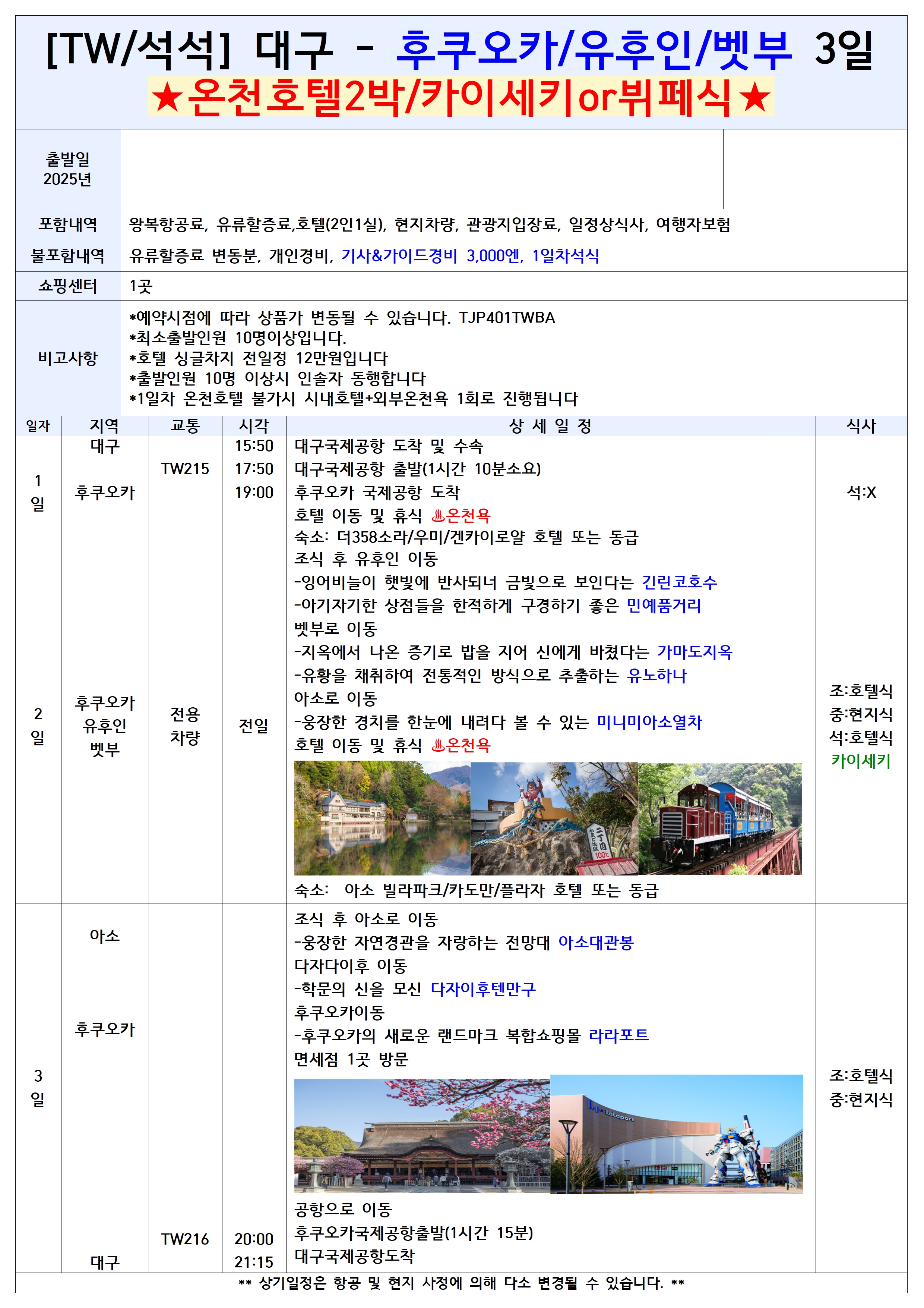 [대구출발] 후쿠오카 유후인 벳부 아소 다자이후 3일 온천호텔2박 티웨이항공