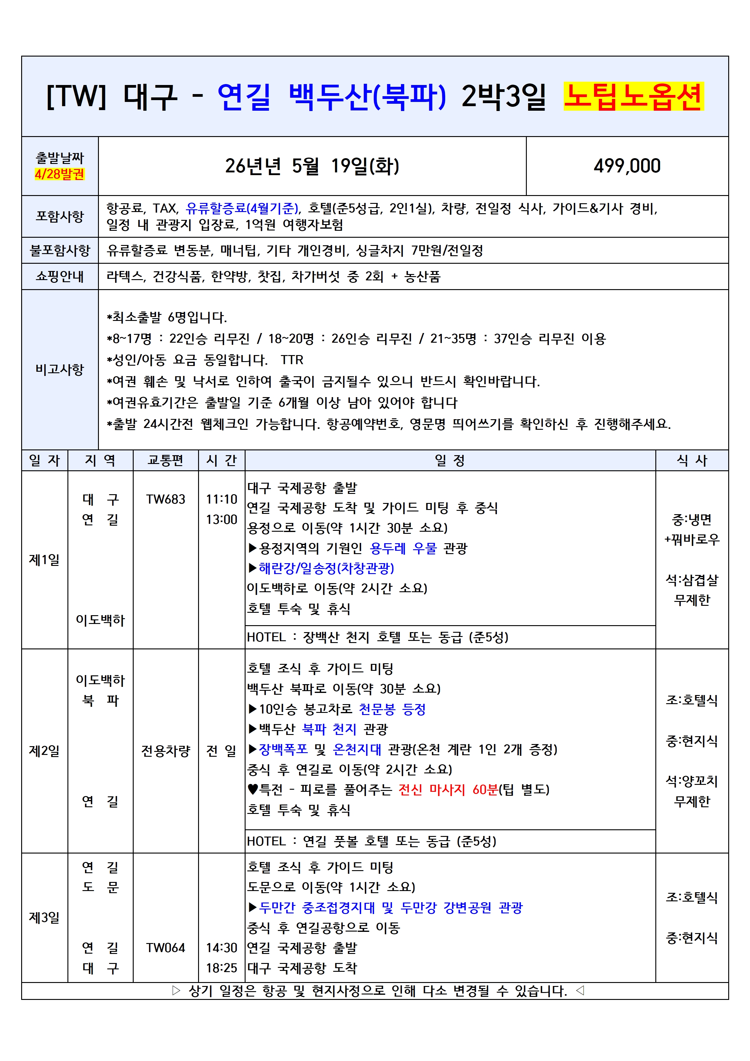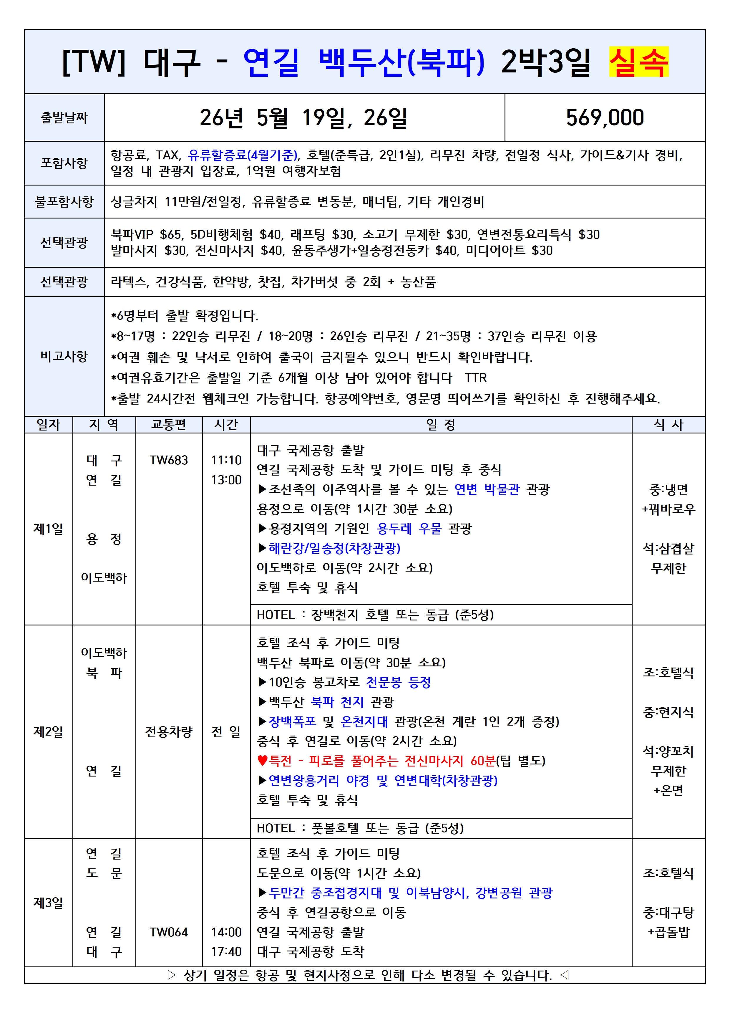 🔥선착순특가🔥[대구출발] 연길 백두산 패키지