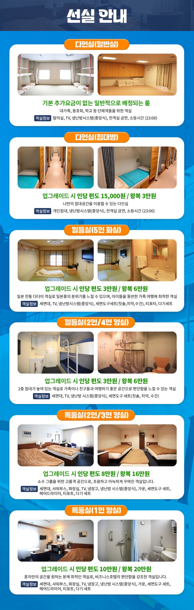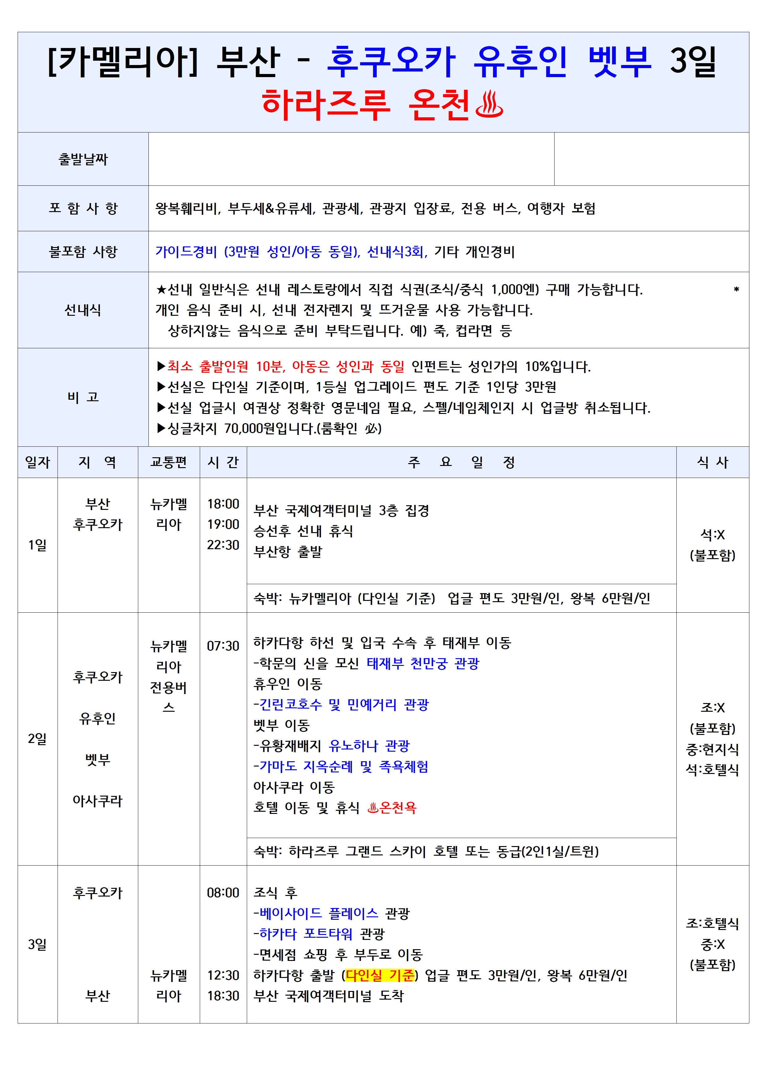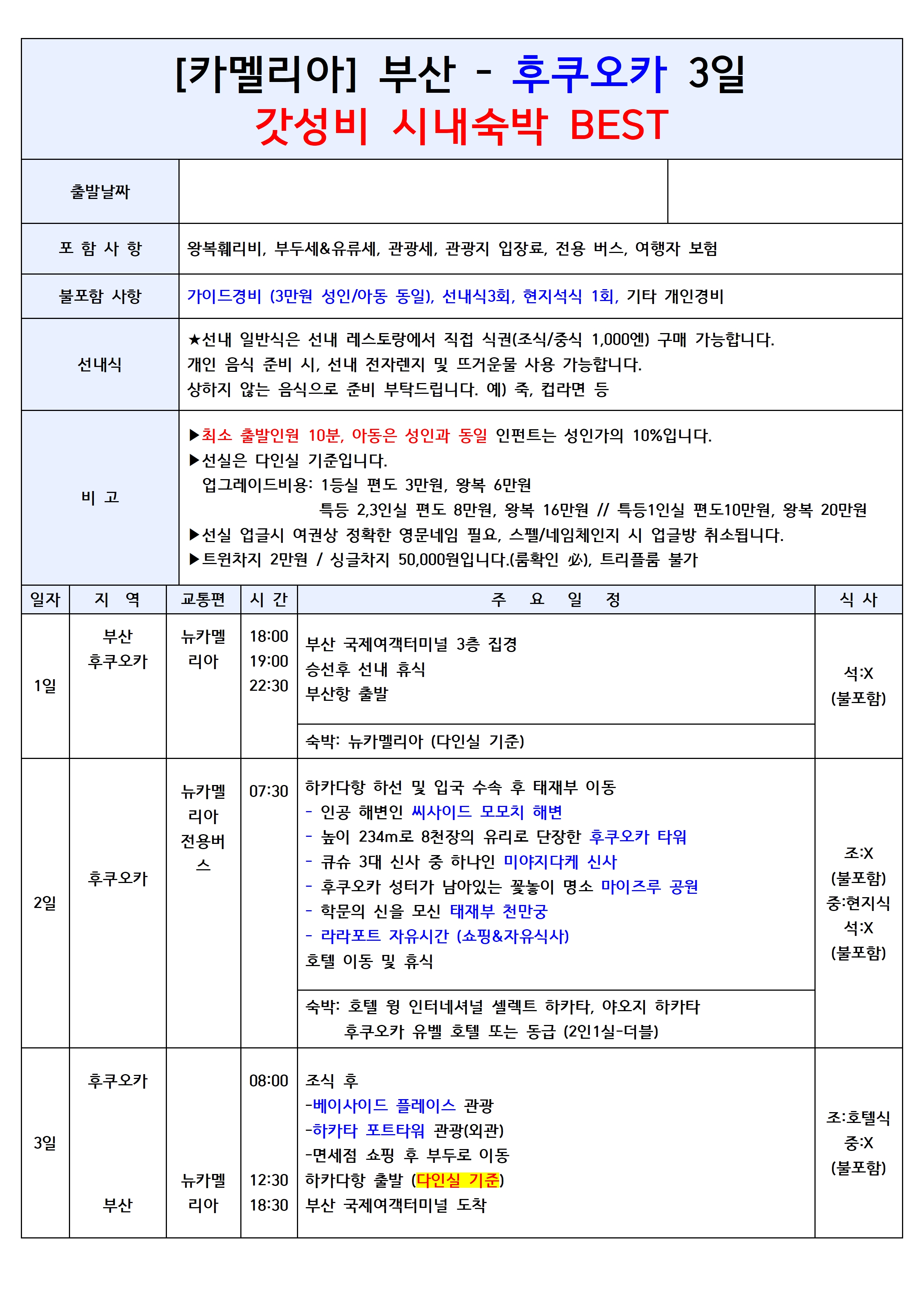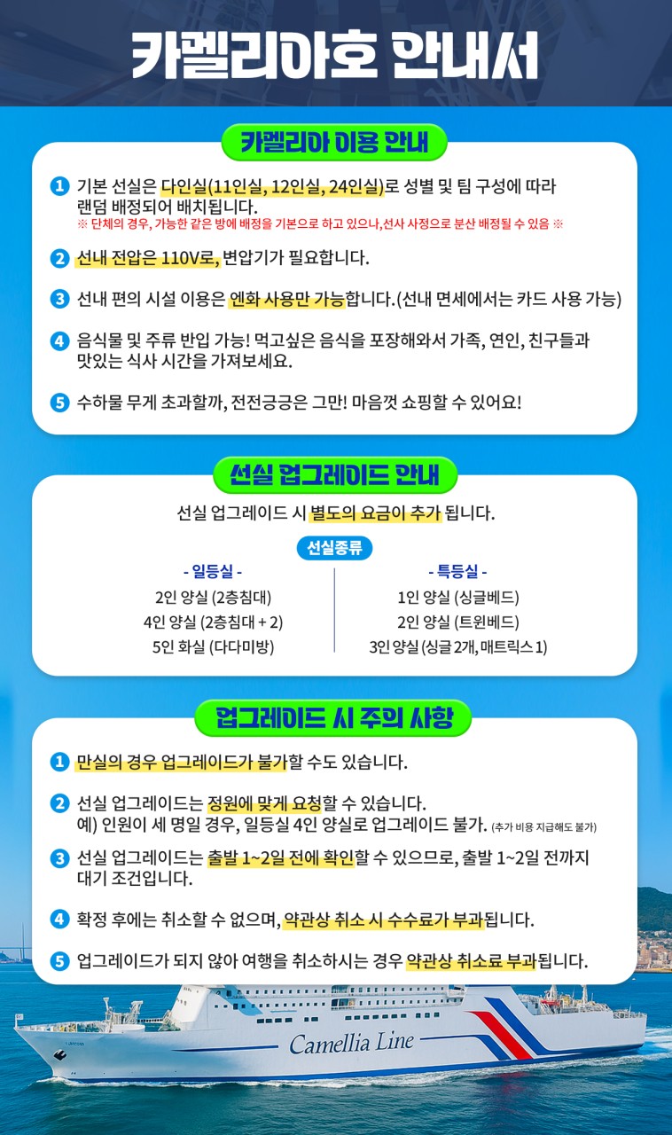 ✔ 부산 출발 후쿠오카 선박 여행 ✔ 저녁 출발로, 퇴근하고 후다닥 떠나기 좋고! 자고 일어나면 일본 도착! ✔ 오락실, 노래방, 레스토랑 등 즐길거리 다양한 카멜리아호 ✔ 배 안에서 자유롭게 식사 및 주류 반입 가능 ✔ 수하물 무게 제한도 비교적 자유로워, 마음 편하게 쇼핑까지! 🛍