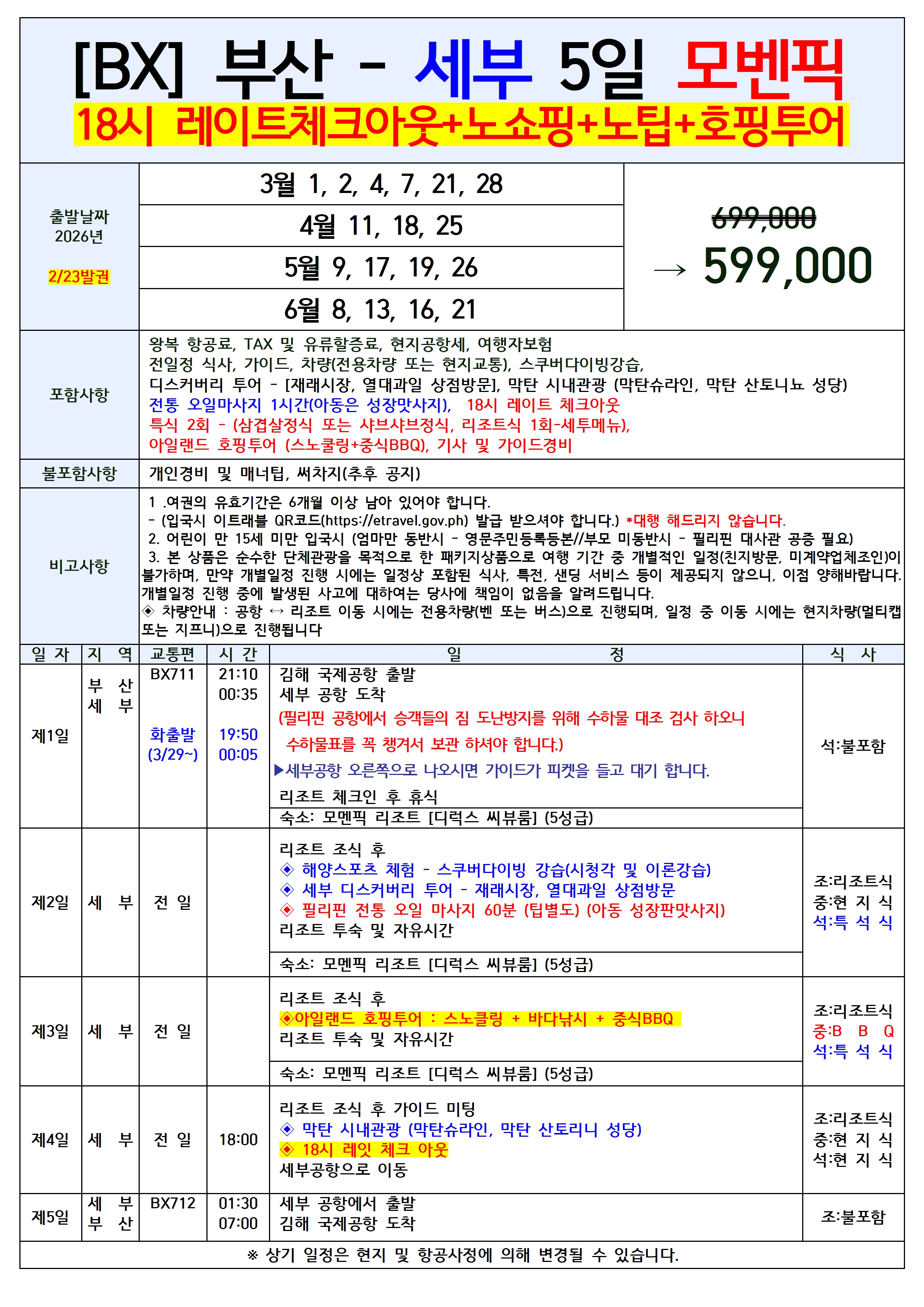 5성급 월드체인 모벤픽 리조트 💖선착순 특전: 디럭스룸 -> 디럭스 씨뷰룸 업그레이드💖 ✨ 세부 직항 노노패키지 5일 ✨ ✔ 특석식 2회(샤브샤브 정식 또는 삼겹살 정식, 리조트 석식-세트메뉴) ✔ 전신 마사지 1시간(아동은 성장마사지) ✔ 세부 아일랜드 호핑투어 포함(스노쿨링+중식BBQ) ✔ 노팁! 노쇼핑! + 18시 레이트 체크아웃 포함