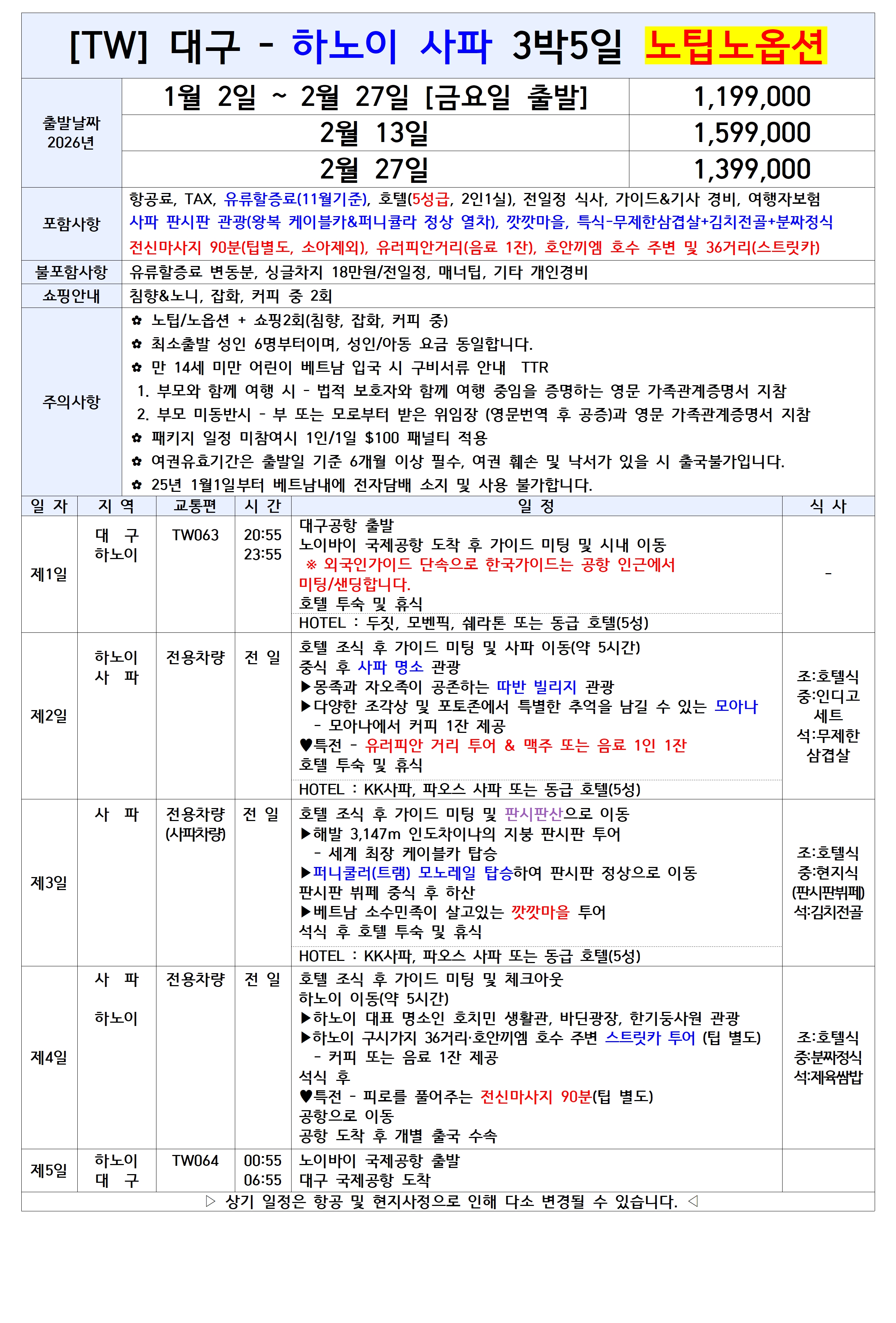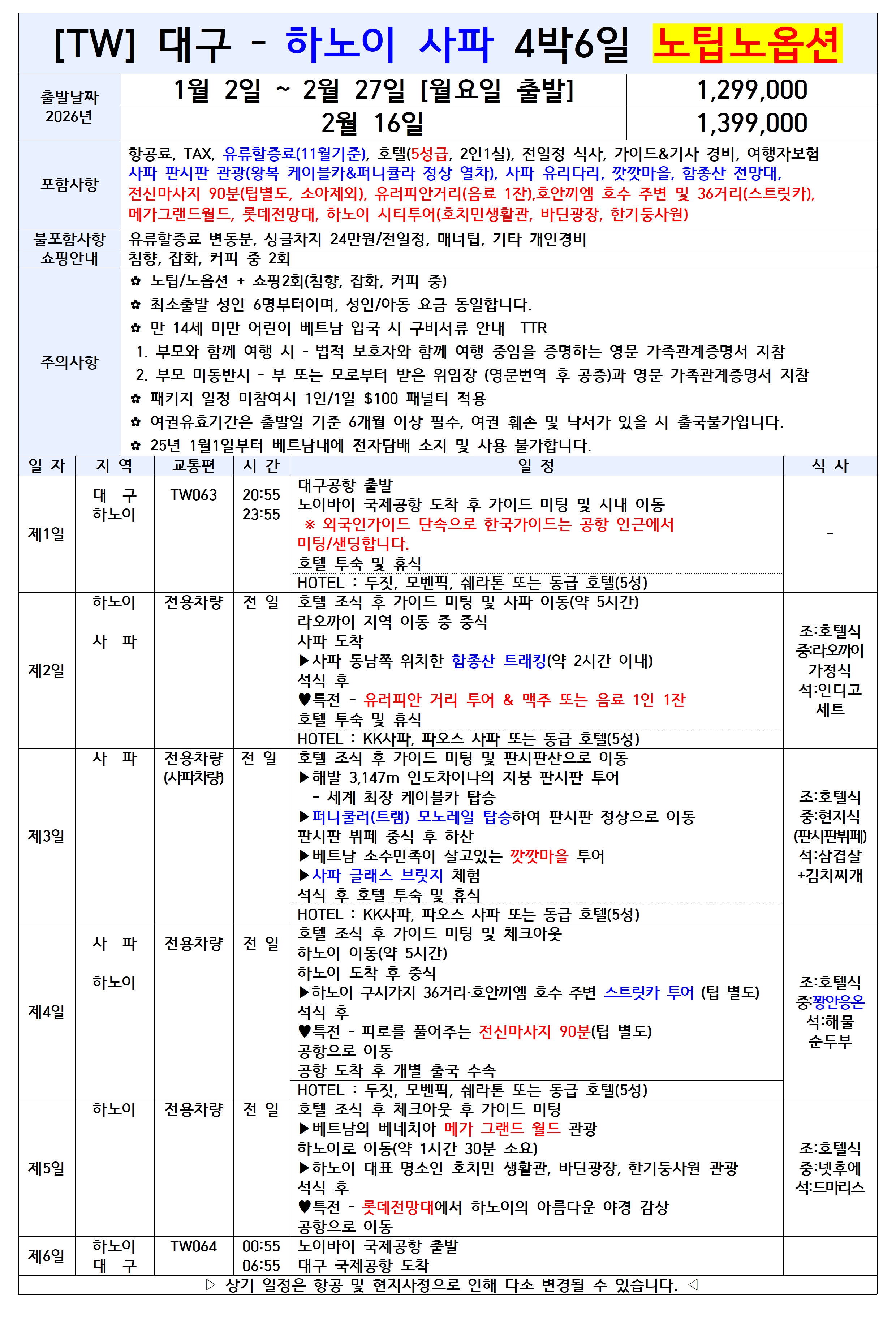 📢 [TW] 대구출발 ✈ 하노이✨ 🎉 1/2 첫취항! 2/27까지 한정 운항! 고품격 사파 상품 OPEN 🎀 ✔ 월요일 출발 4박6일 ✔ 금요일 출발 3박5일