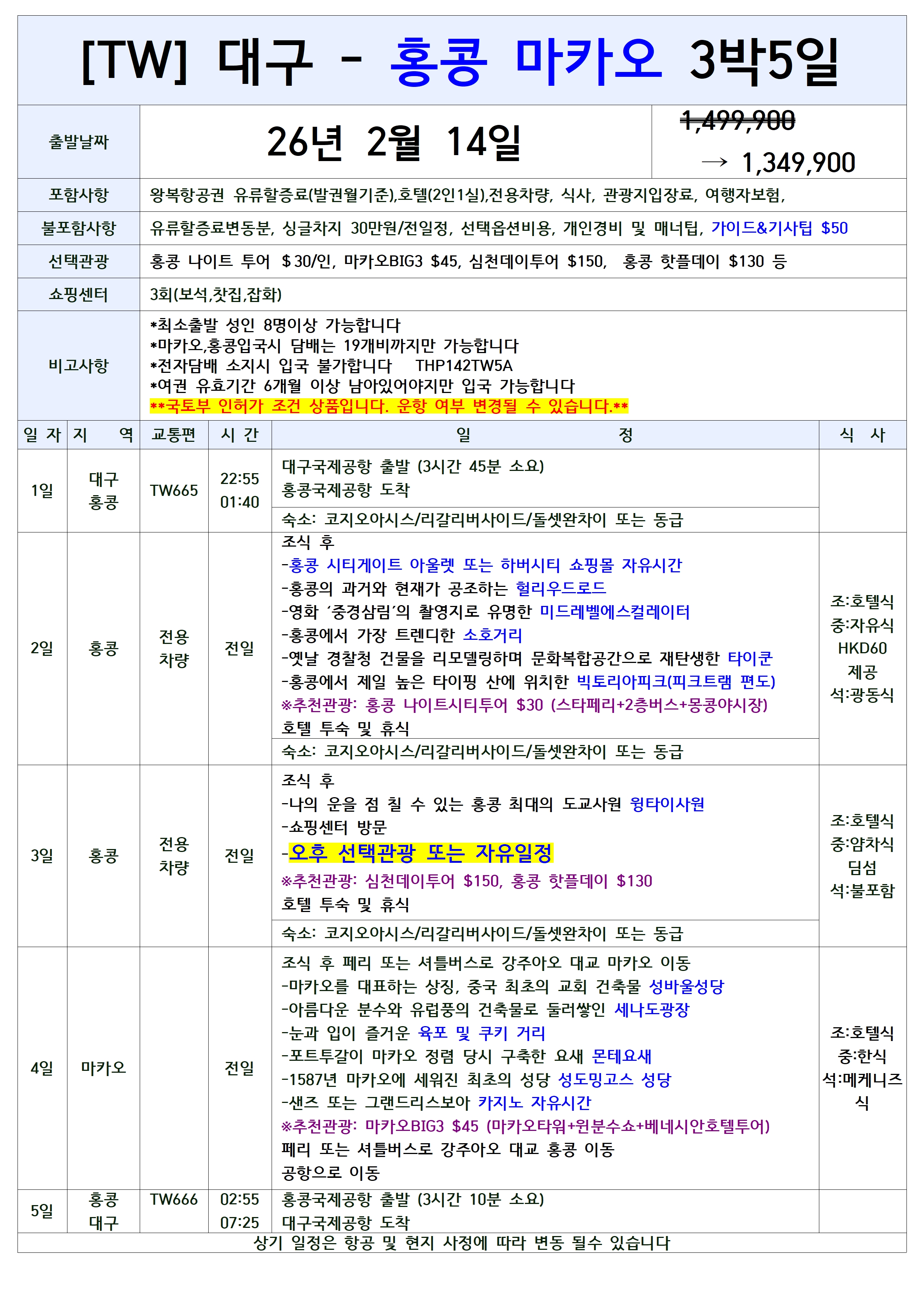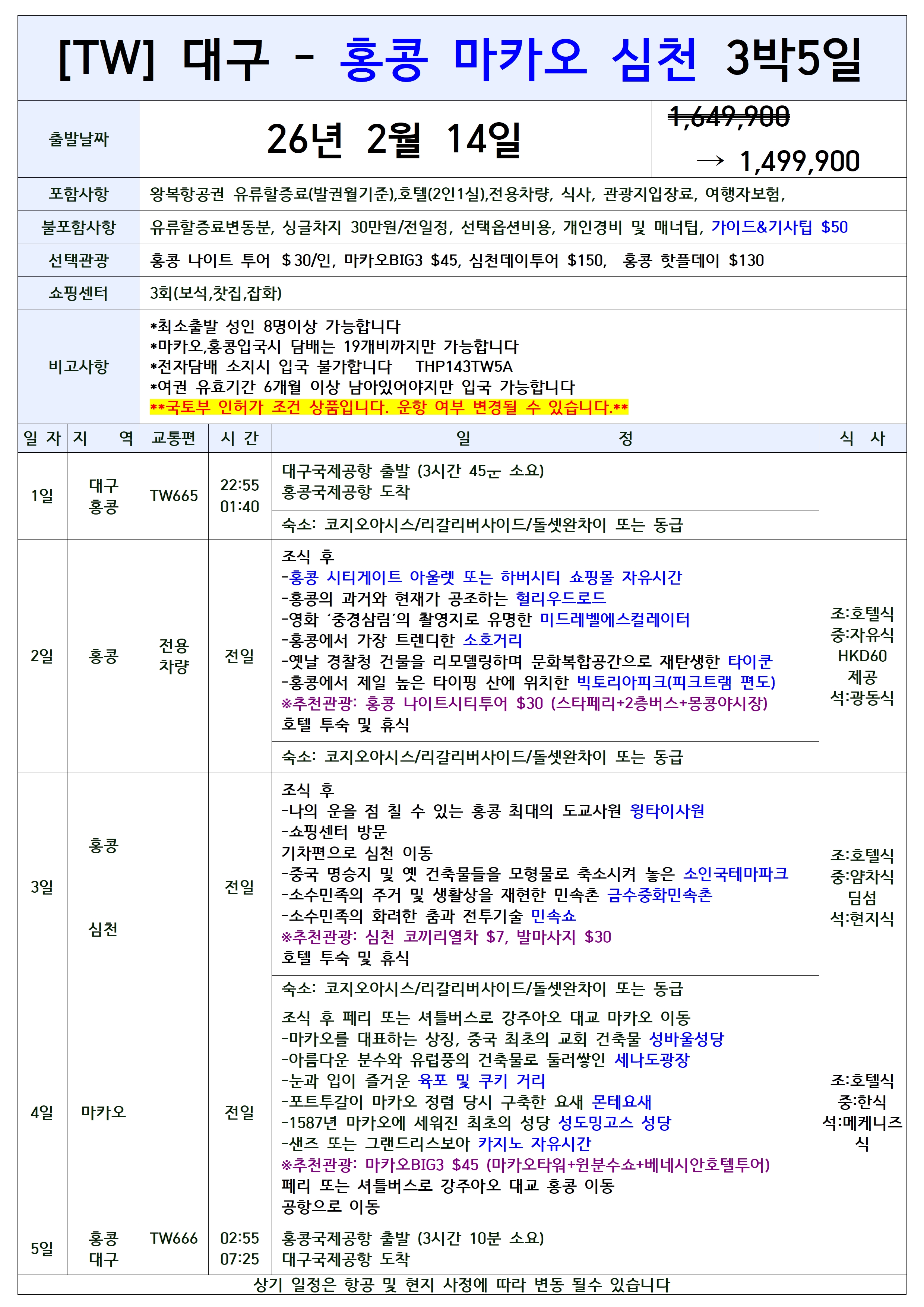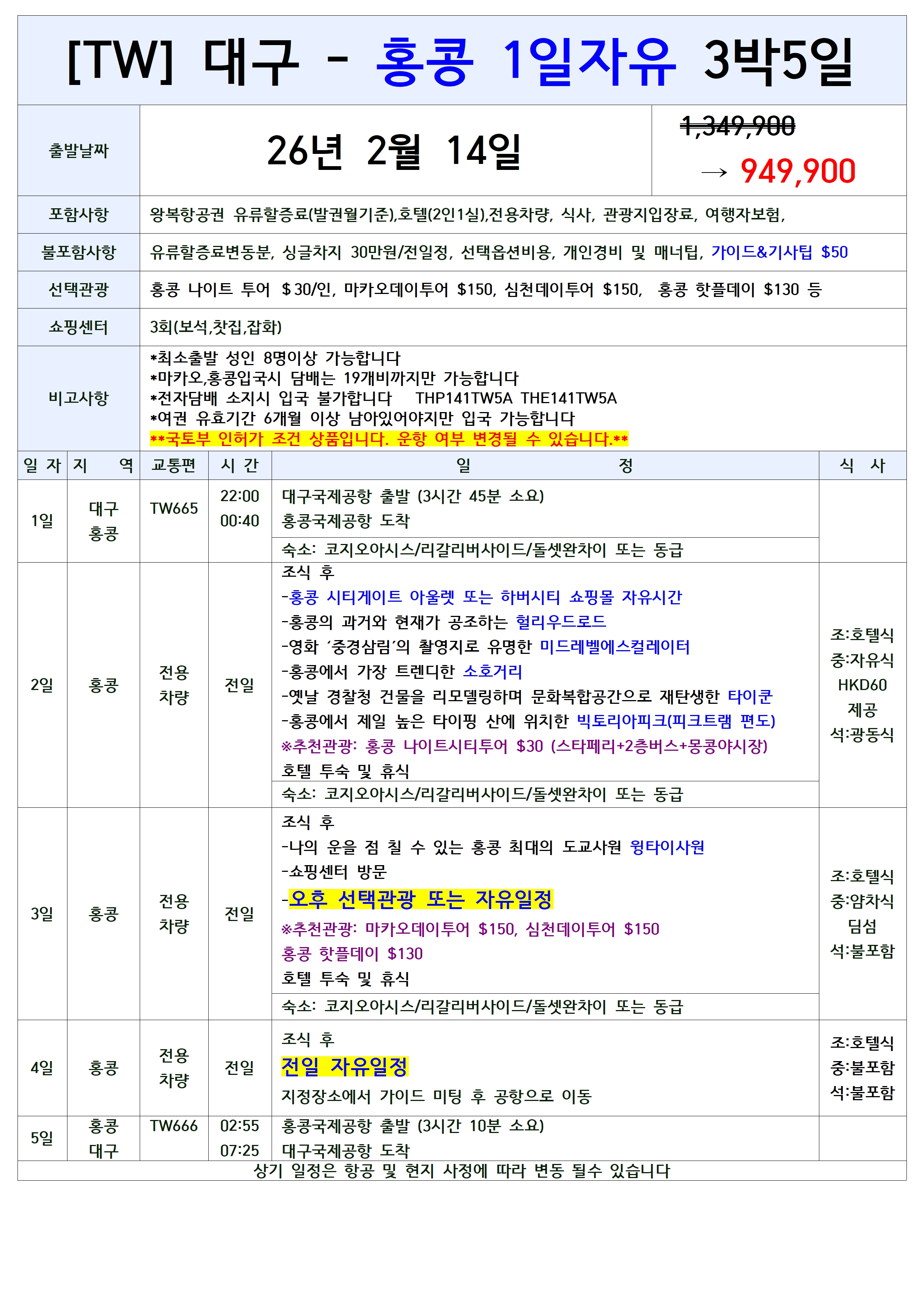 [2026년 설날연휴] 대구출발 홍콩/마카오/대만 패키지