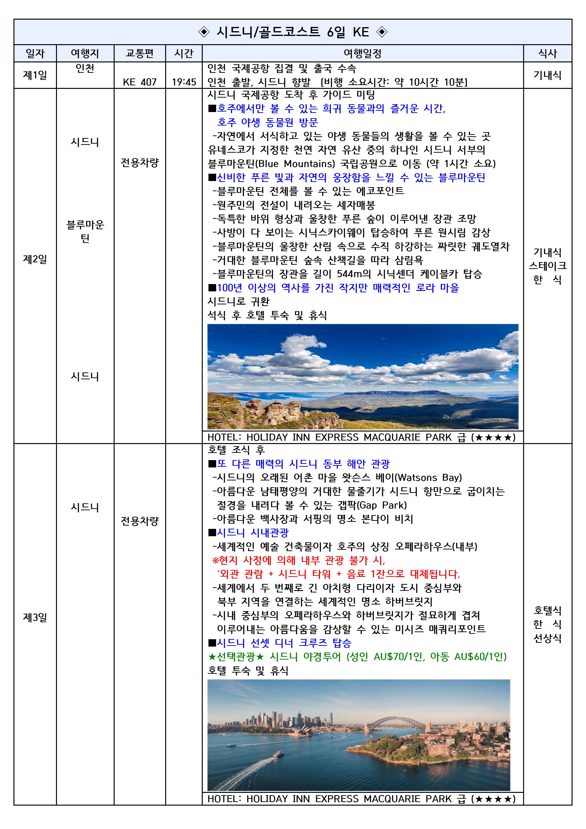 🐨시드니와 골드코스를 여행하는 품격 패키지 📍시드니 오페라하우스 / 하버브릿지 📍시드니 동물원 포함 📍블루마운틴 하이라이트 : 에코포인트 포함 📍시드니 선셋 디너 크루즈 탑승 📍열대과일 농장 체험 “트로피칼 후르츠 월드” 📍골드코스트 주변 명소 관광 📍산 속에 예쁜 예술인 마을 탬보린 마운틴 📍자연 그대로의 신비로운 동물, 시다크릭 반딧불 동굴 📍세계에서 가장 높은 주거 아파트인 스카이 포인트 전망대